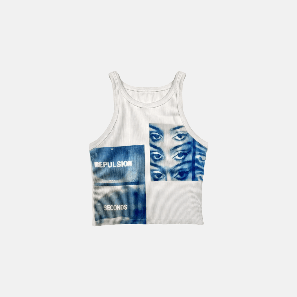 Regata de alças médias, com estampa gráfica frontal em azul sobre fundo branco. Tecido canelado com caimento ajustado ao corpo. Acabamento reforçado nas costuras e estampa em alta definição.