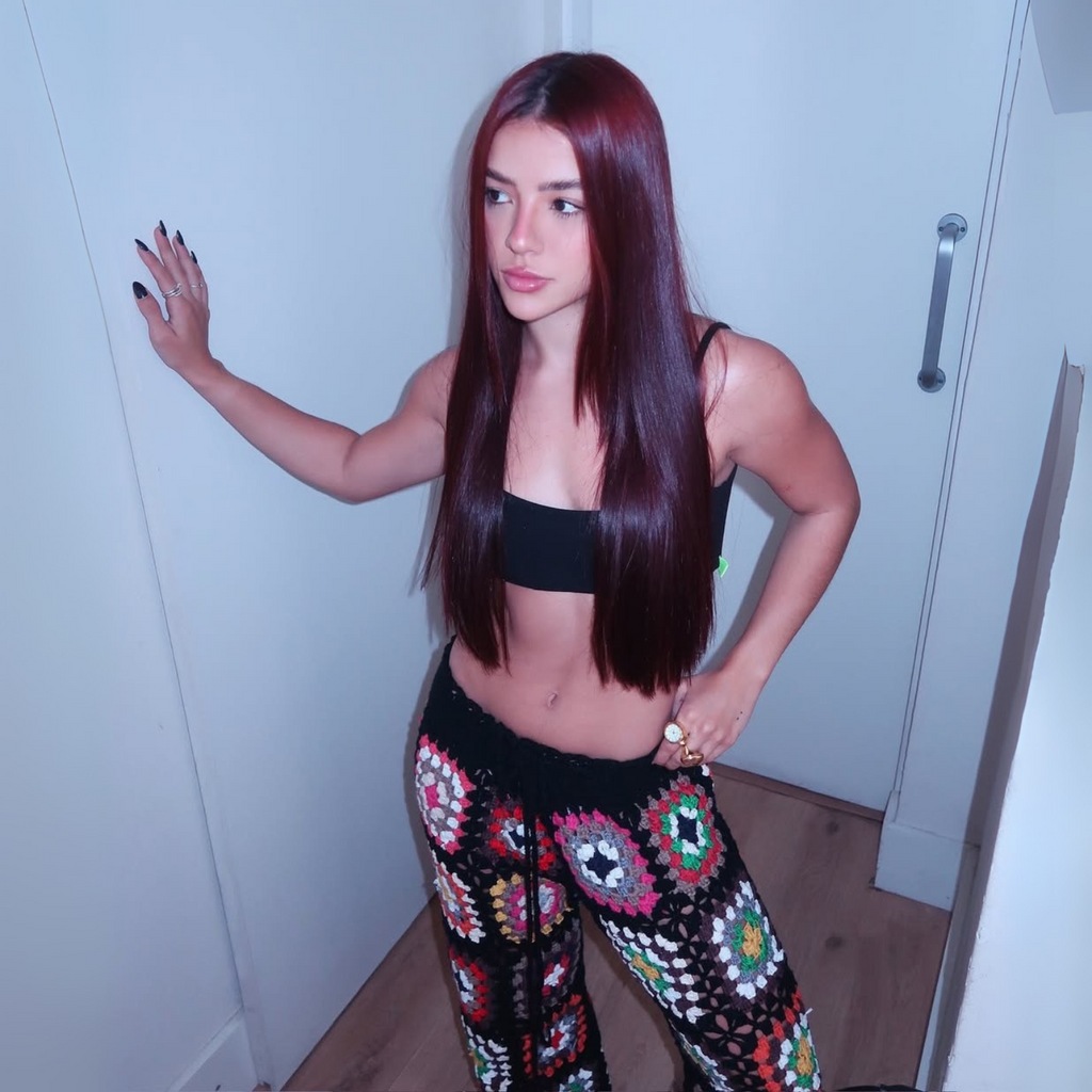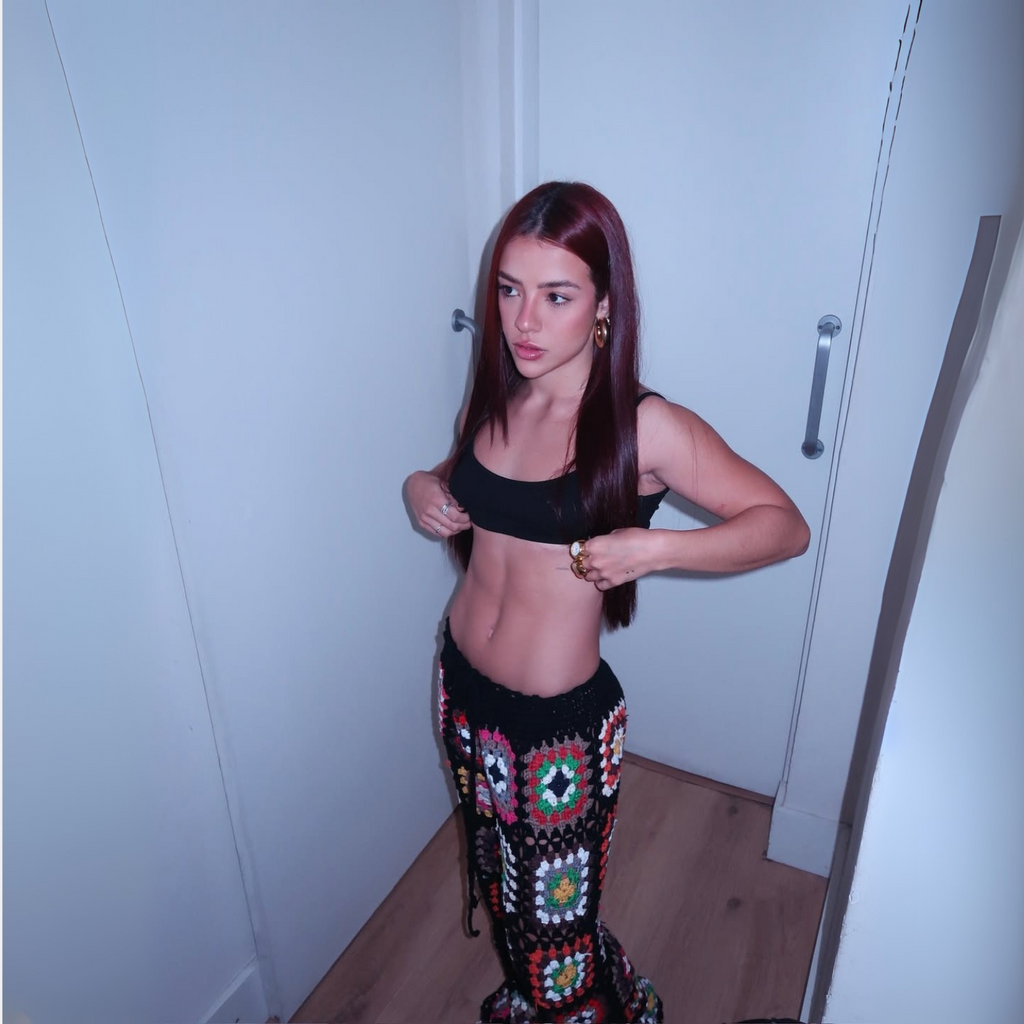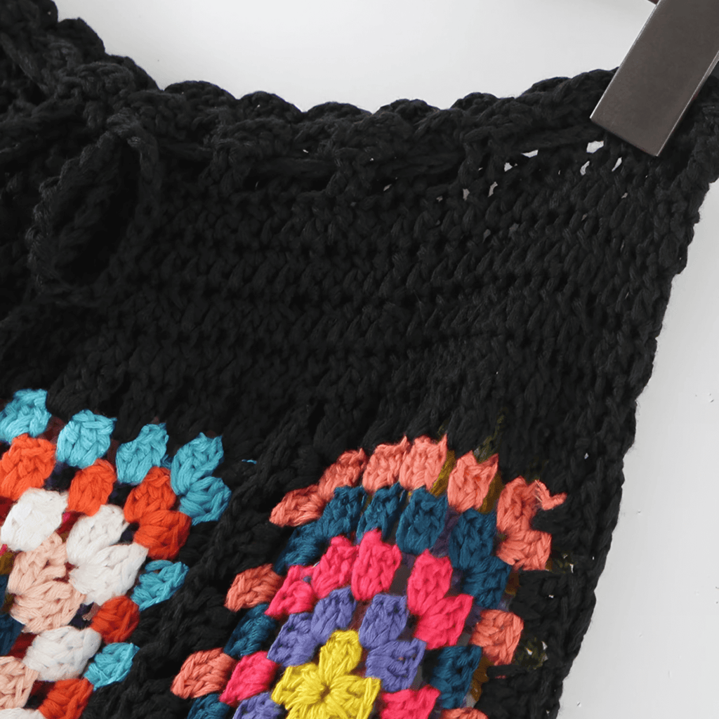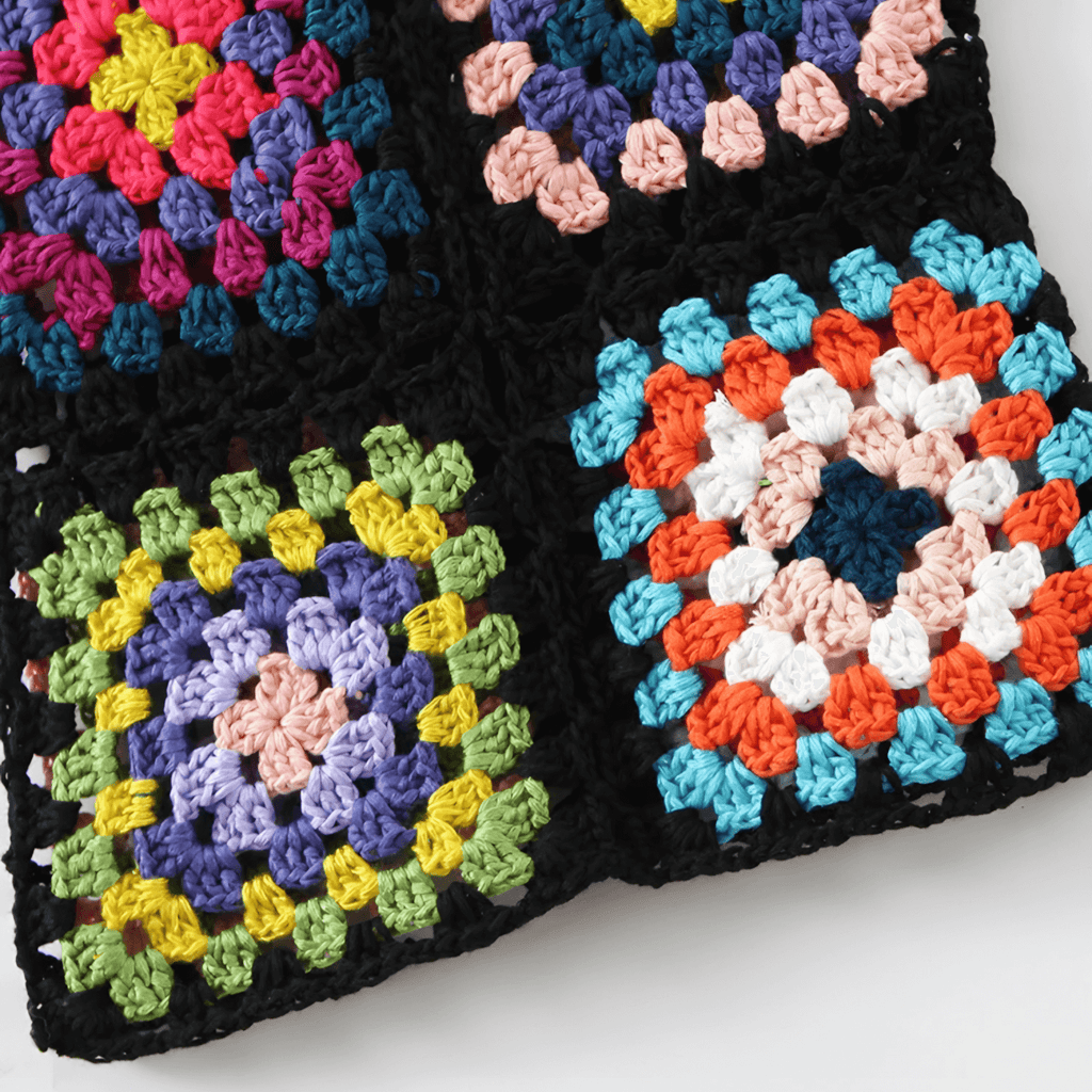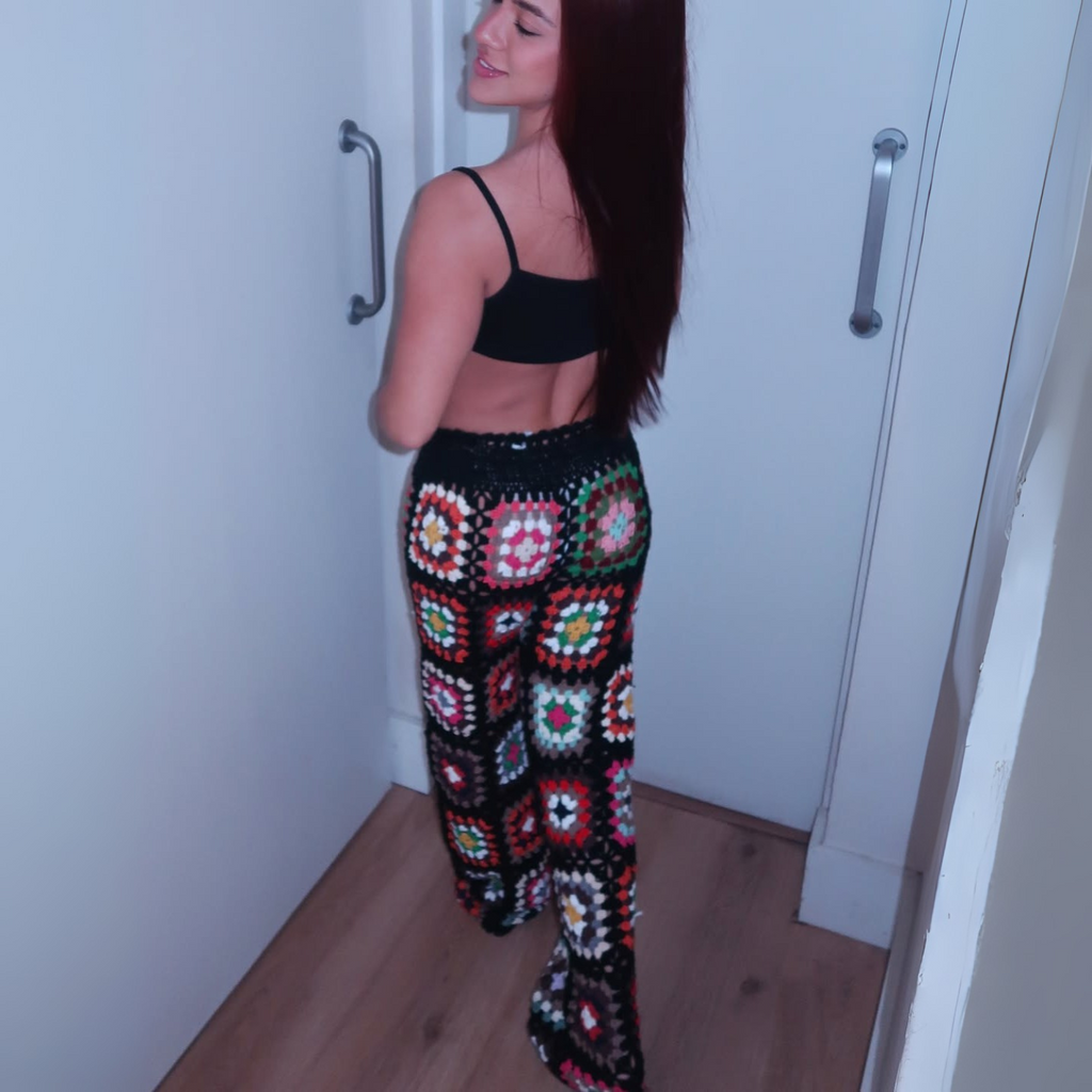 Calça de crochê com padrão colorido em quadrados. Cintura ajustável com cordão. Estrutura vazada e corte reto.