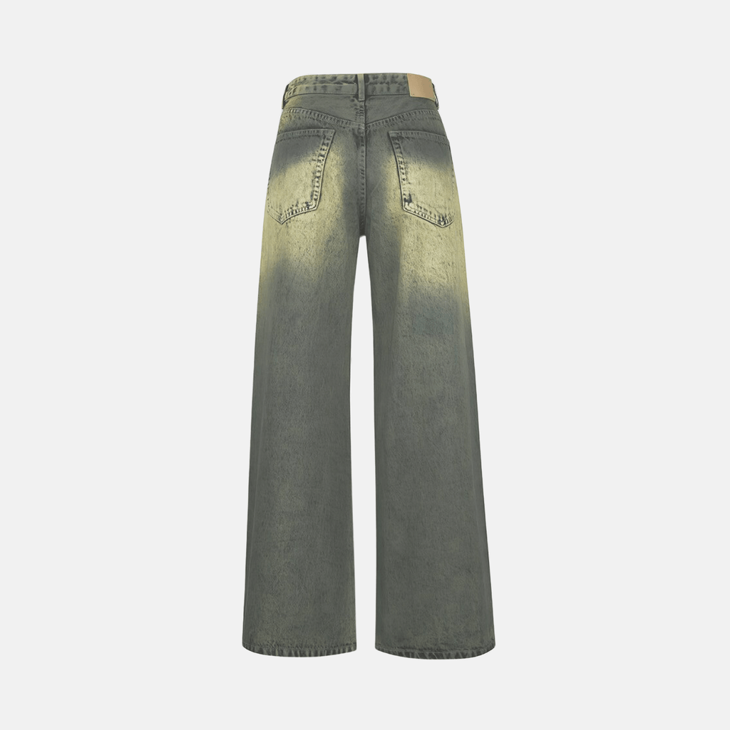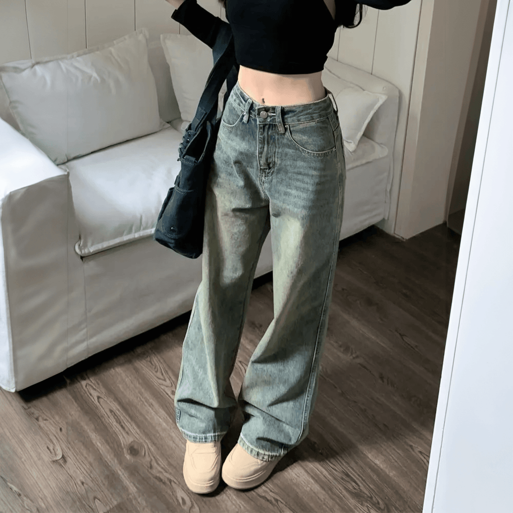 Calça jeans de cintura alta com lavagem desgastada. Modelagem ampla com corte reto. Bolsos frontais e traseiros funcionais. Fechamento frontal por zíper e botão metálico.