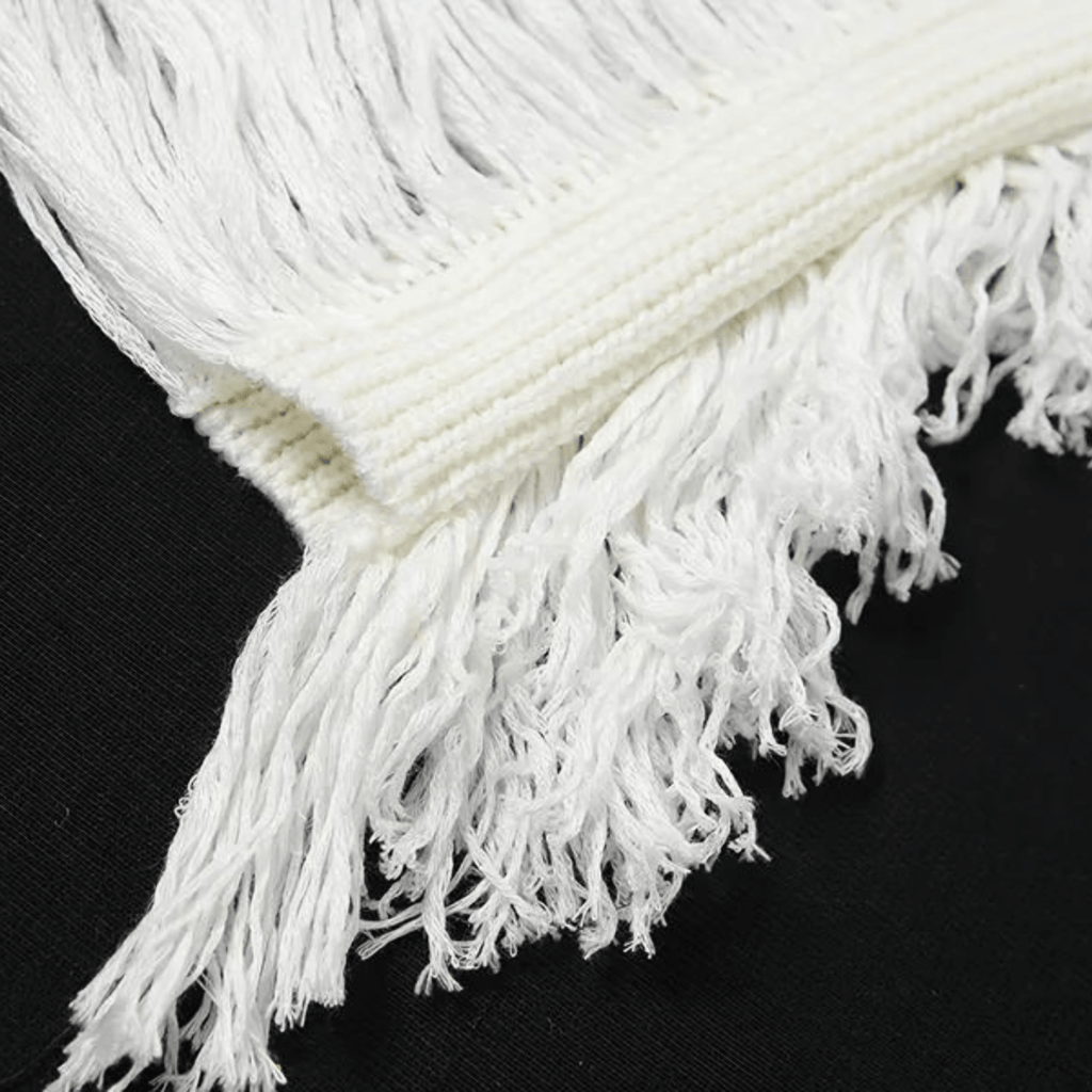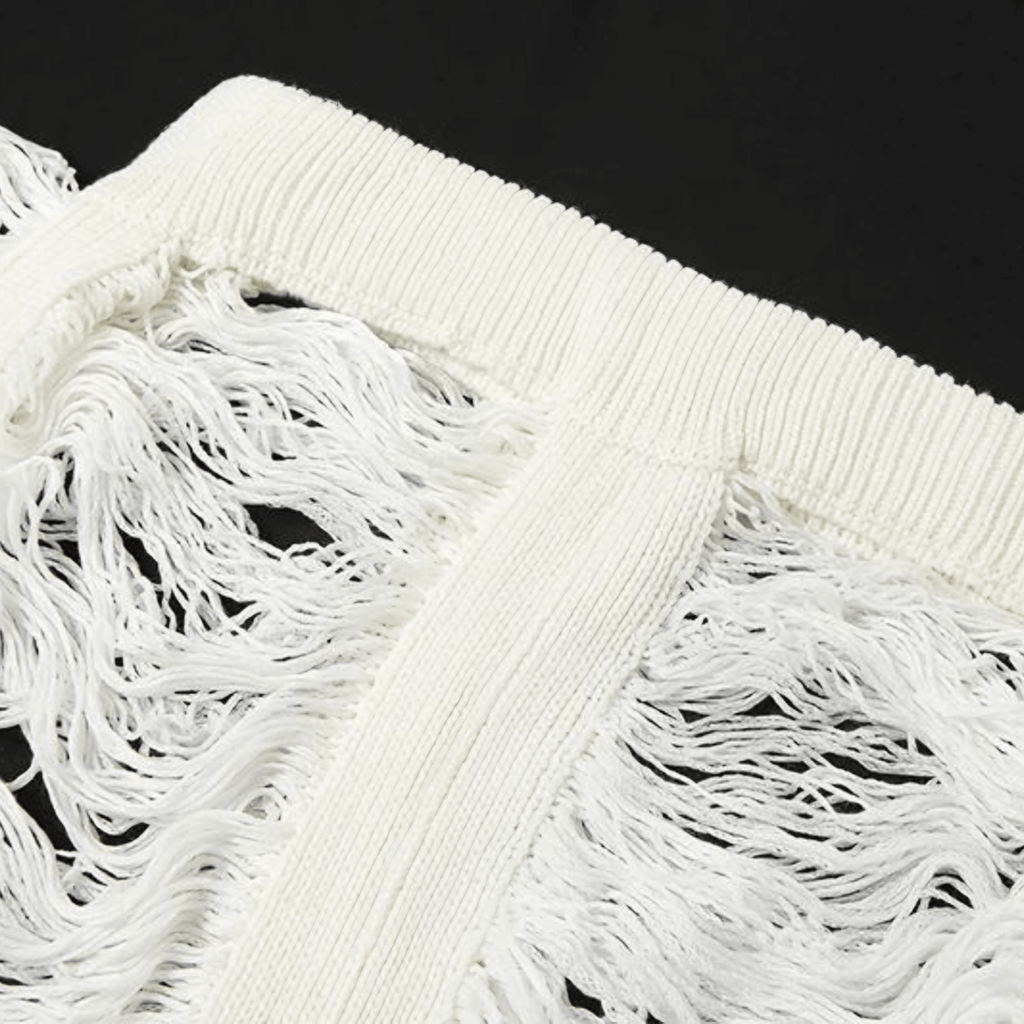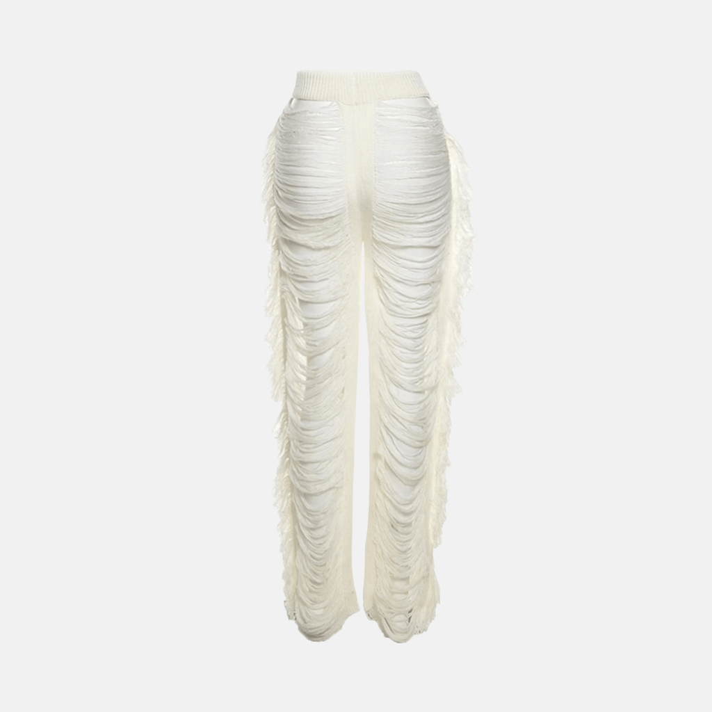 Calça de malha com efeito rasgado e cintura alta. Design de pernas largas e acabamento com franja lateral. Elástico na cintura para ajuste confortável.