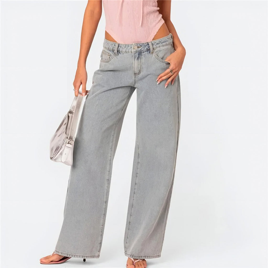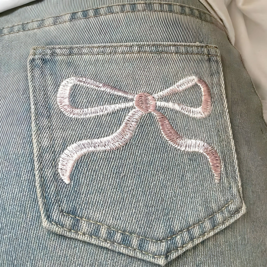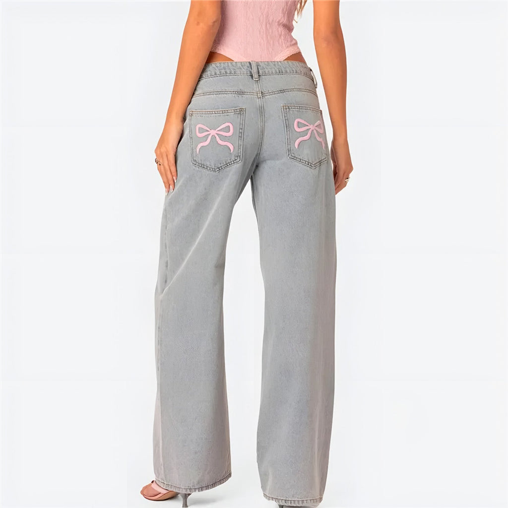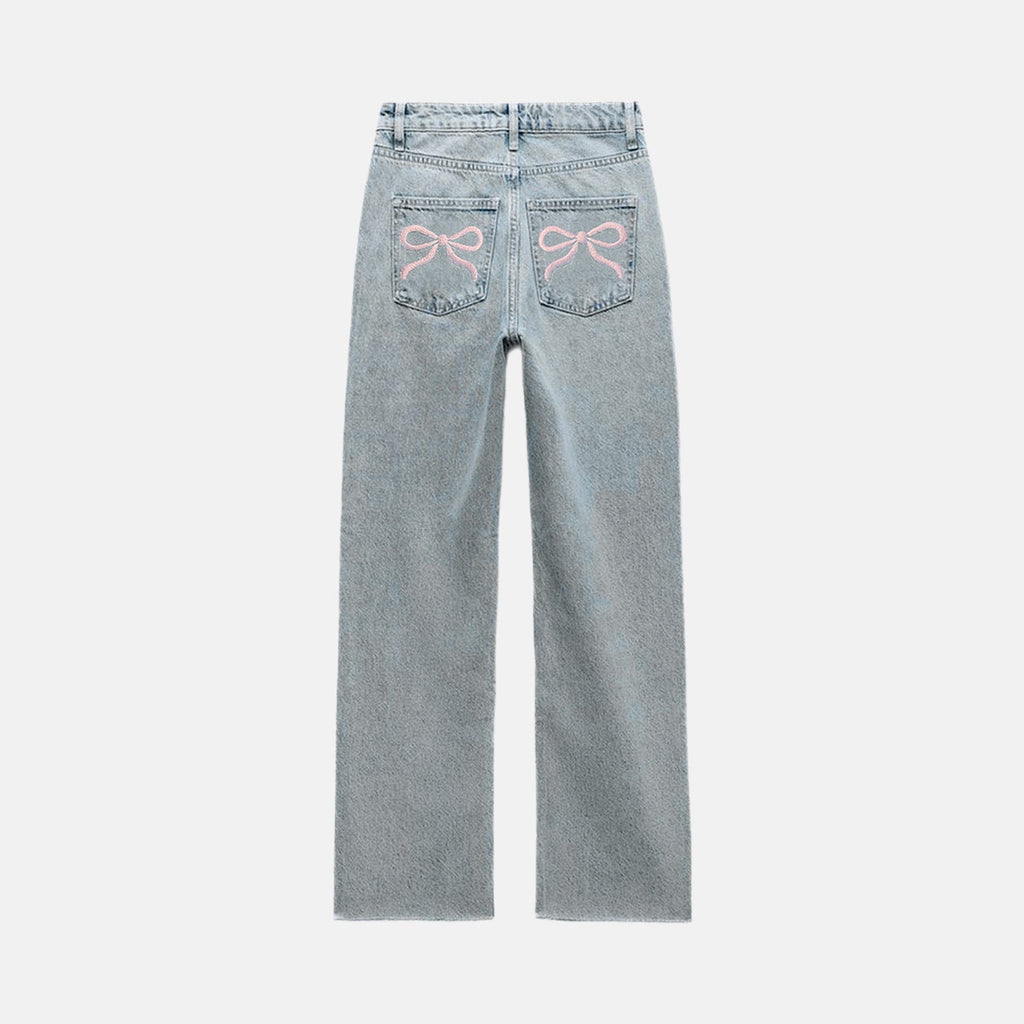 Calça reta de cintura alta em jeans lavado azul-claro. Bolsos traseiros com bordado em forma de laço rosa. Fecho frontal com zíper e botão metálico. Acabamento pespontado.