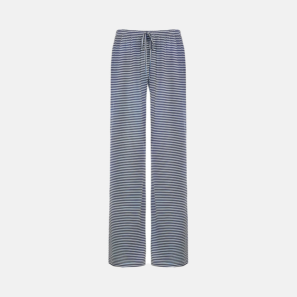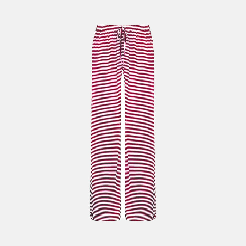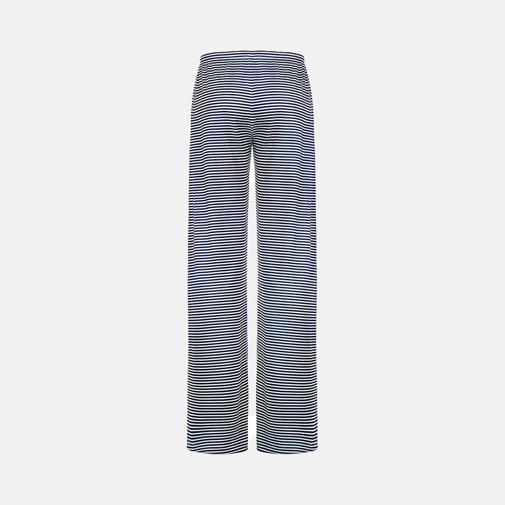 Calça reta de cintura média com estampa de listras finas. Cós com elástico embutido e amarração ajustável. Modelagem solta e confortável. Acabamento com costura dupla nas extremidades.