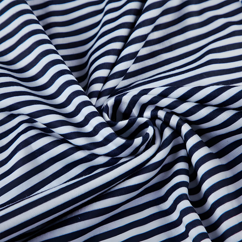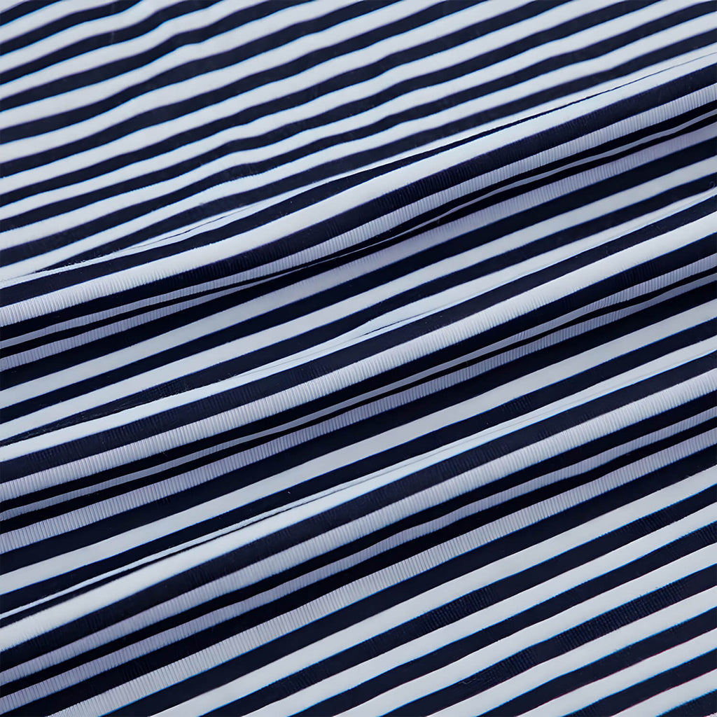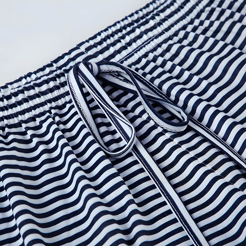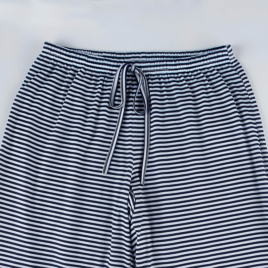 Calça reta de cintura média com estampa de listras finas. Cós com elástico embutido e amarração ajustável. Modelagem solta e confortável. Acabamento com costura dupla nas extremidades.