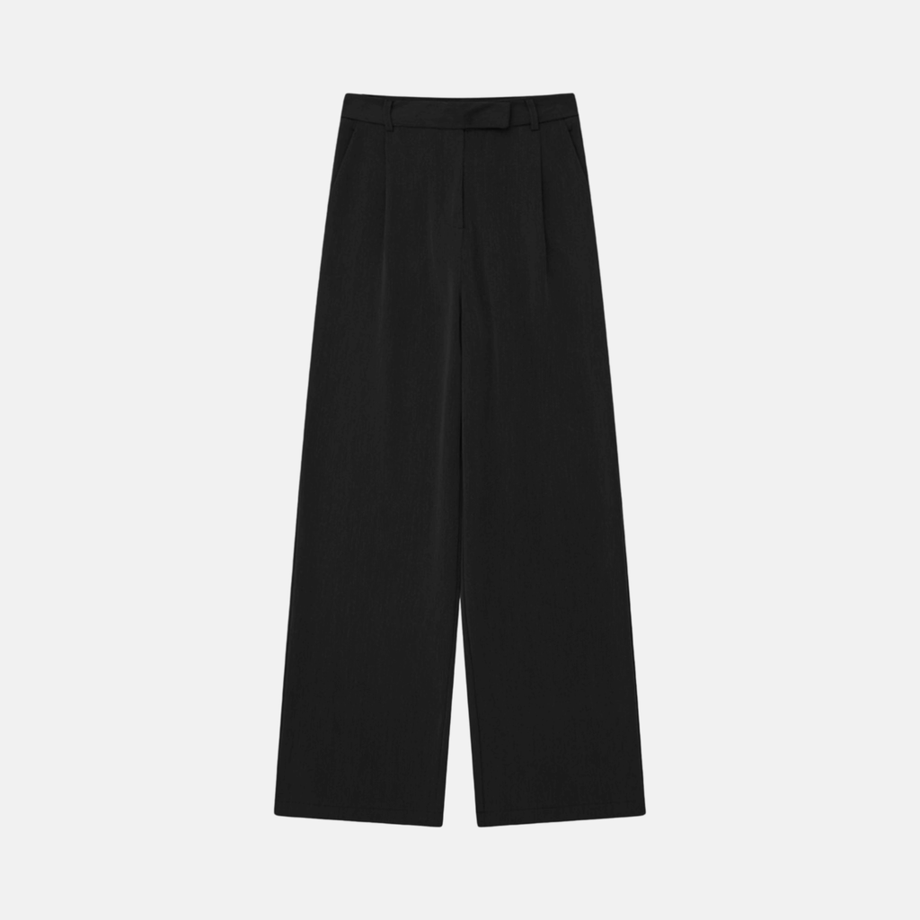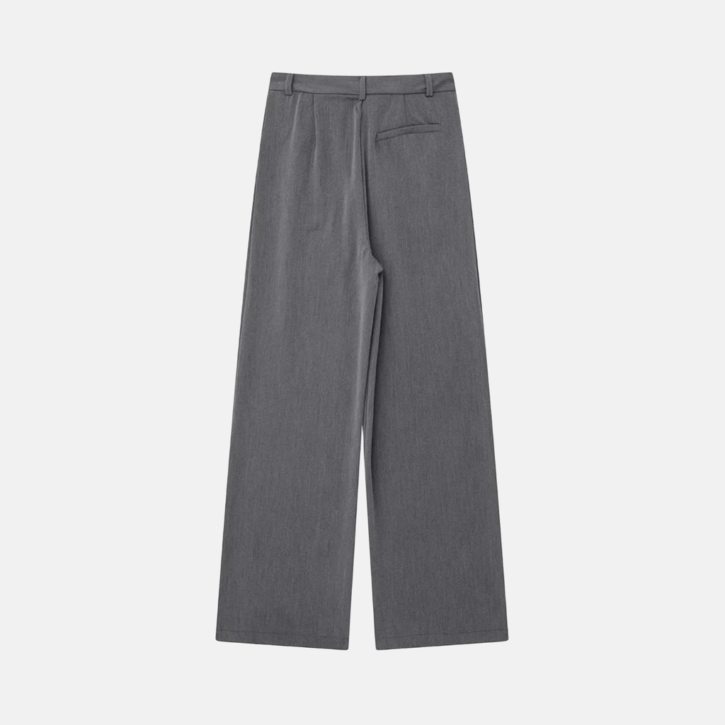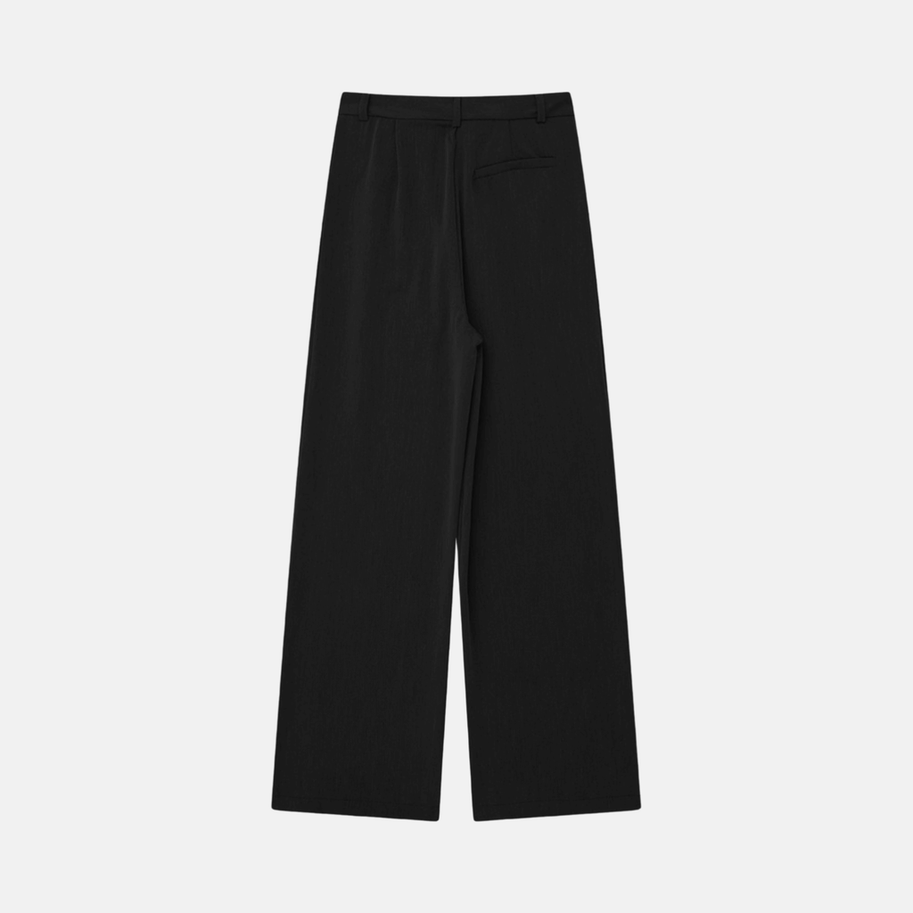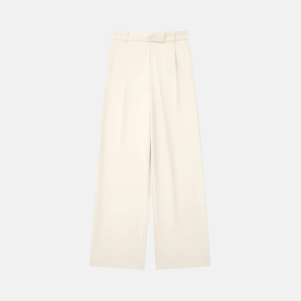Calça de alfaiataria com modelagem reta e cintura alta. Bolsos laterais e traseiros embutidos. Fecho frontal com zíper oculto e botão.