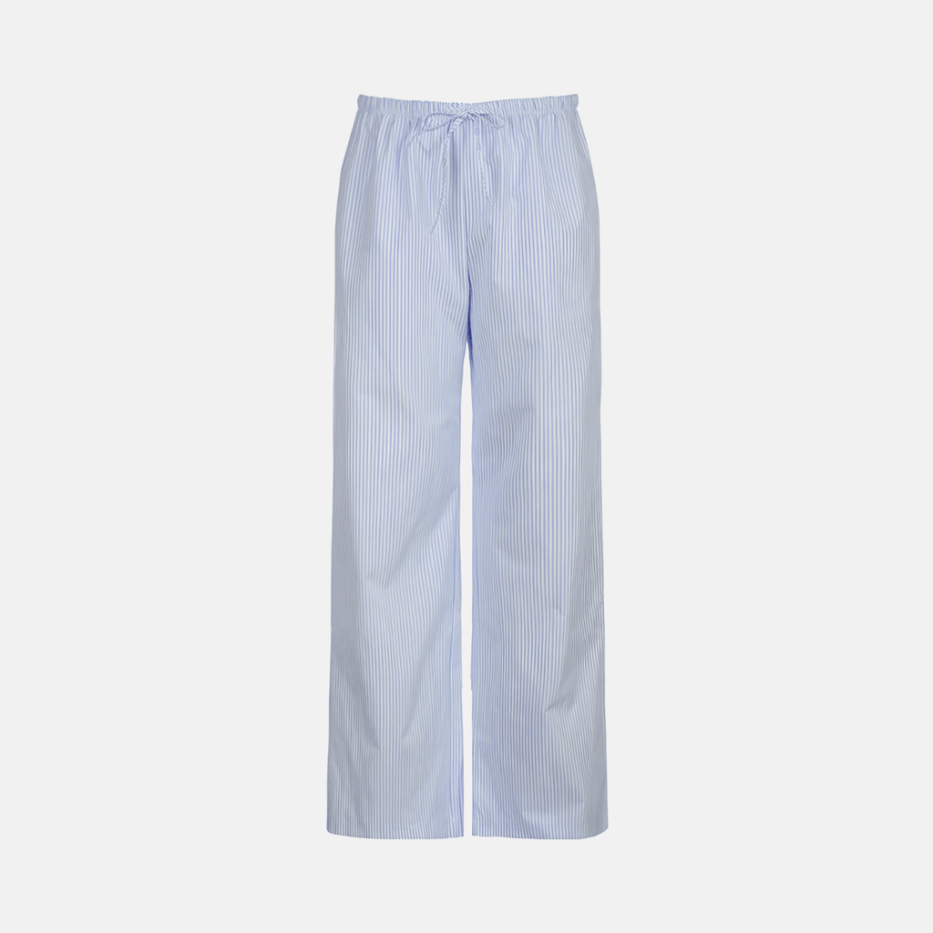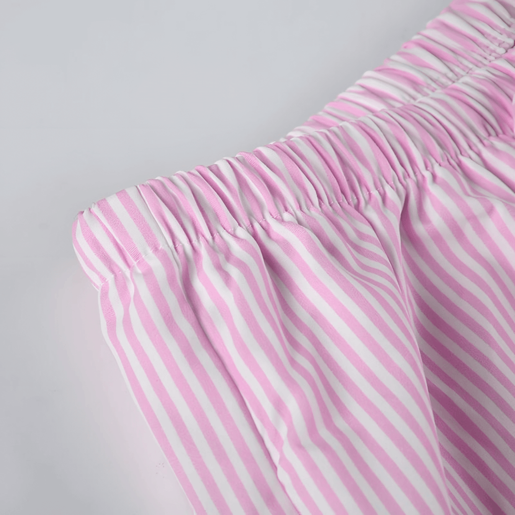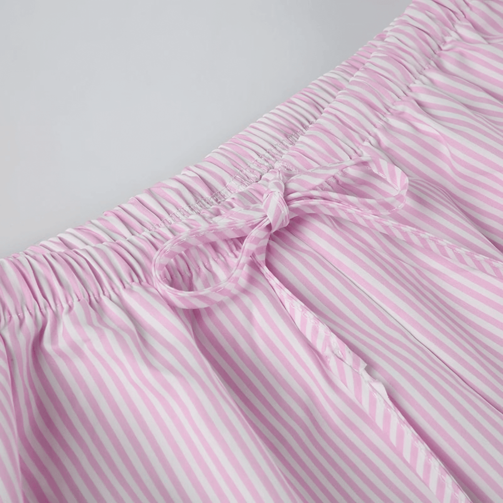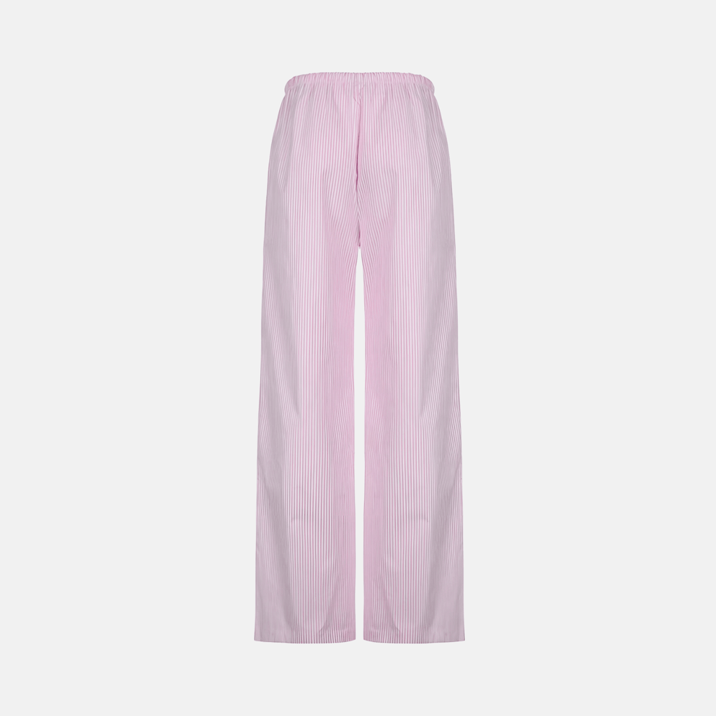 Calça de cintura alta com ajuste solto e elástico. Detalhe de amarração frontal. Estampa de listras finas em tons pastel. Tecido leve e confortável, ideal para composições casuais.