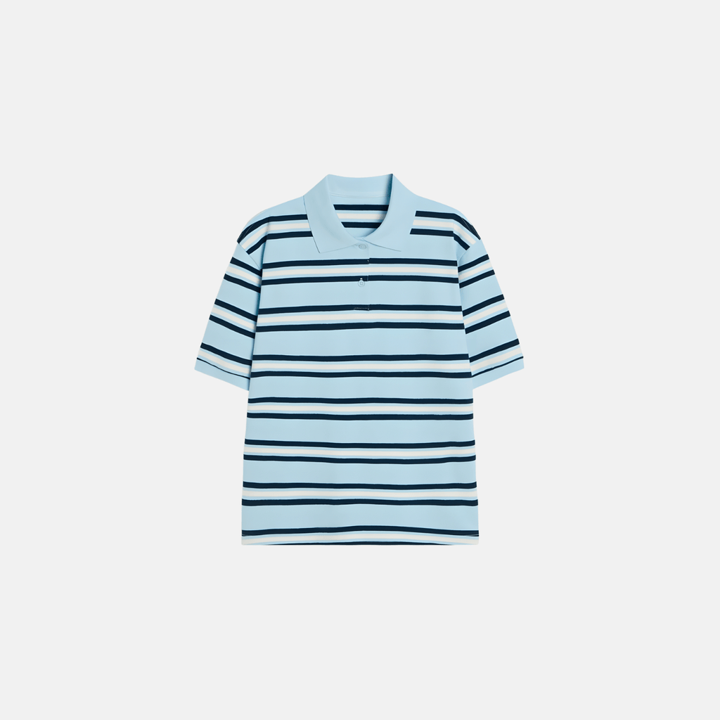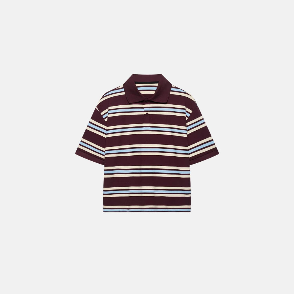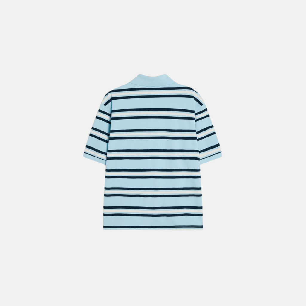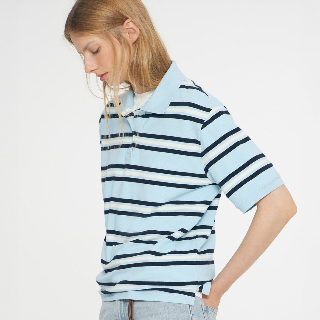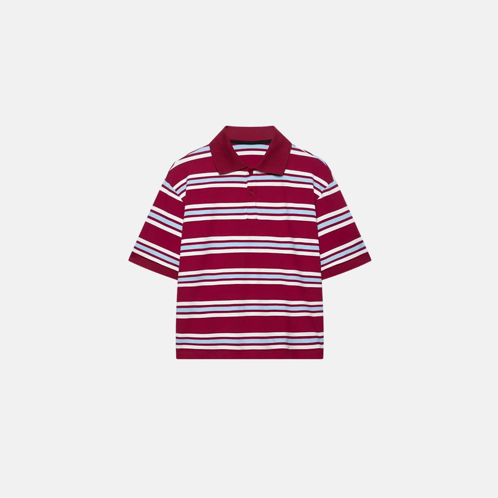 Camisa polo oversized com mangas curtas e estampa listrada. Gola tradicional com abertura em botões. Acabamento canelado nas mangas e barra reta com caimento estruturado.