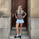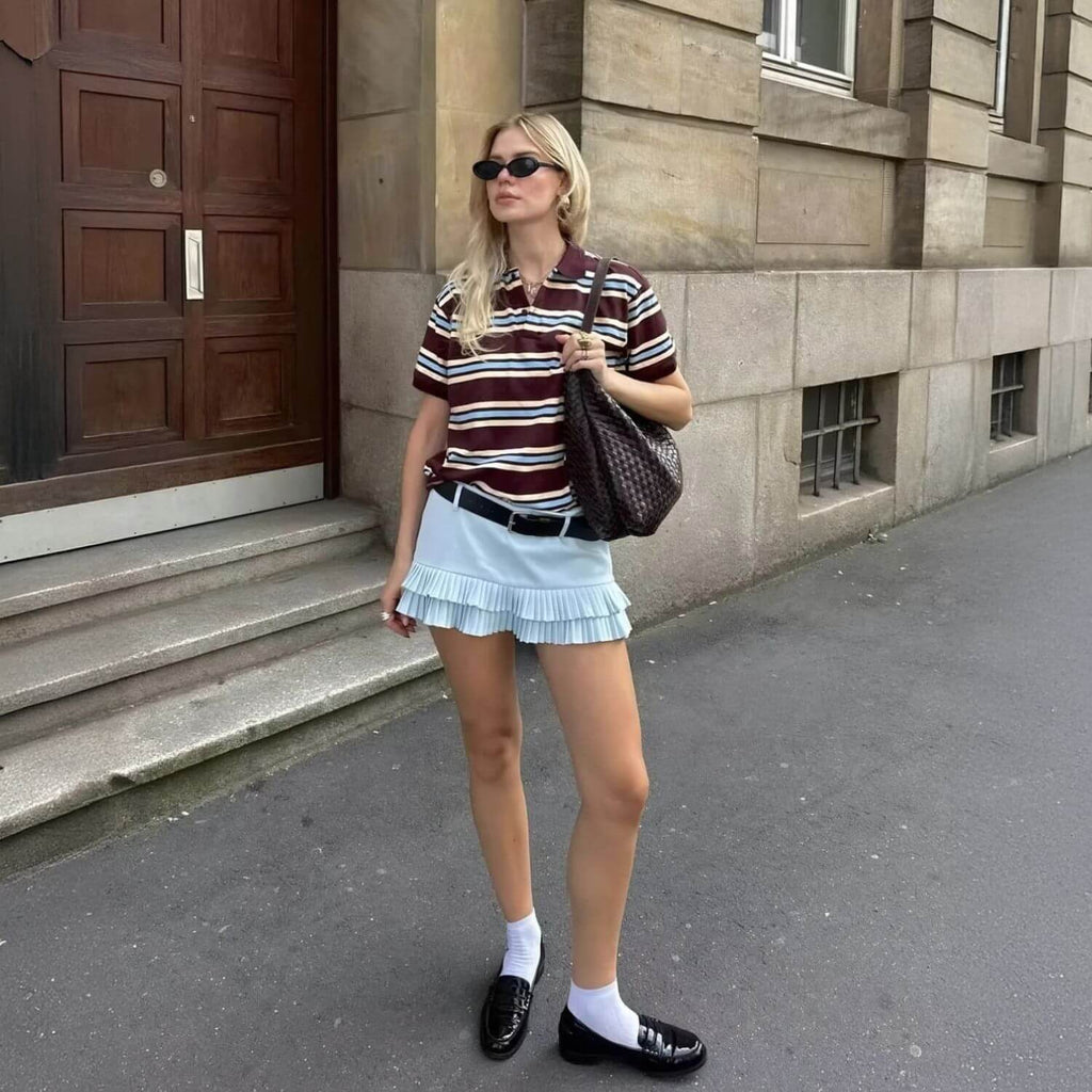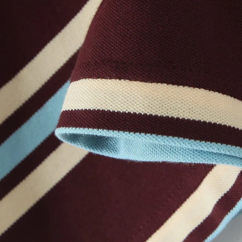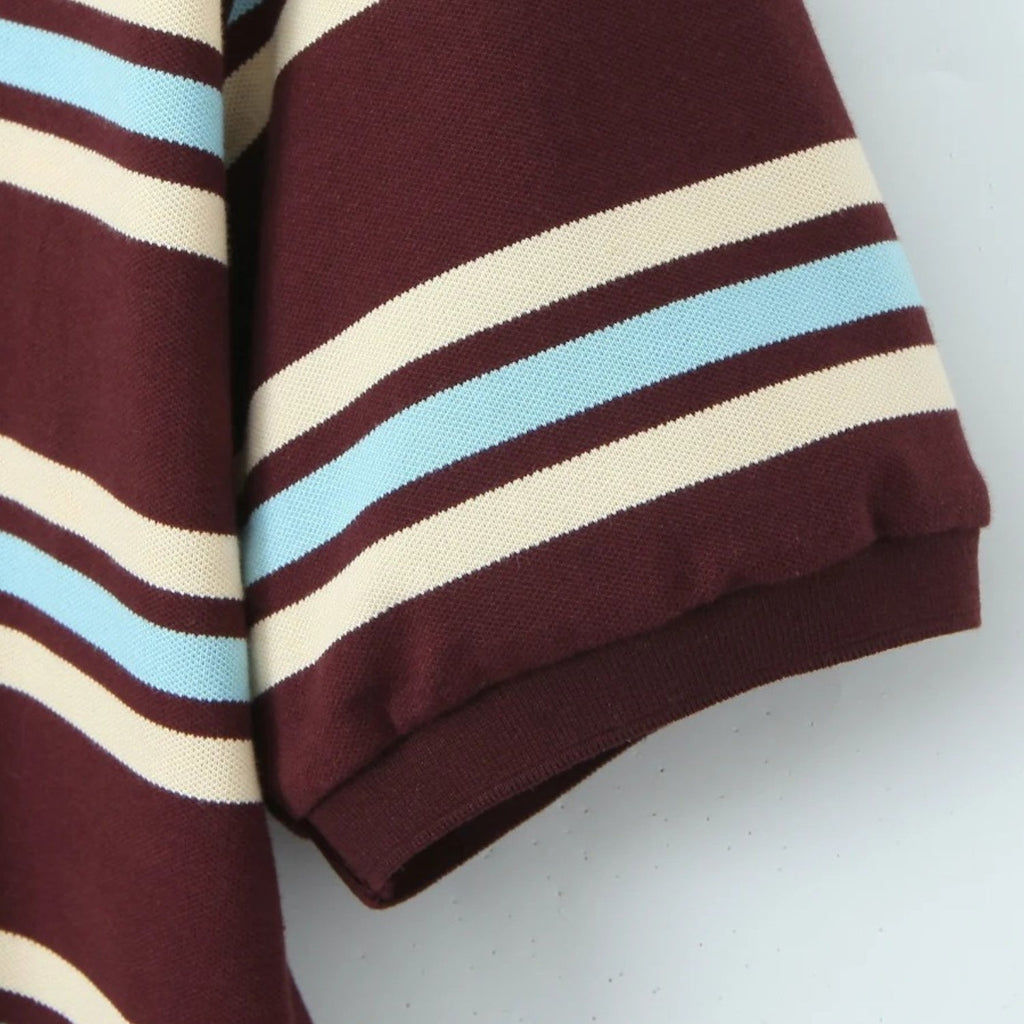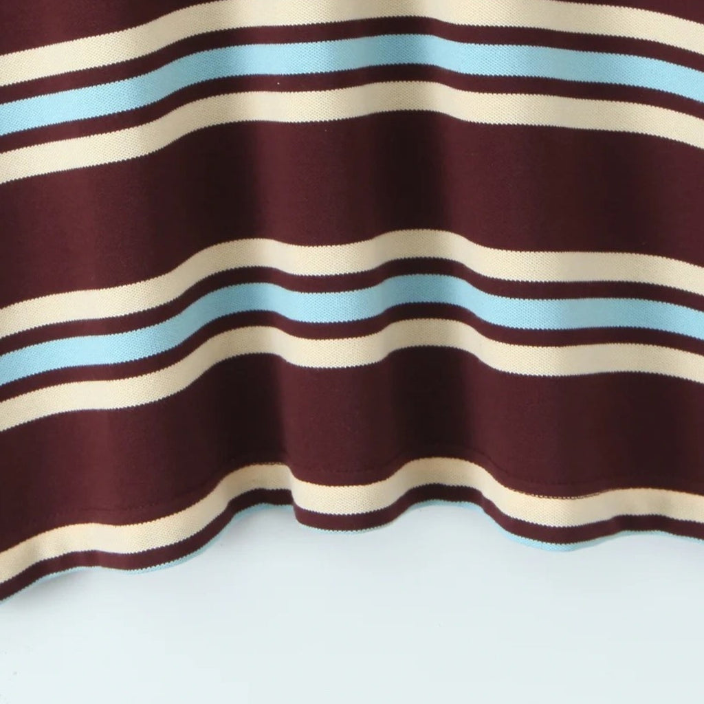 Camisa polo oversized com mangas curtas e estampa listrada. Gola tradicional com abertura em botões. Acabamento canelado nas mangas e barra reta com caimento estruturado.