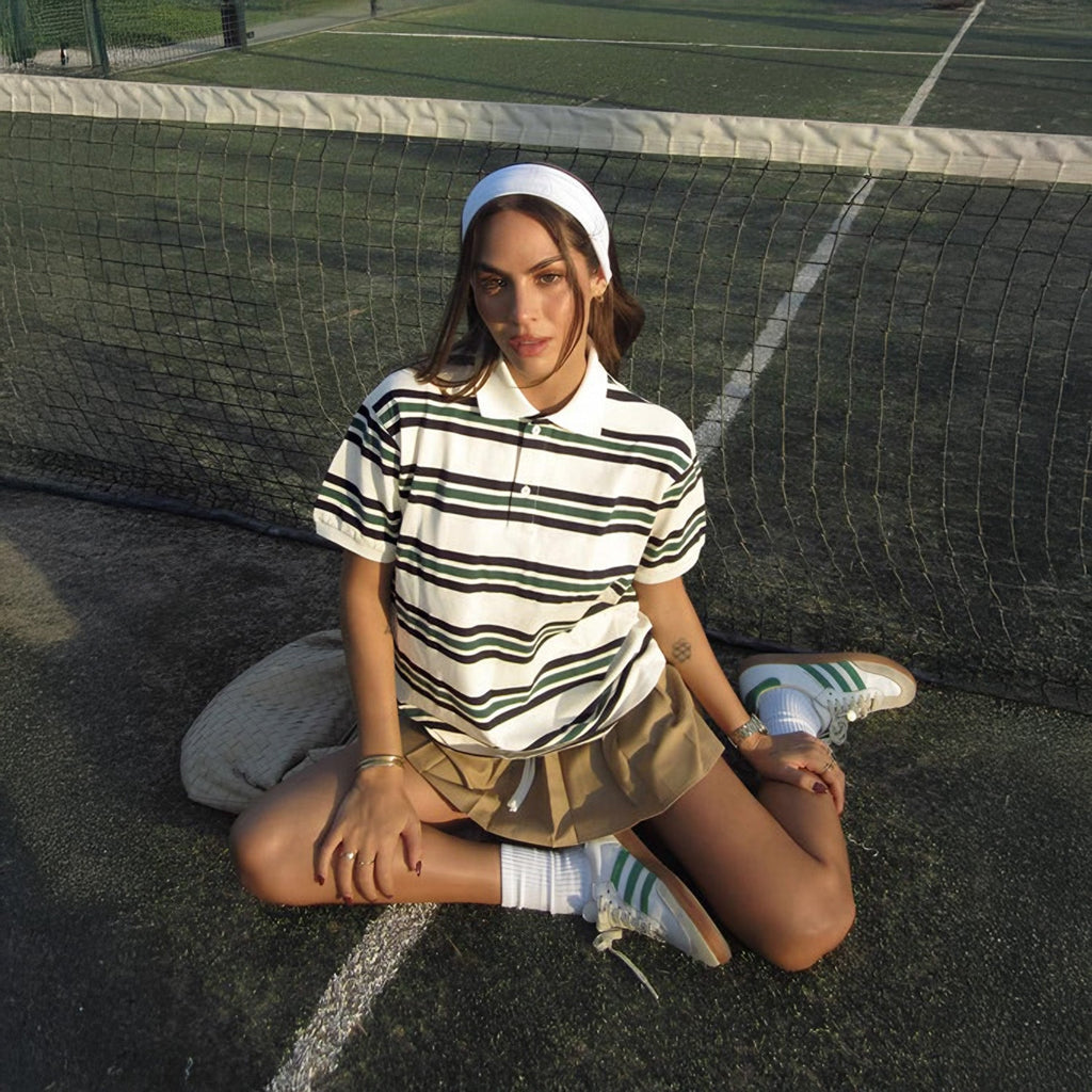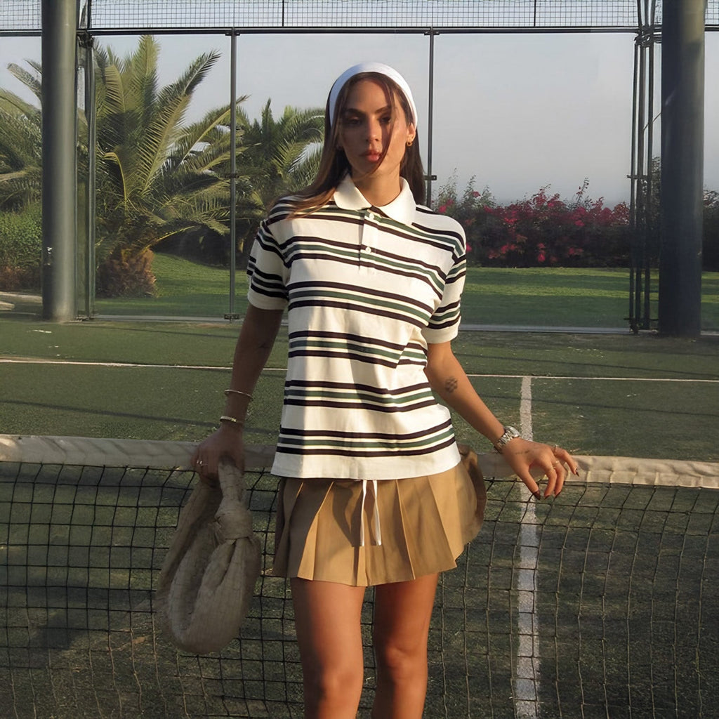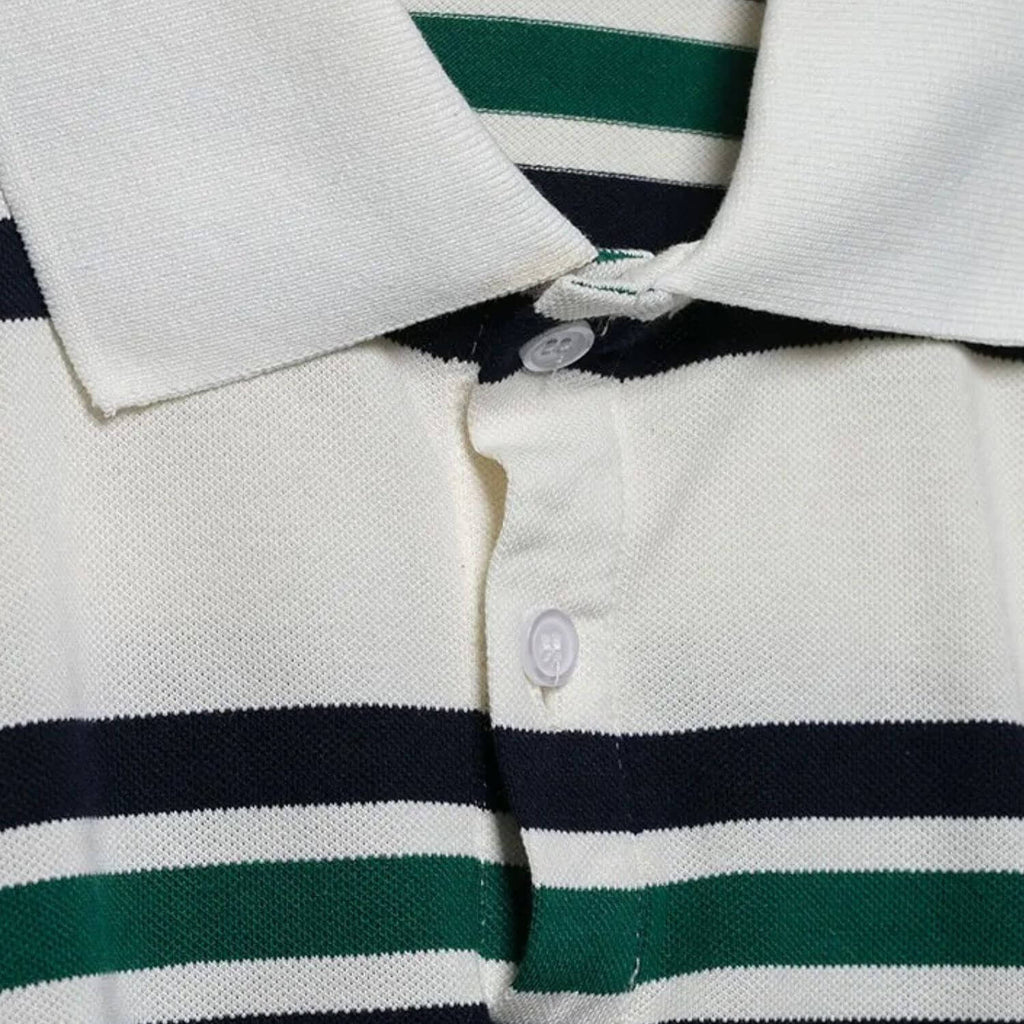 Camisa polo oversized com mangas curtas e estampa listrada. Gola tradicional com abertura em botões. Acabamento canelado nas mangas e barra reta..