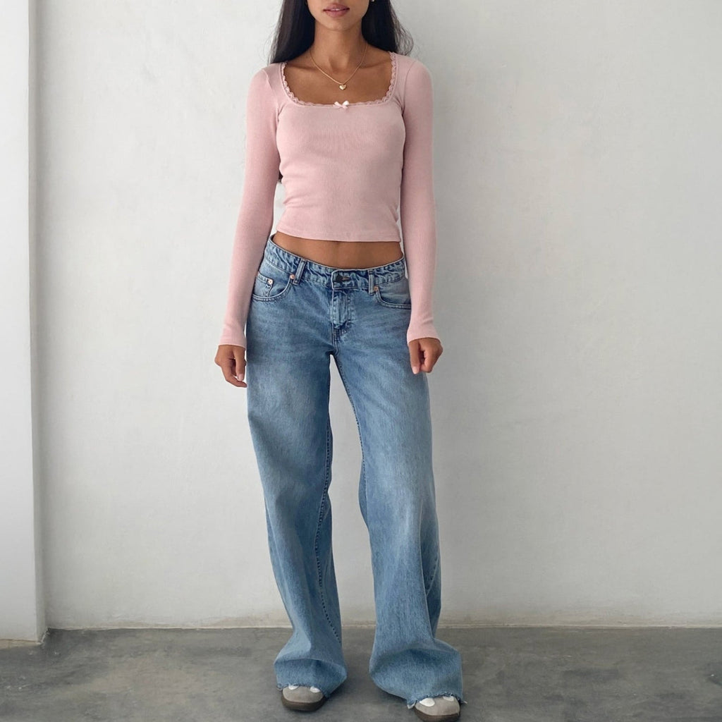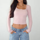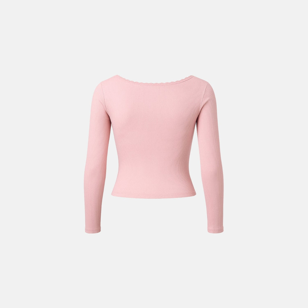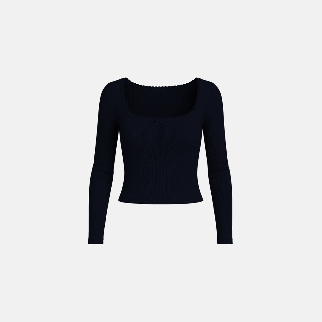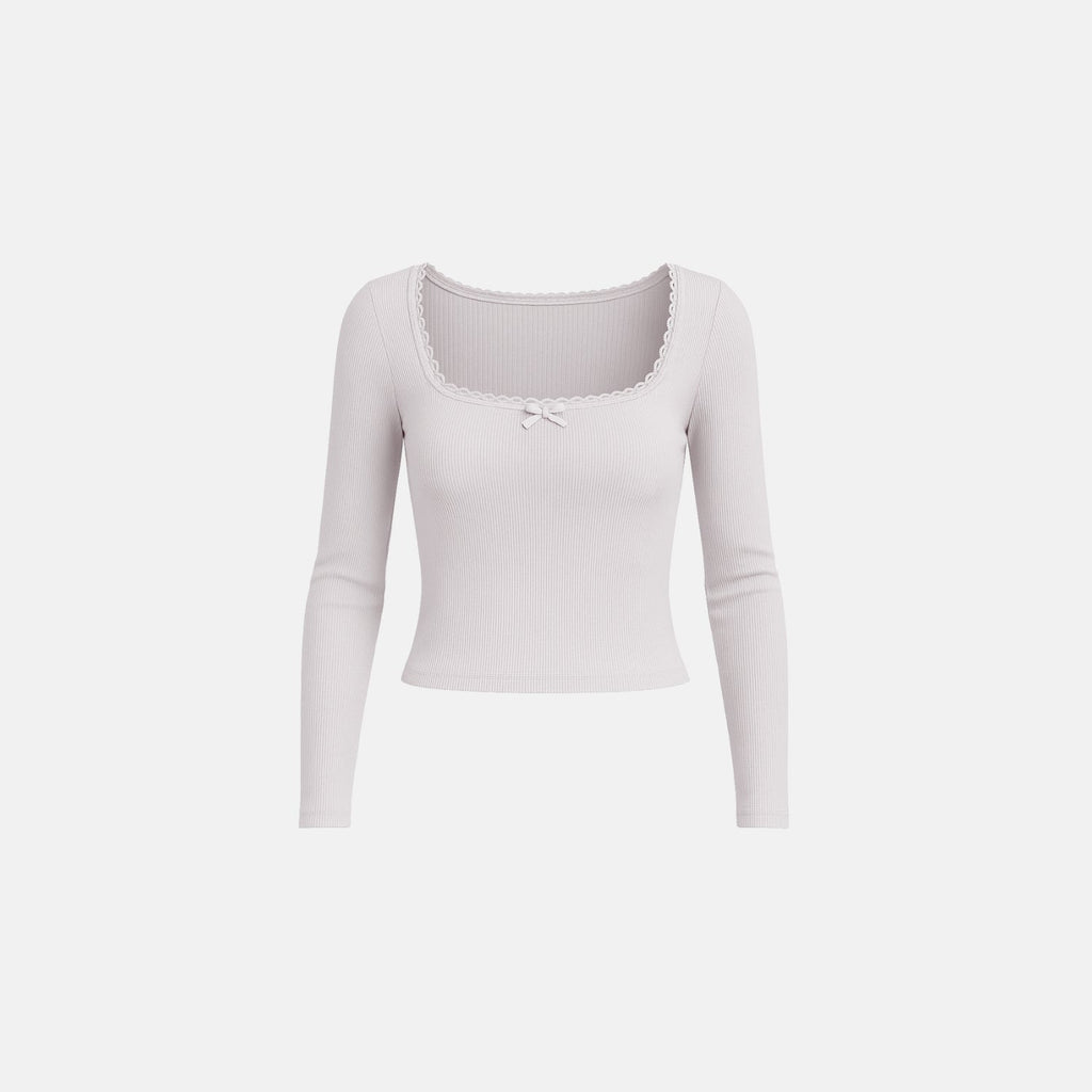 Camiseta justo de malha canelada com mangas longas. Decote quadrado com acabamento em renda delicada e laço decorativo central. Modelagem cropped com toque macio e elástico.