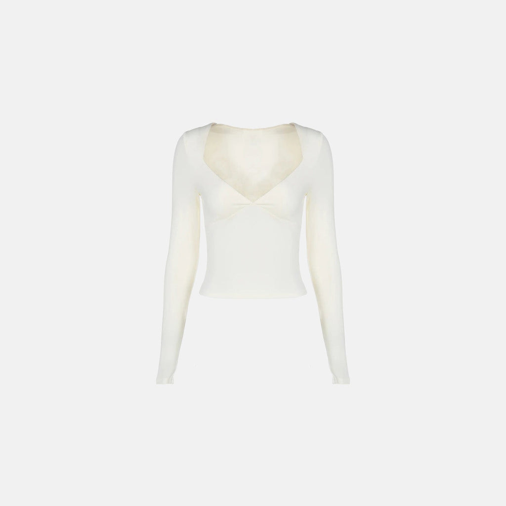 Camiseta de manga longa com decote profundo em formato de coração. Modelagem justa ao corpo. Recorte torcido frontal. Acabamento interno com costura reforçada e toque macio de segunda pele.