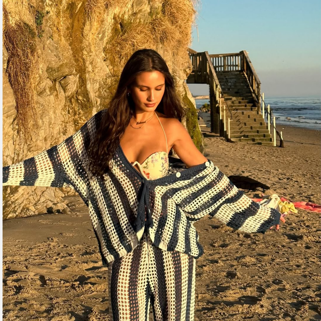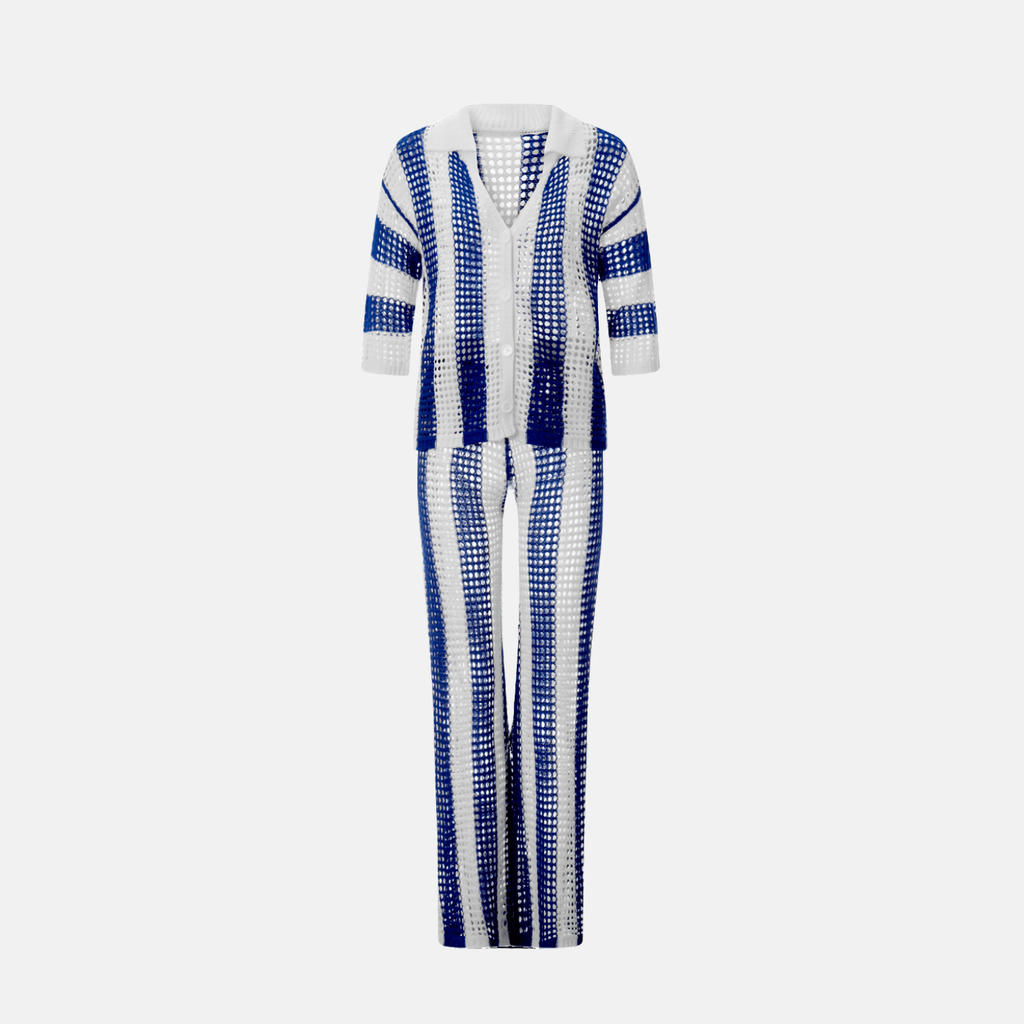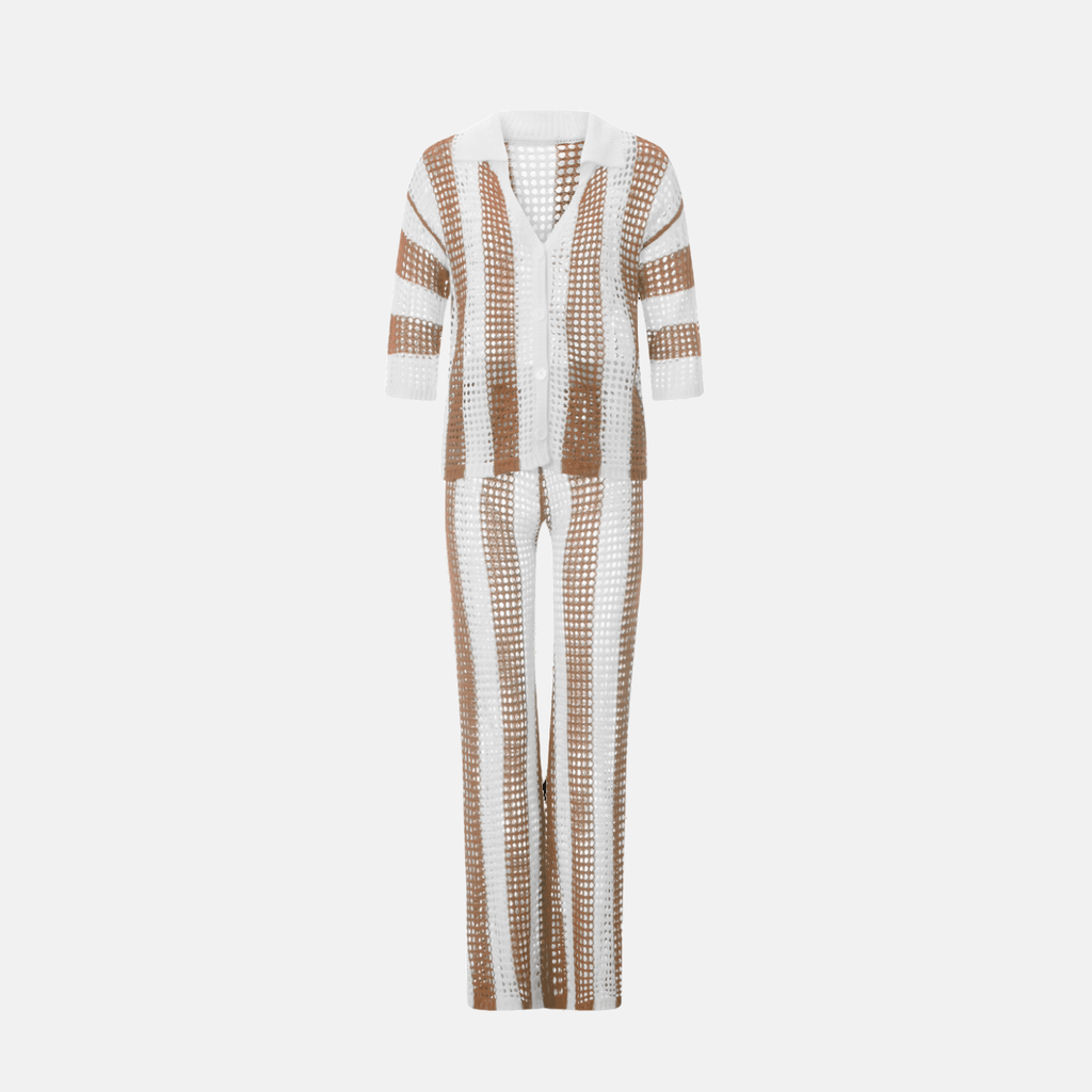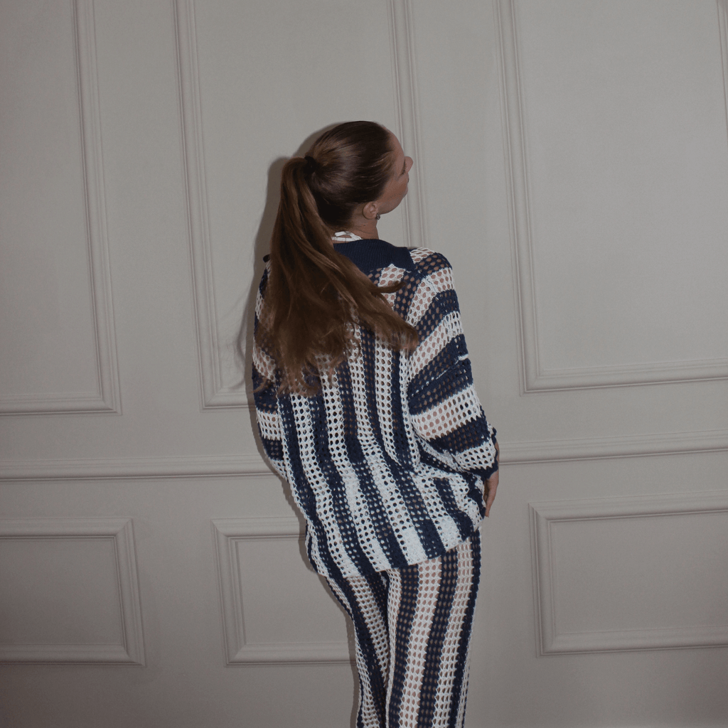 Conjunto com listras verticais em contraste. Cardigan de manga curta com caimento solto. Calça de cintura alta com caimento reto. Textura vazada em crochê.