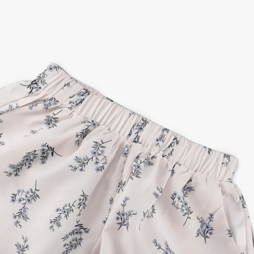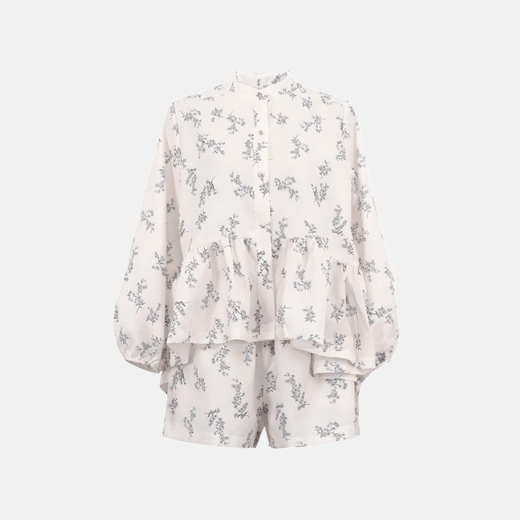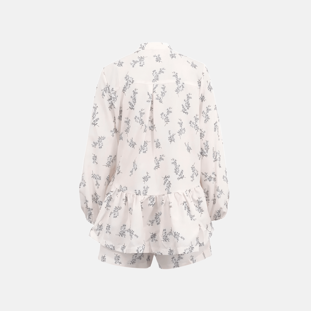 Blusa com mangas bufantes e punhos elásticos. Decote V com fechamento frontal em botões. Detalhe peplum em camadas. Short de cintura alta com elástico ajustável. Estampa floral delicada.