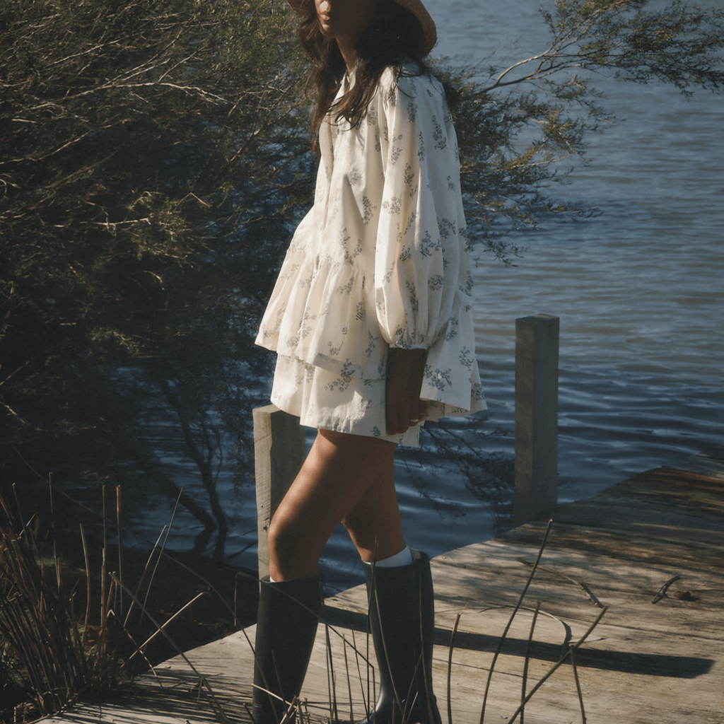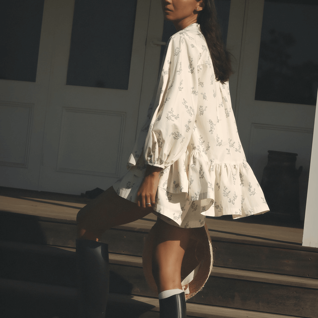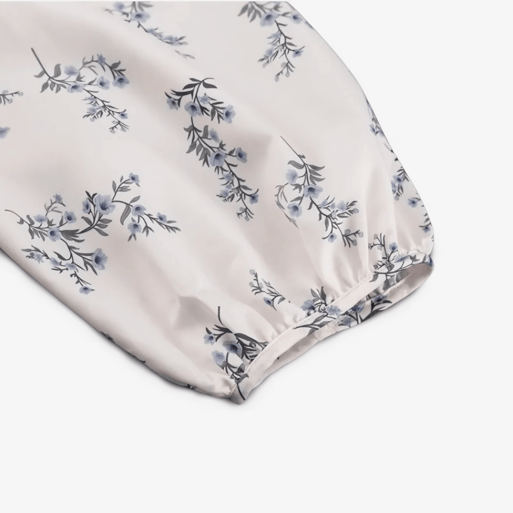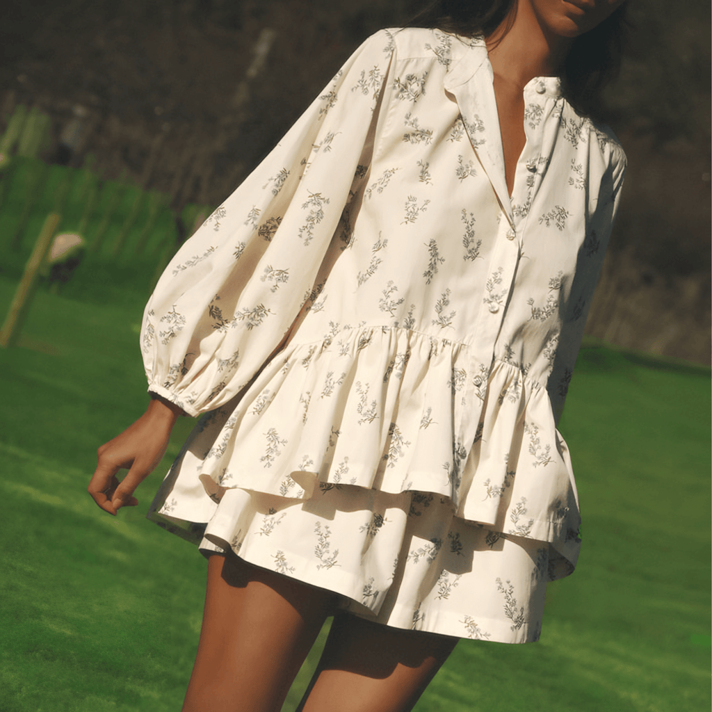 Blusa com mangas bufantes e punhos elásticos. Decote V com fechamento frontal em botões. Detalhe peplum em camadas. Short de cintura alta com elástico ajustável. Estampa floral delicada.