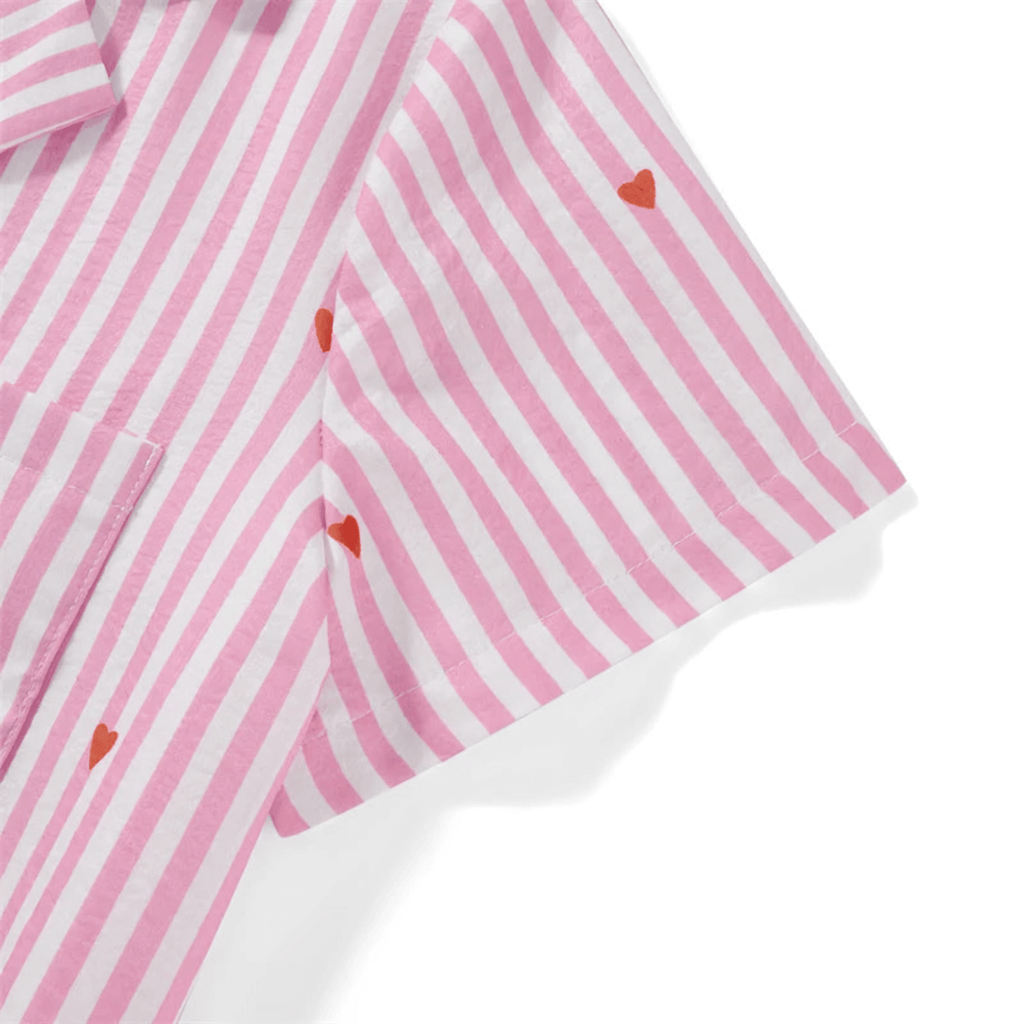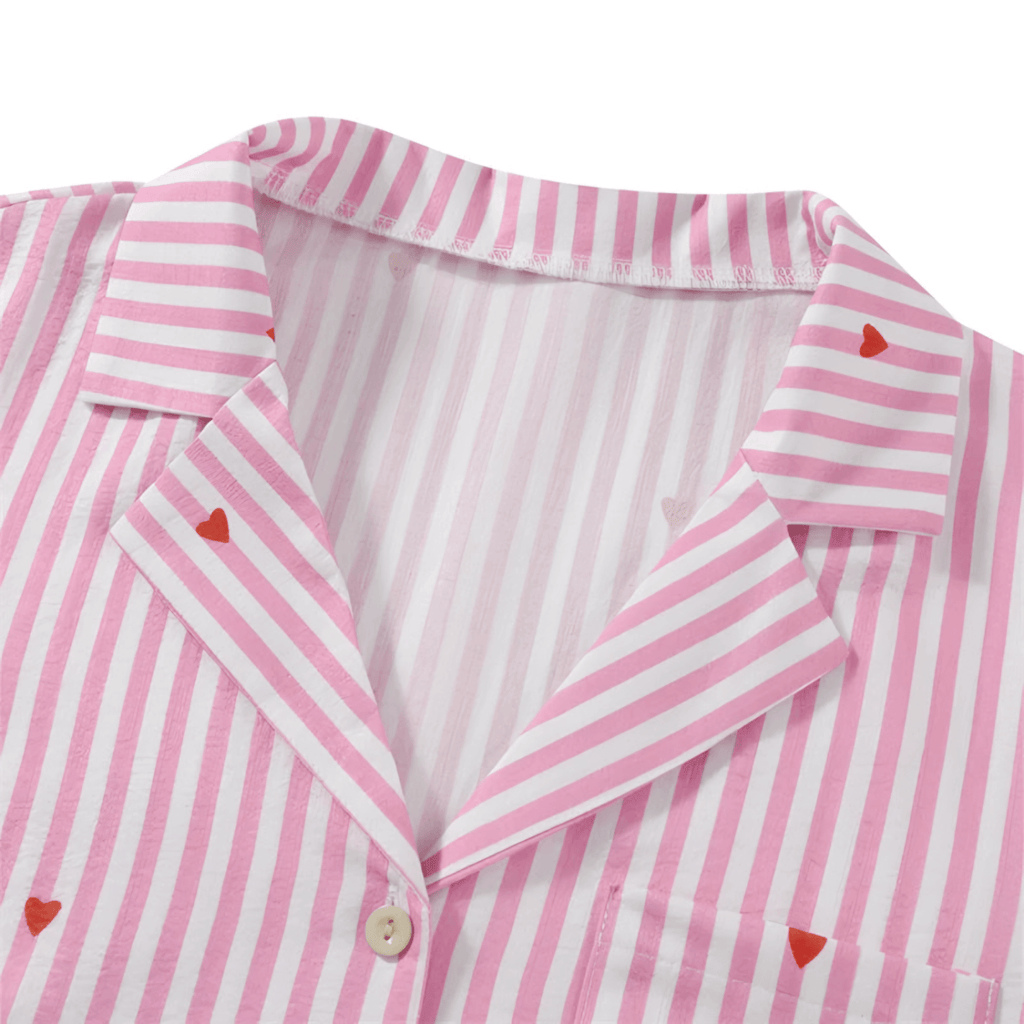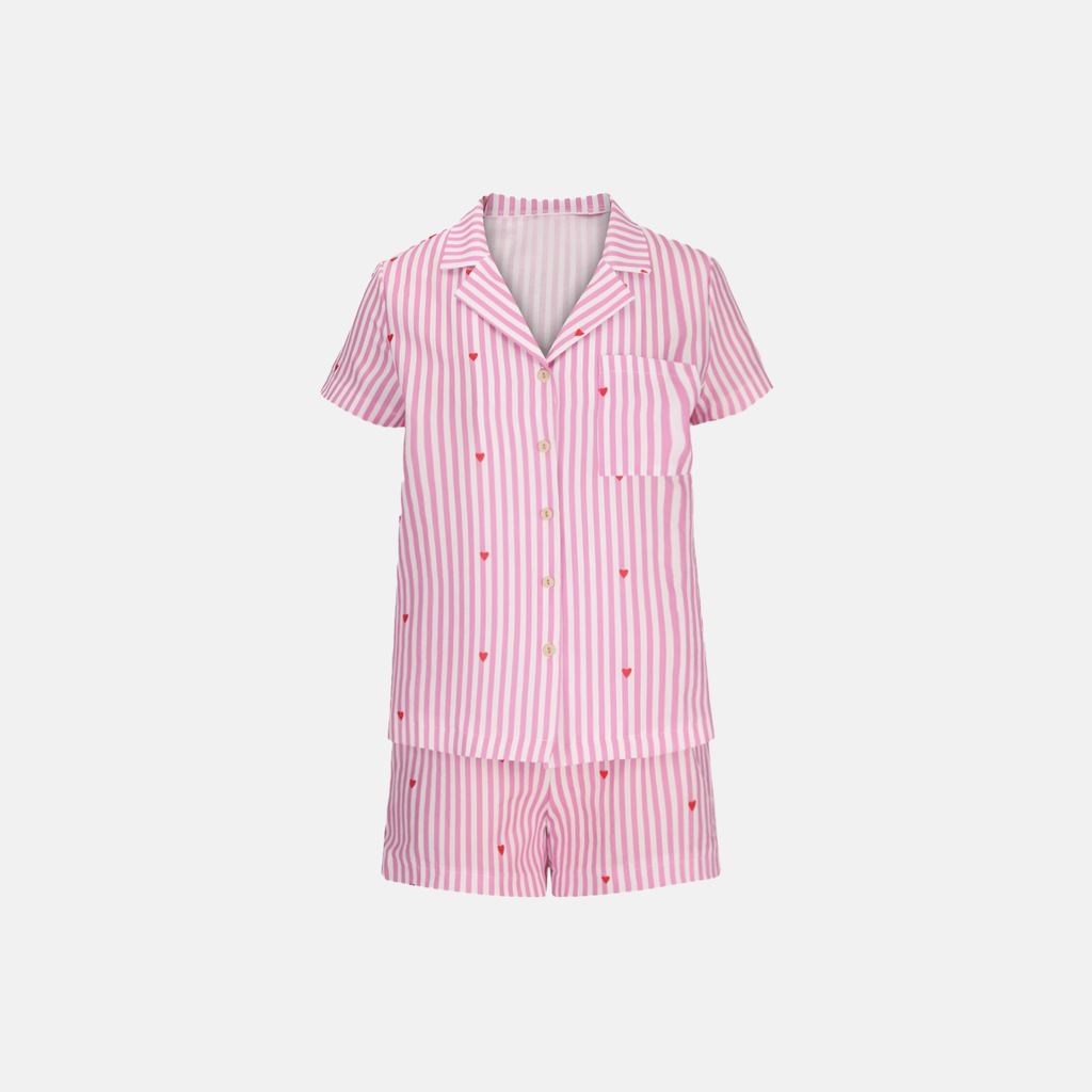 Conjunto listrado de camisa com gola lapela e botões frontais, e short com cós elástico e amarração. Bordados de corações vermelhos e acabamento interno em costura overlock.