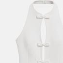 Conjunto de top e saia curta com aplicação de laços. Top com decote halter e recortes frontais. Saia transpassada com fecho lateral invisível. Acabamento encorpado com textura levemente granulada.