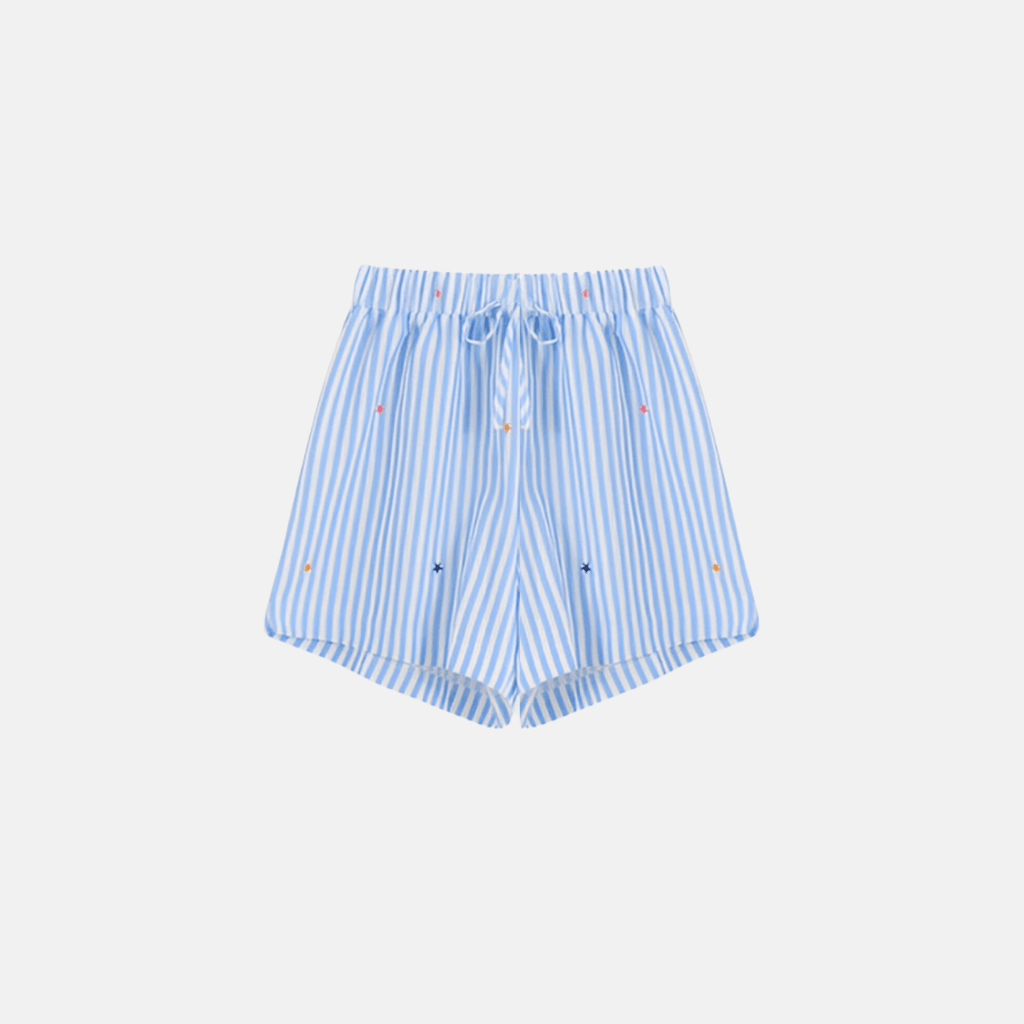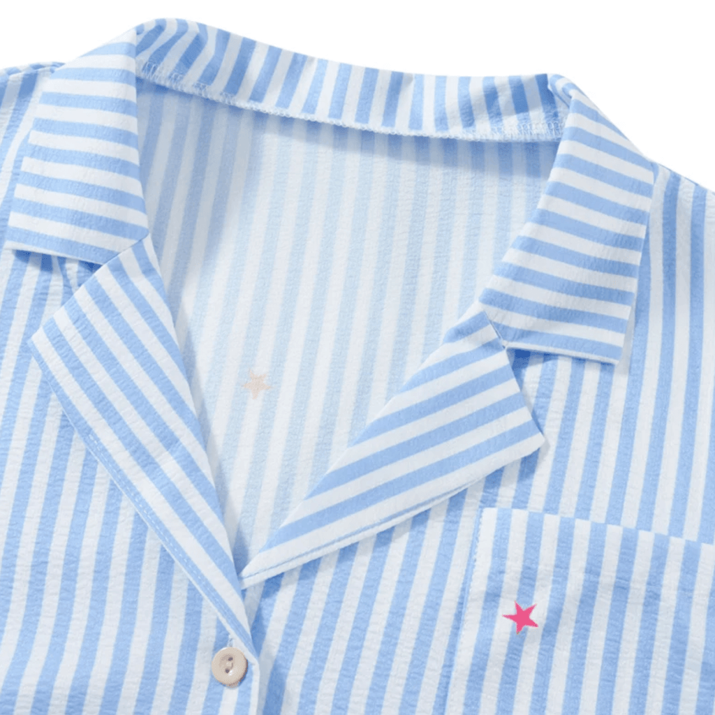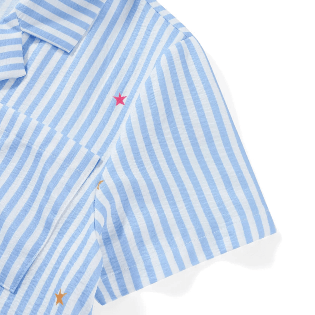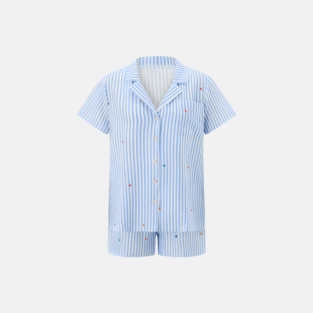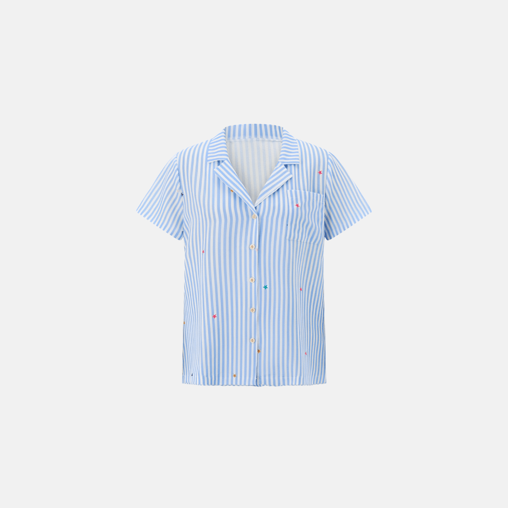 Conjunto listrado de camisa com gola lapela e botões frontais, e short com cós elástico e amarração. Bordados de estrelas coloridas e acabamento interno em costura overlock.