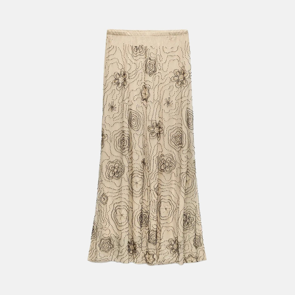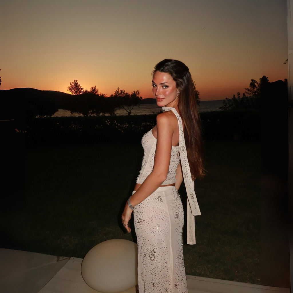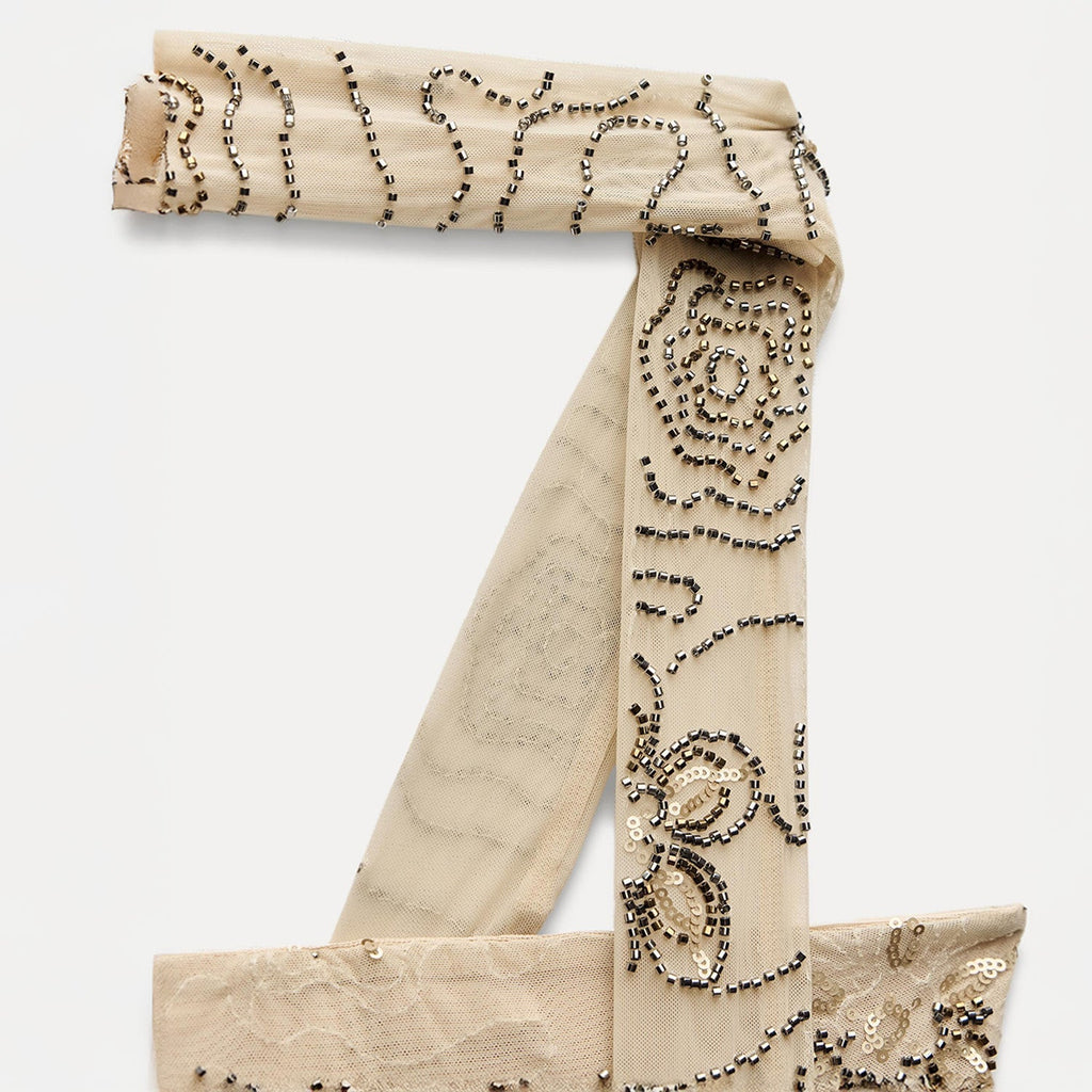 Conjunto de saia longa reta com cintura alta e top tomara que caia, ambos em tule bordado com miçangas e paetês, detalhes geométricos, acabamento forrado e faixa removível.