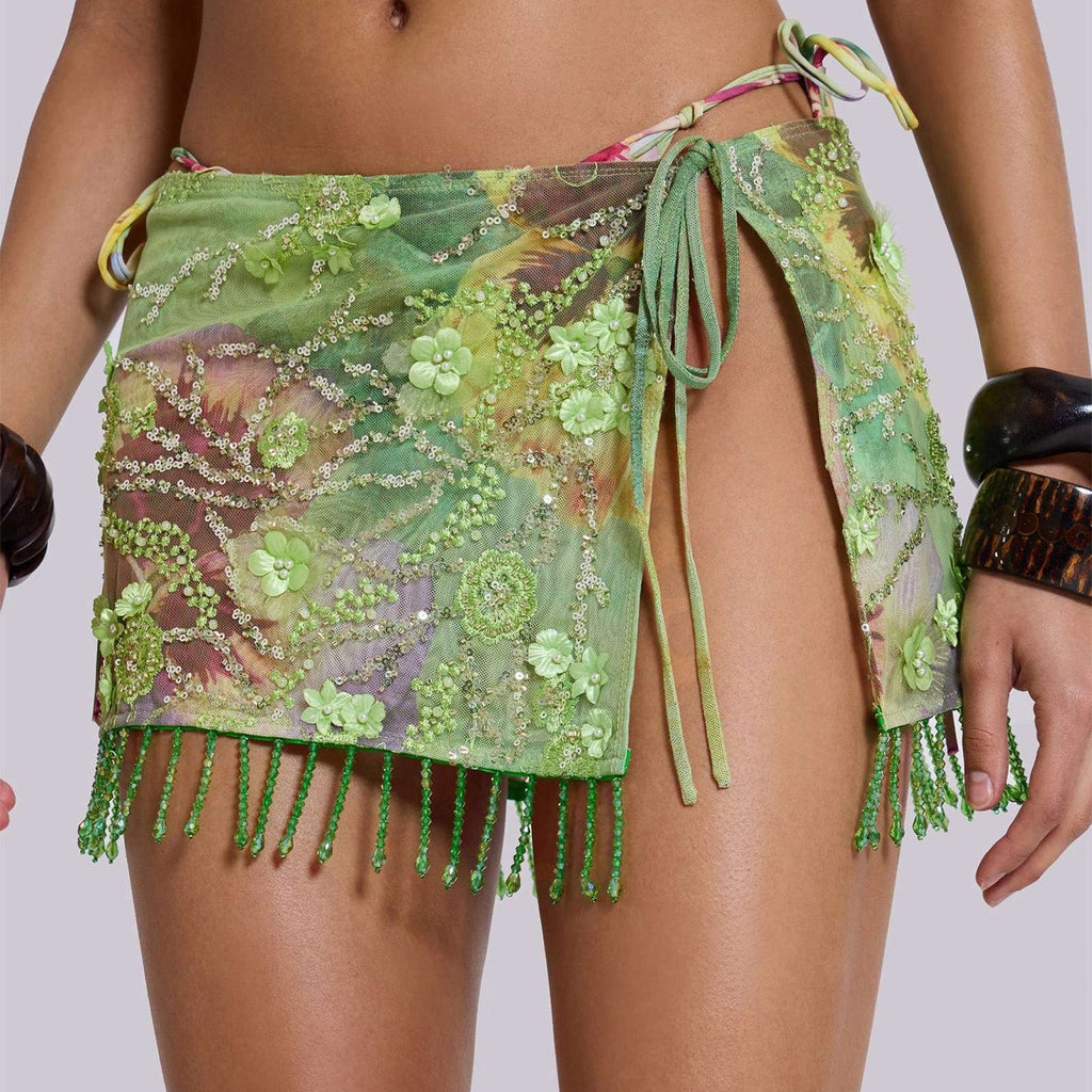 Saia curta de amarração lateral, tule bordado com paetês e flores aplicadas em 3D, franjas de miçangas e fundo estampado.