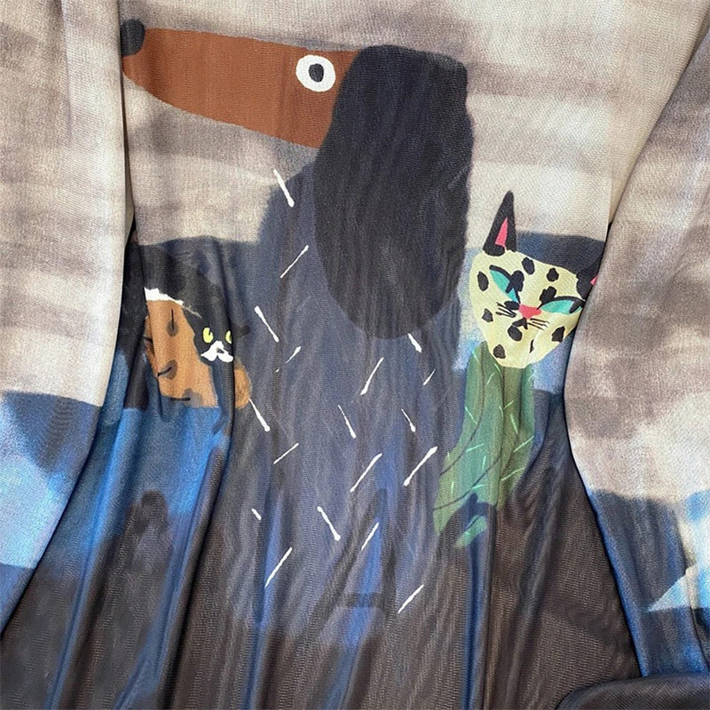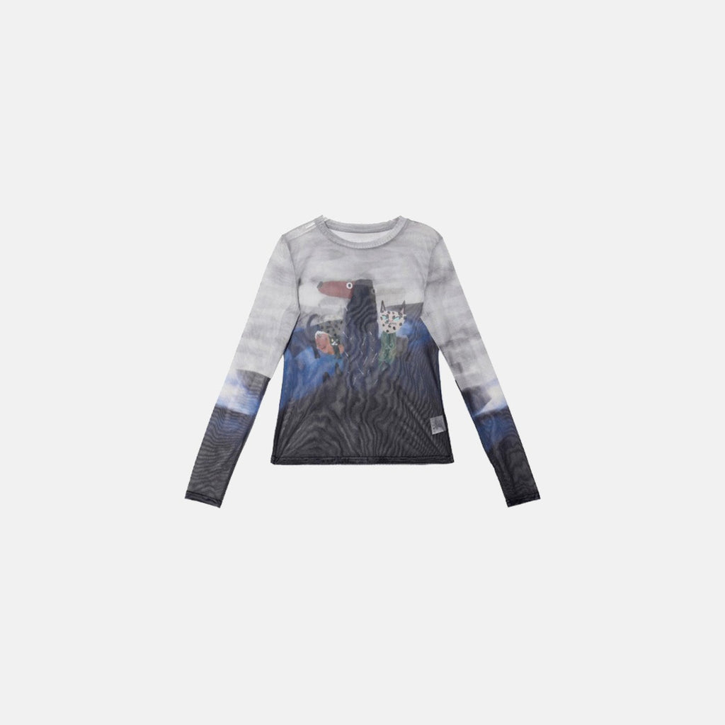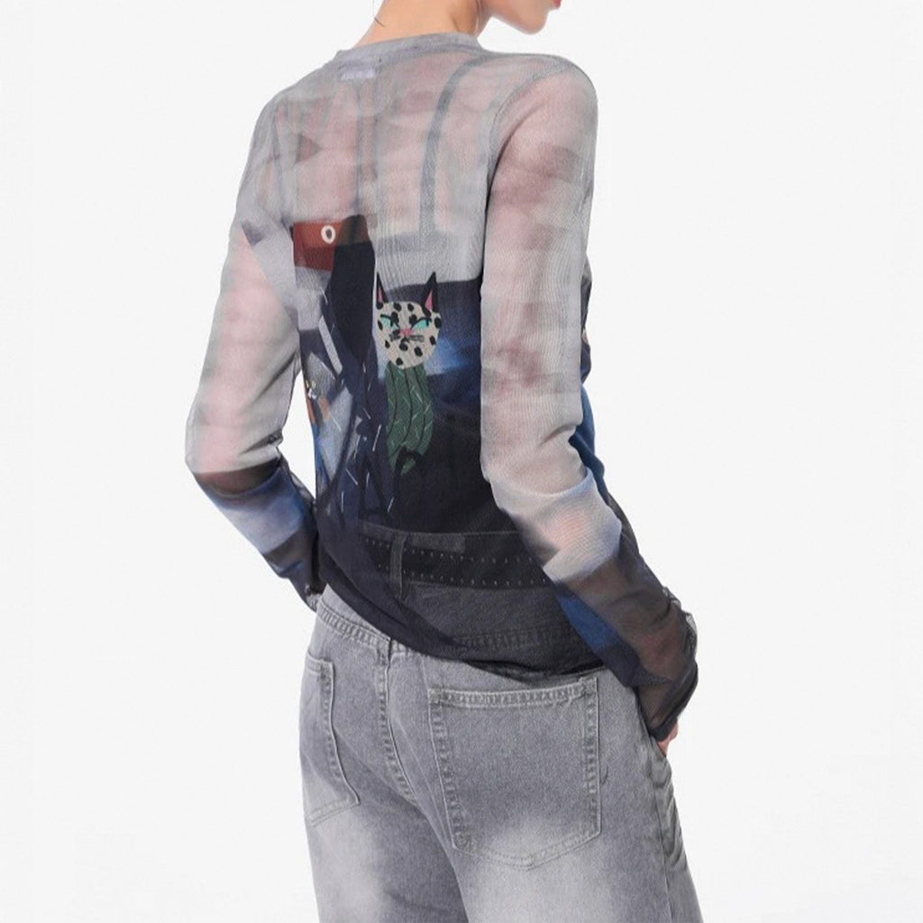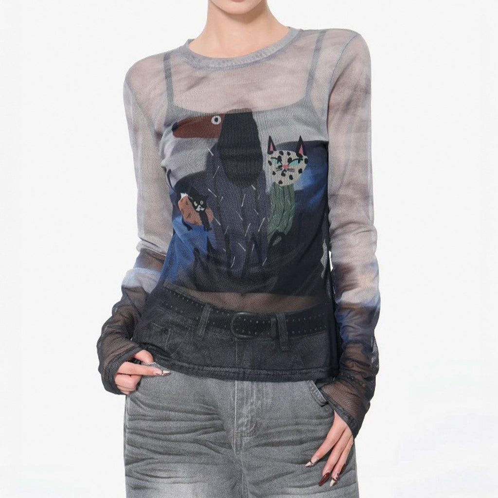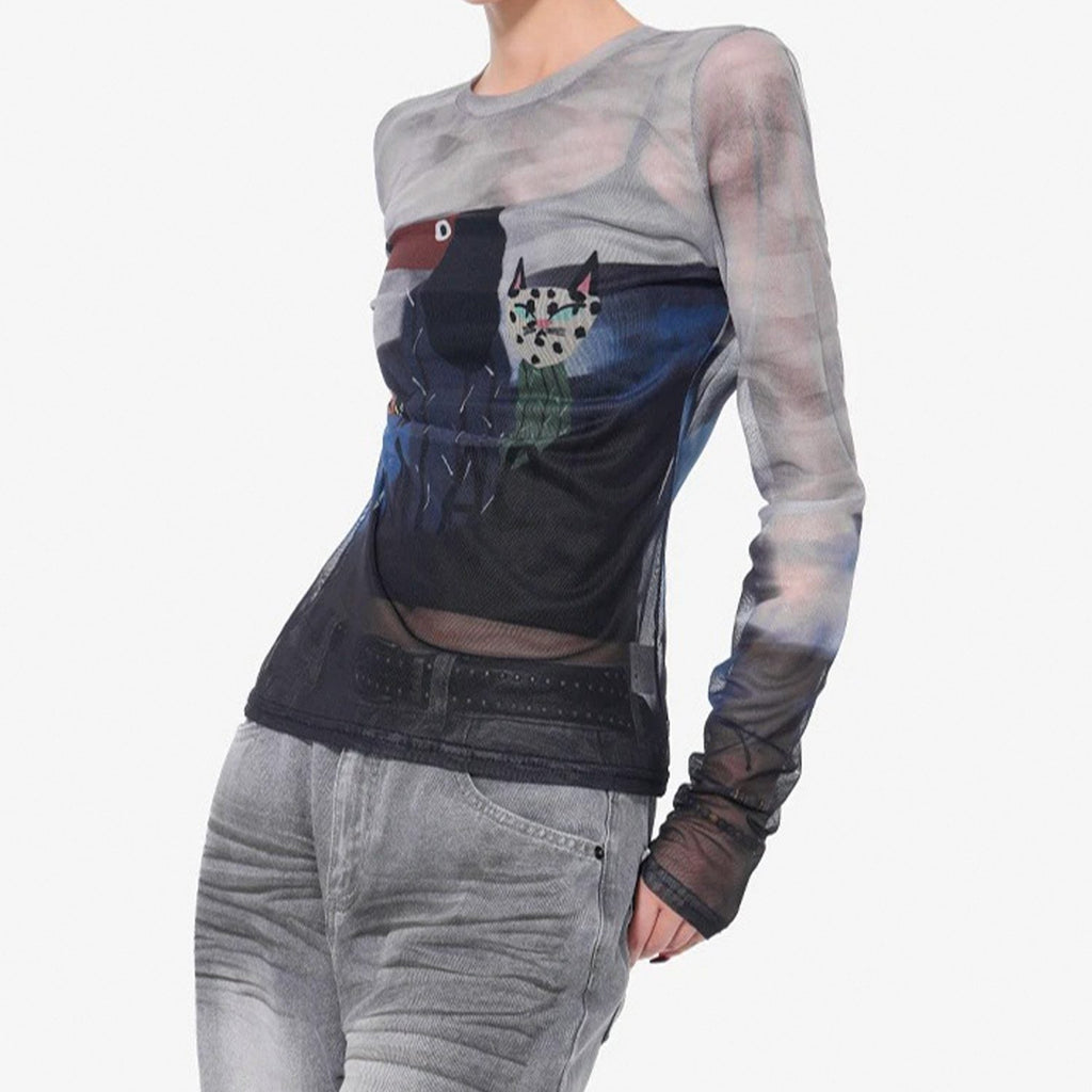 Blusa de manga longa ajustada ao corpo, confeccionada em tecido translúcido. Estampa frontal com gráfico centralizado de punhal e coração, desenhos de dragões nas mangas e detalhes solares. Acabamento de costura fina e elasticidade suave.