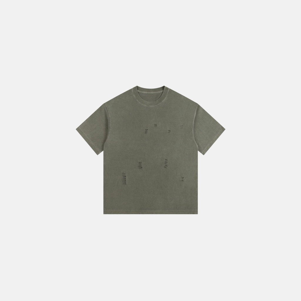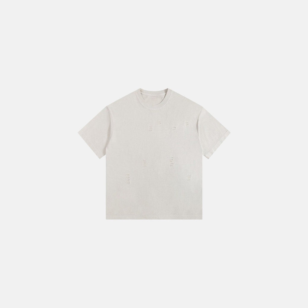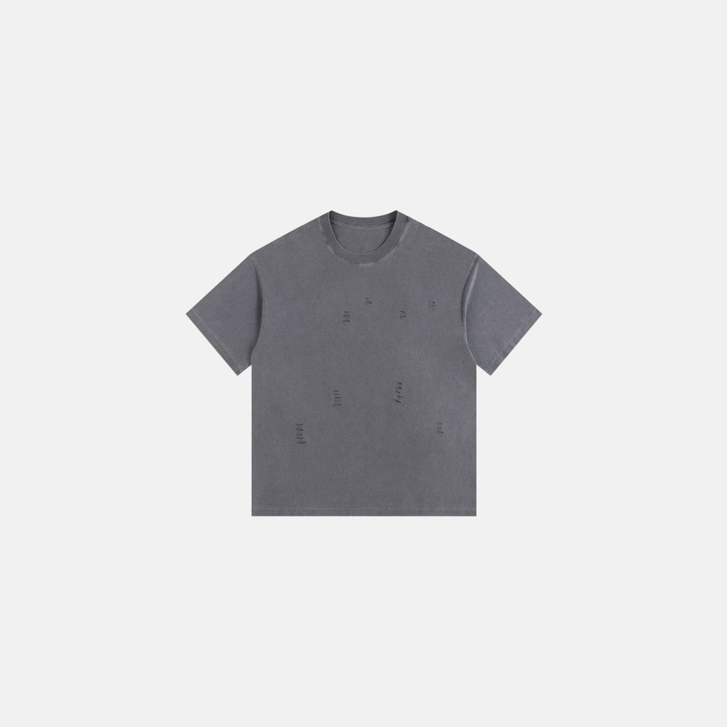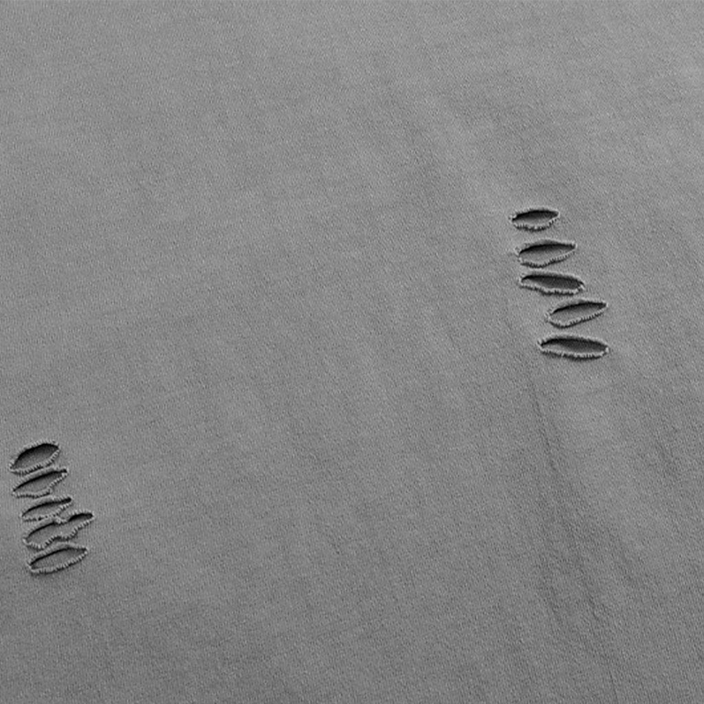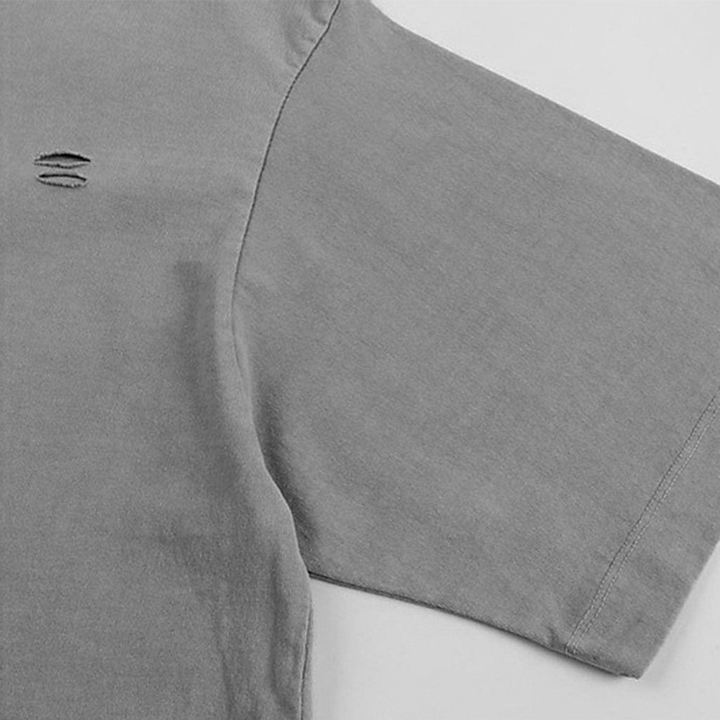 Camiseta oversized de algodão com lavagem estonada. Detalhe de rasgos localizados na parte frontal e acabamento desfiado. Modelagem reta, mangas curtas amplas e gola careca.