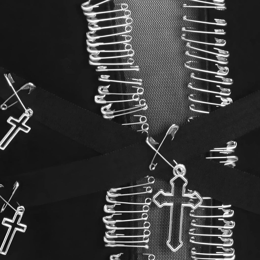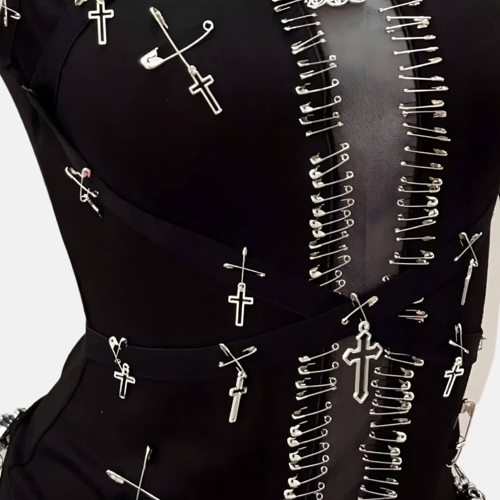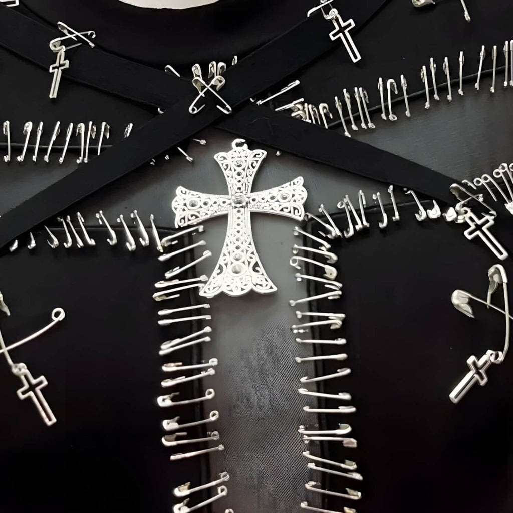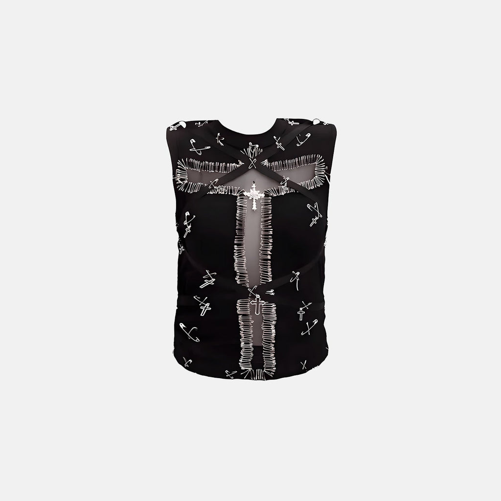 Blusa sem mangas ajustável ao corpo, recortes em tule, aplicação de alfinetes metálicos e pingentes de cruz, acabamento pespontado, decote fechado e detalhe de tiras cruzadas frontais.