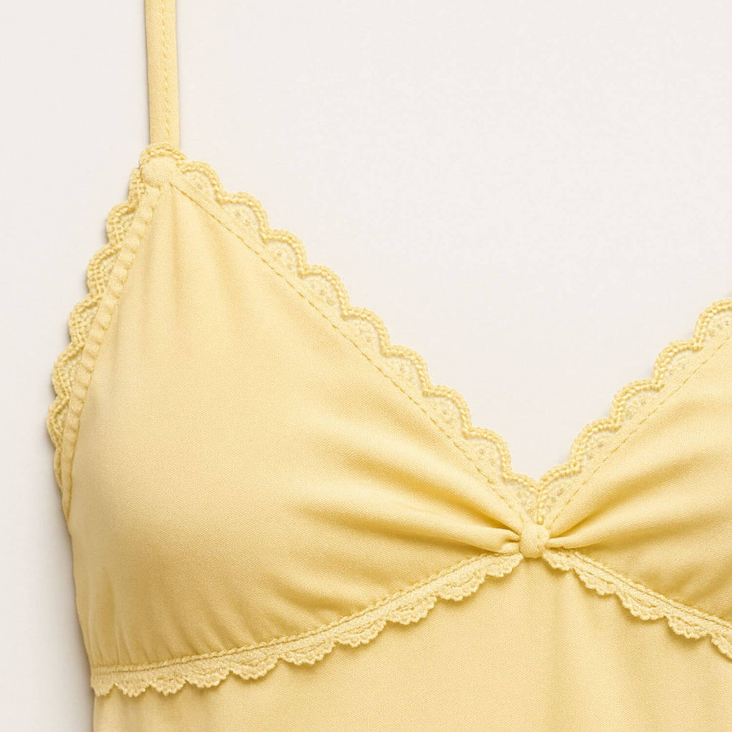 Blusa justo com alças finas ajustáveis. Decote em V com detalhe de renda delicada e franzido central. Costura sob o busto para definição sutil. Tecido liso com acabamento suave e toque acetinado.