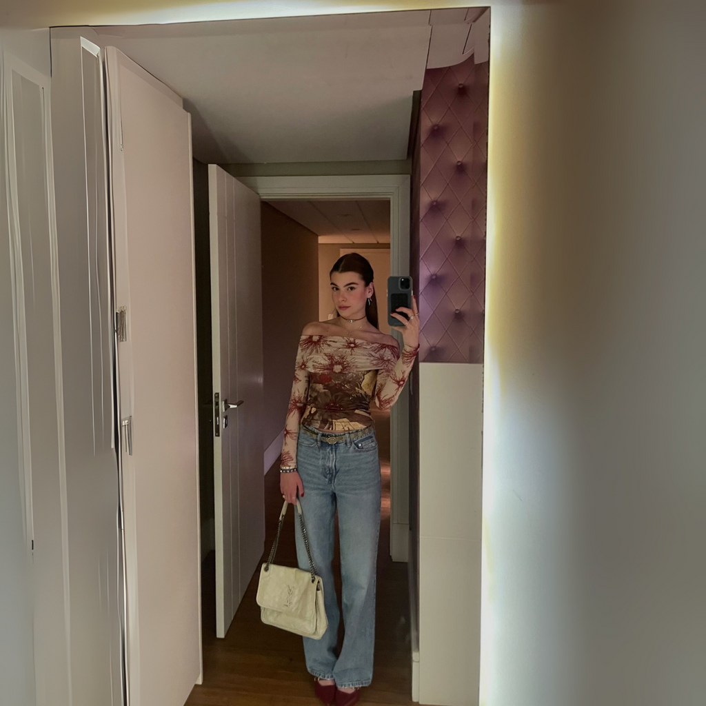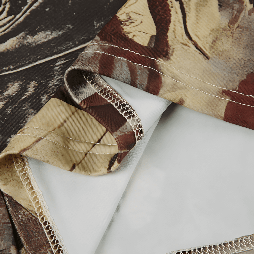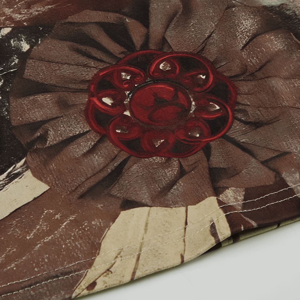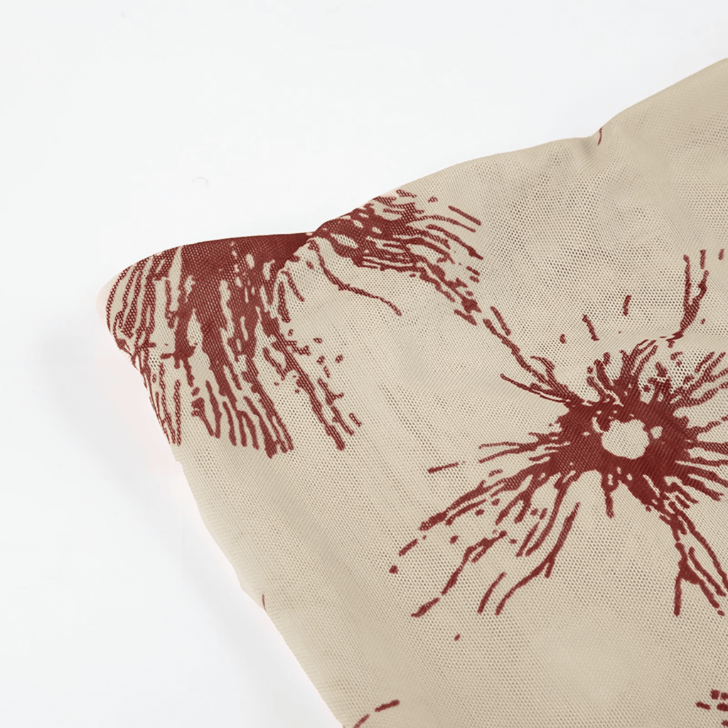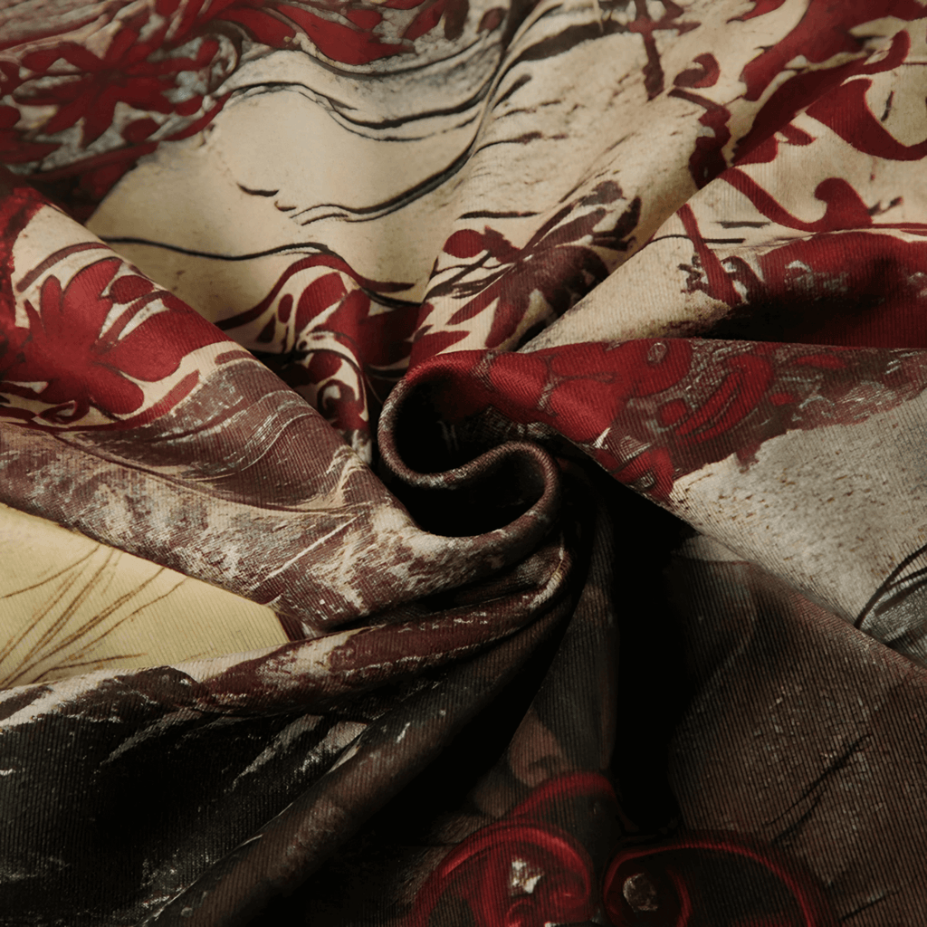 Blusa de ombros descobertos com manga longa e decote reto. Modelagem ajustável ao corpo. Estampa artística com flores e explosões em tons terrosos e vermelhos. Acabamento com costura visível e barra dobrada.