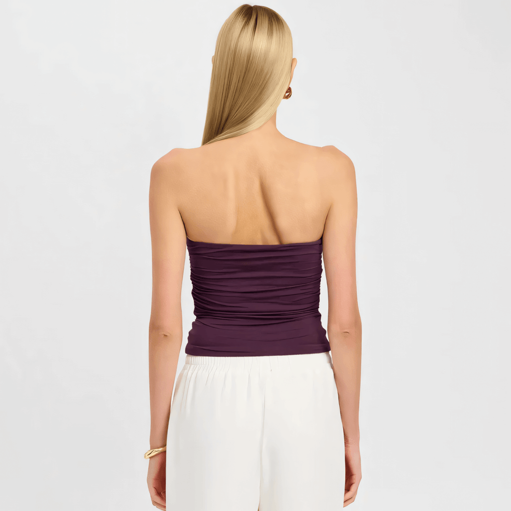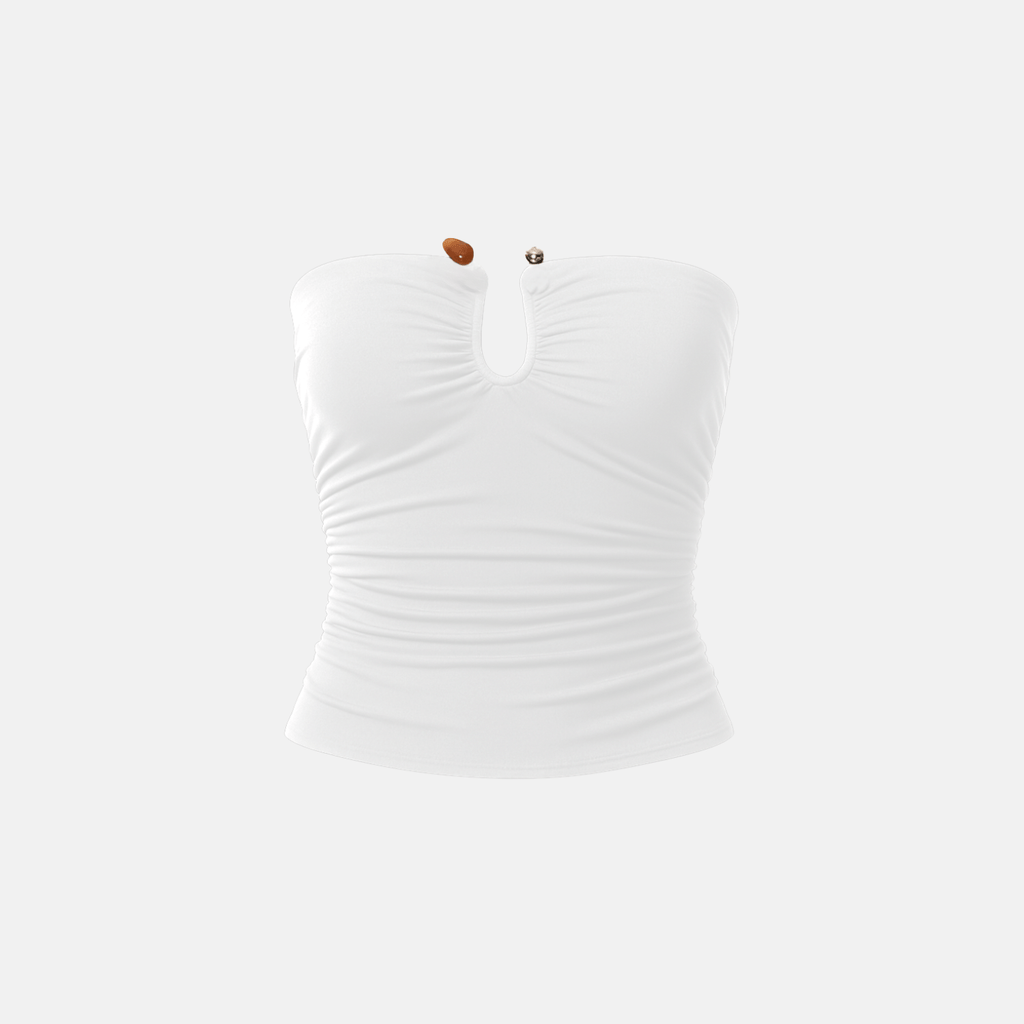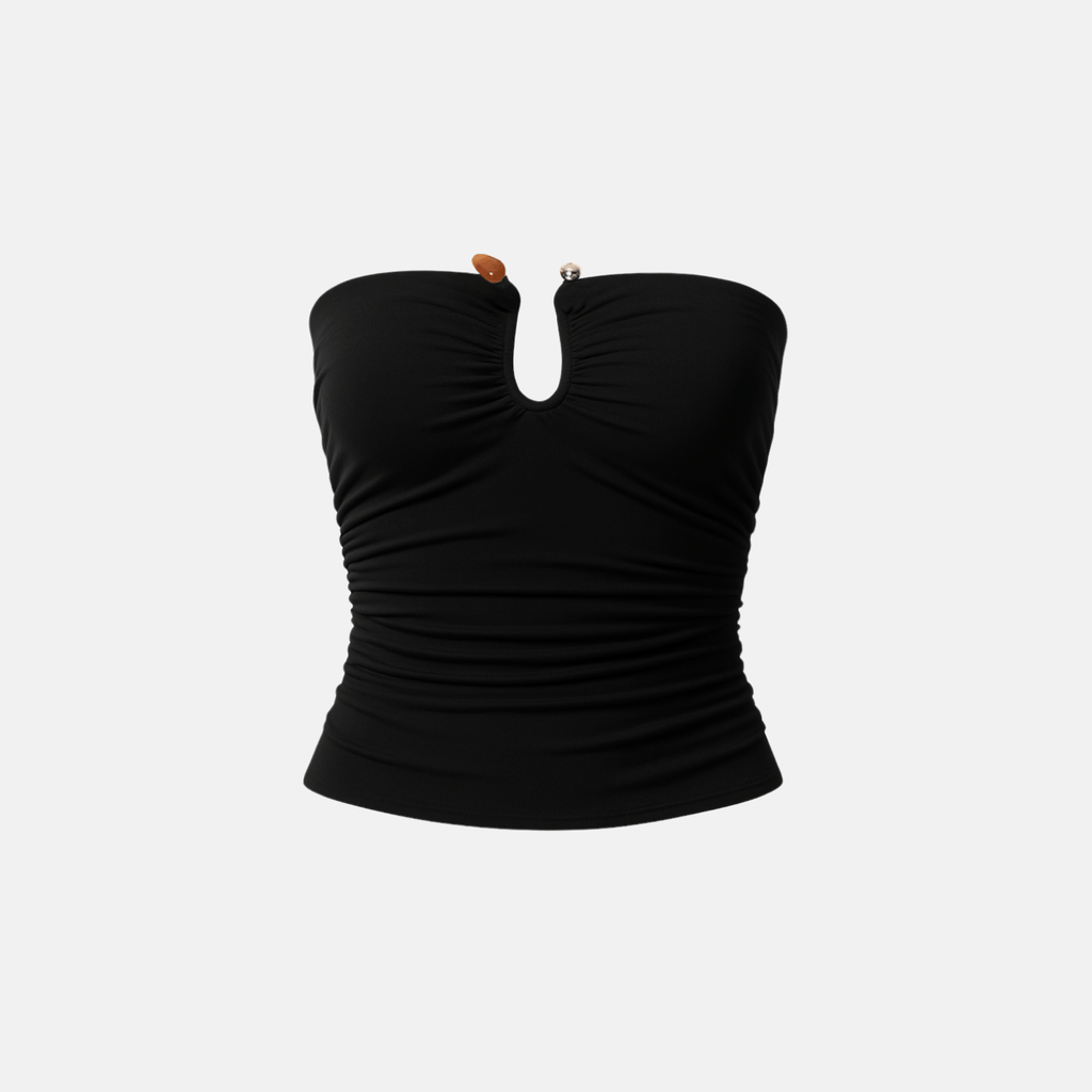 Blusa tomara que caia com franzido frontal e recorte em gota. Detalhe de pingentes metálicos no busto. Modelagem ajustada com drapeado em toda a peça e costura embutida.