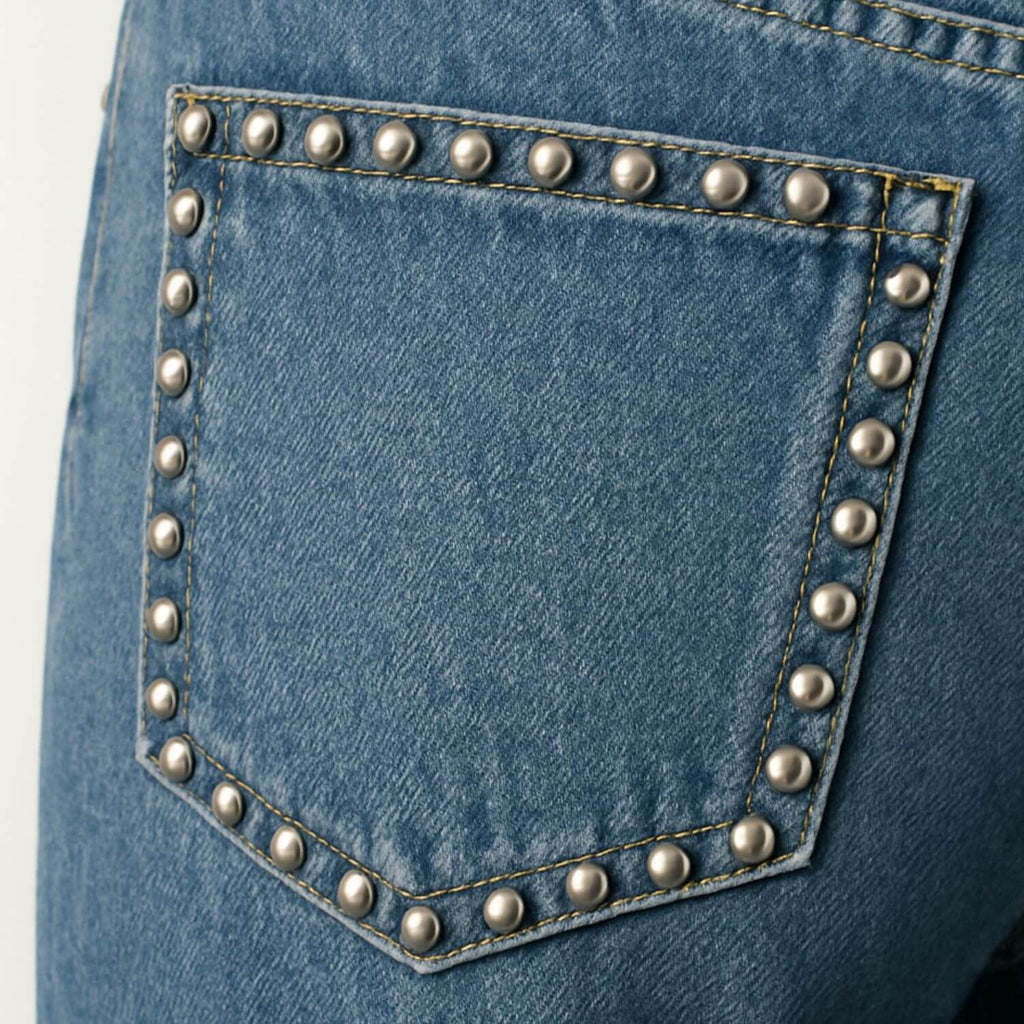 Calça jeans de cintura alta e corte reto. Aplicações de tachas metálicas ao longo das costuras laterais, bolsos e cós frontal. Fecho em zíper com botão metálico. Acabamento pespontado e passantes para cinto.