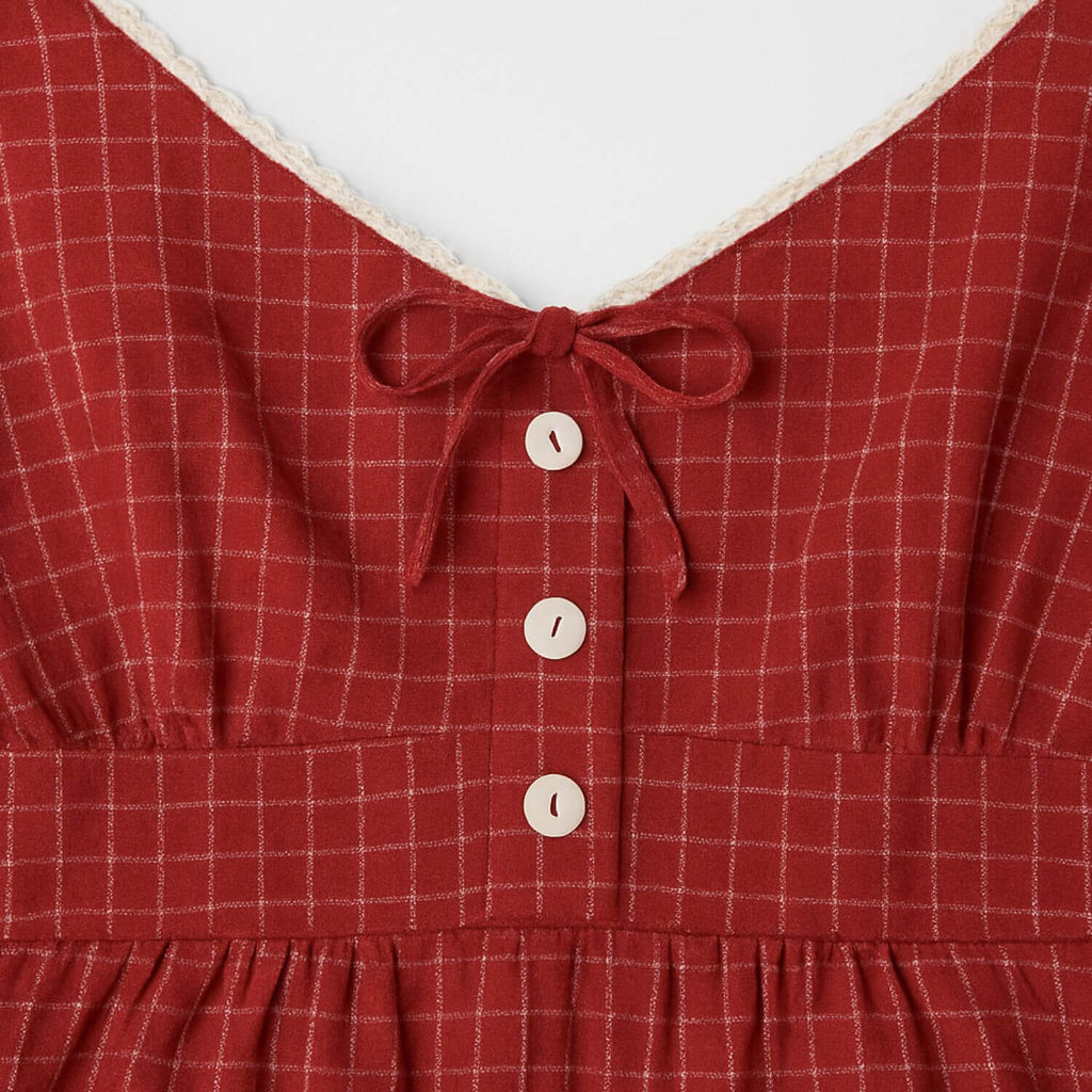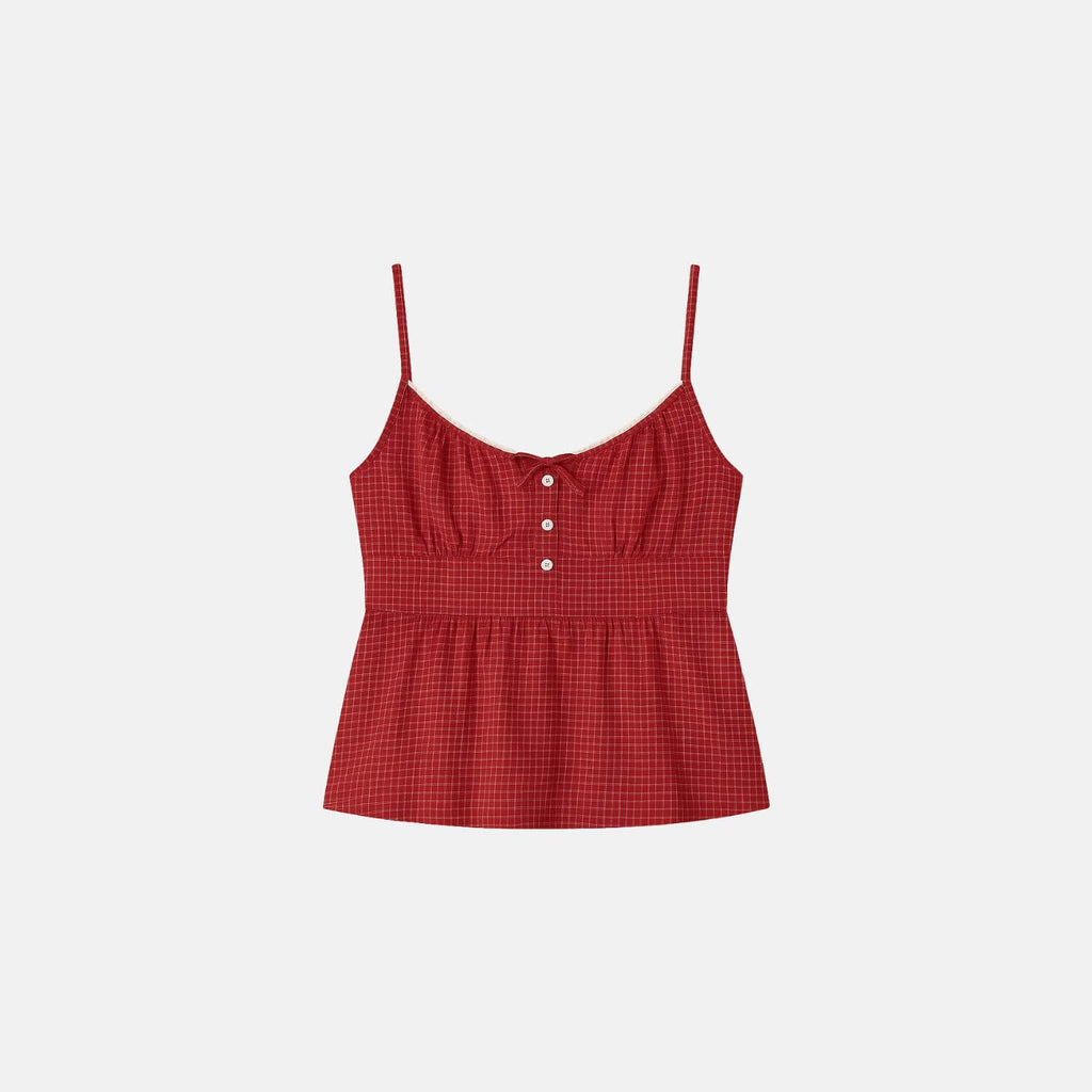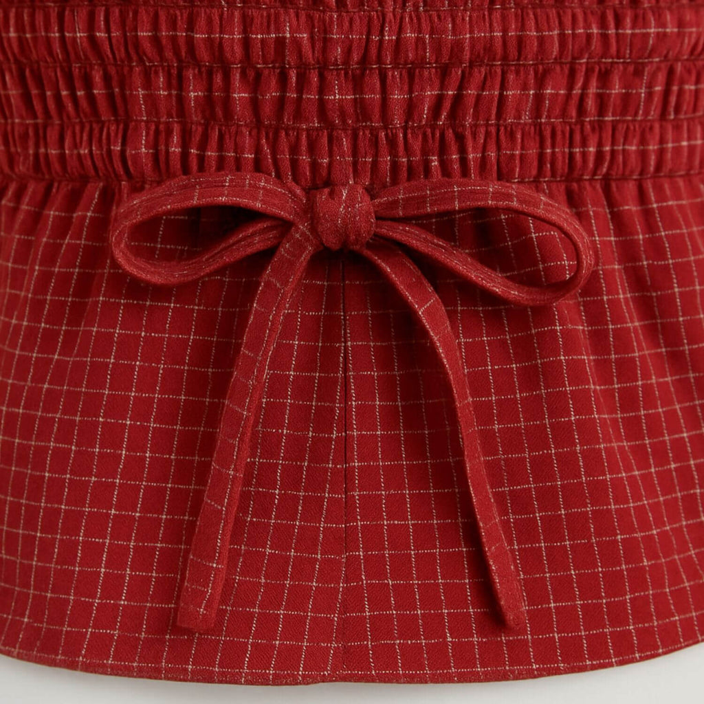 Top com alças finas e decote em V. Detalhe frontal com botões e laço central. Costas com elástico franzido e amarração. Short curto com cintura média, cós elástico e botões decorativos. Estampa xadrez delicada e acabamento em costura reta.