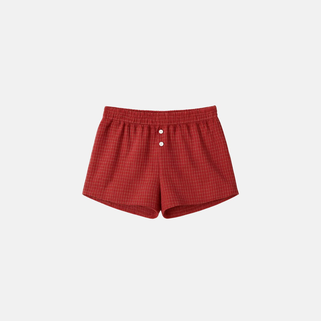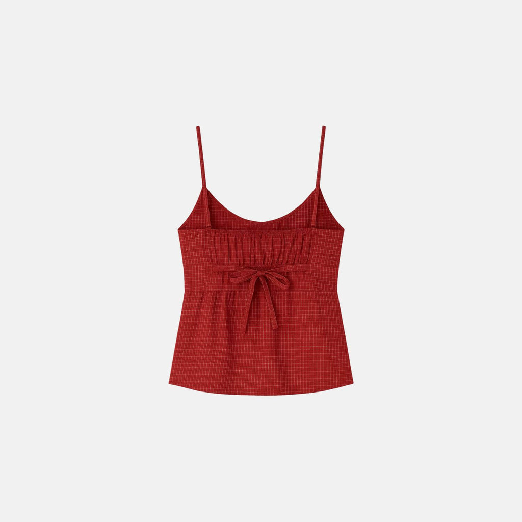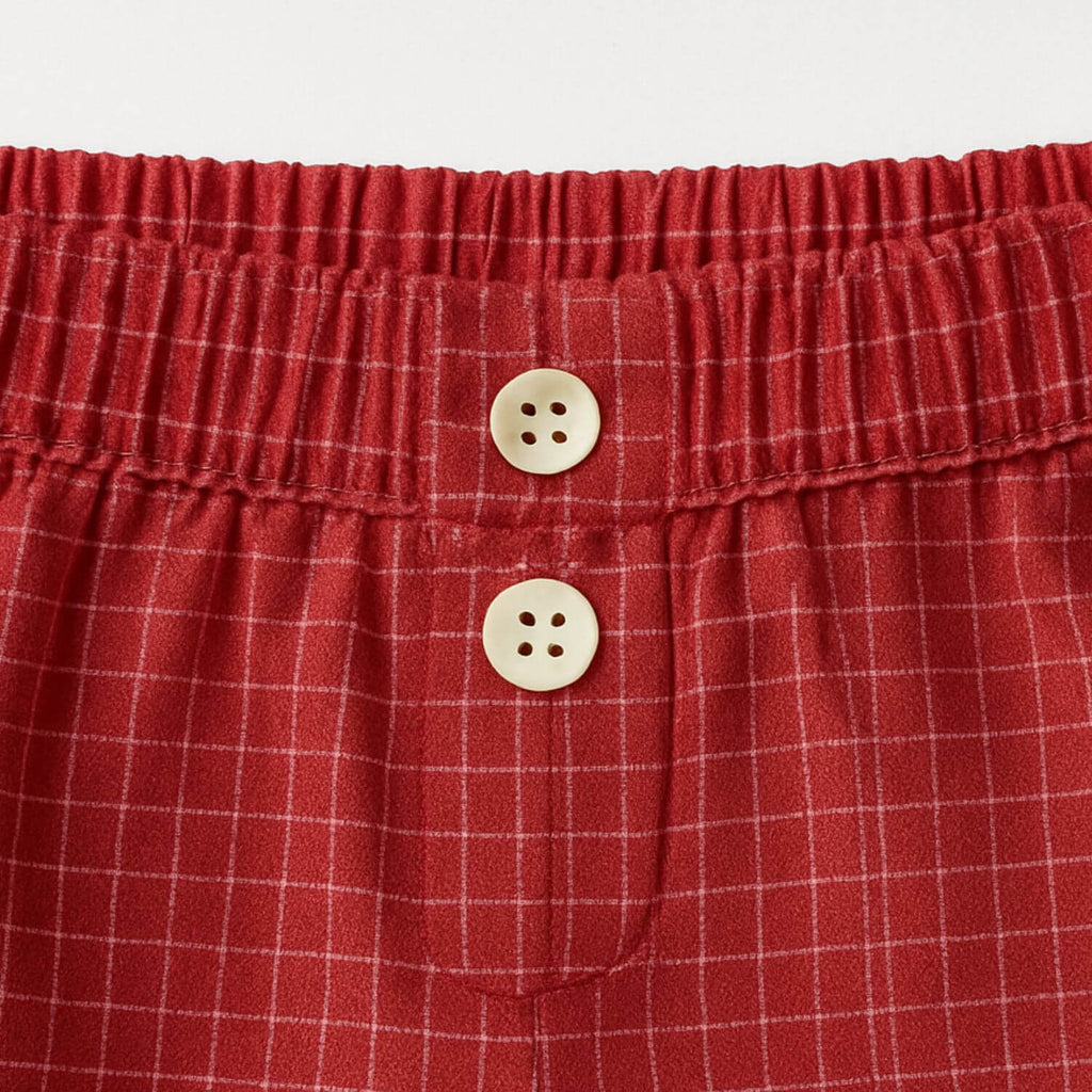 Top com alças finas e decote em V. Detalhe frontal com botões e laço central. Costas com elástico franzido e amarração. Short curto com cintura média, cós elástico e botões decorativos. Estampa xadrez delicada e acabamento em costura reta.
