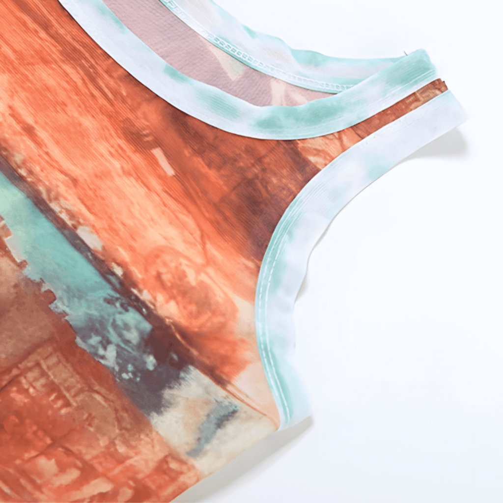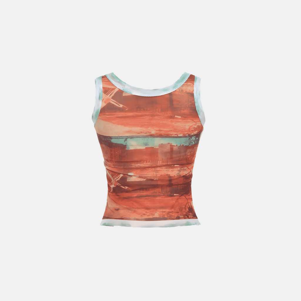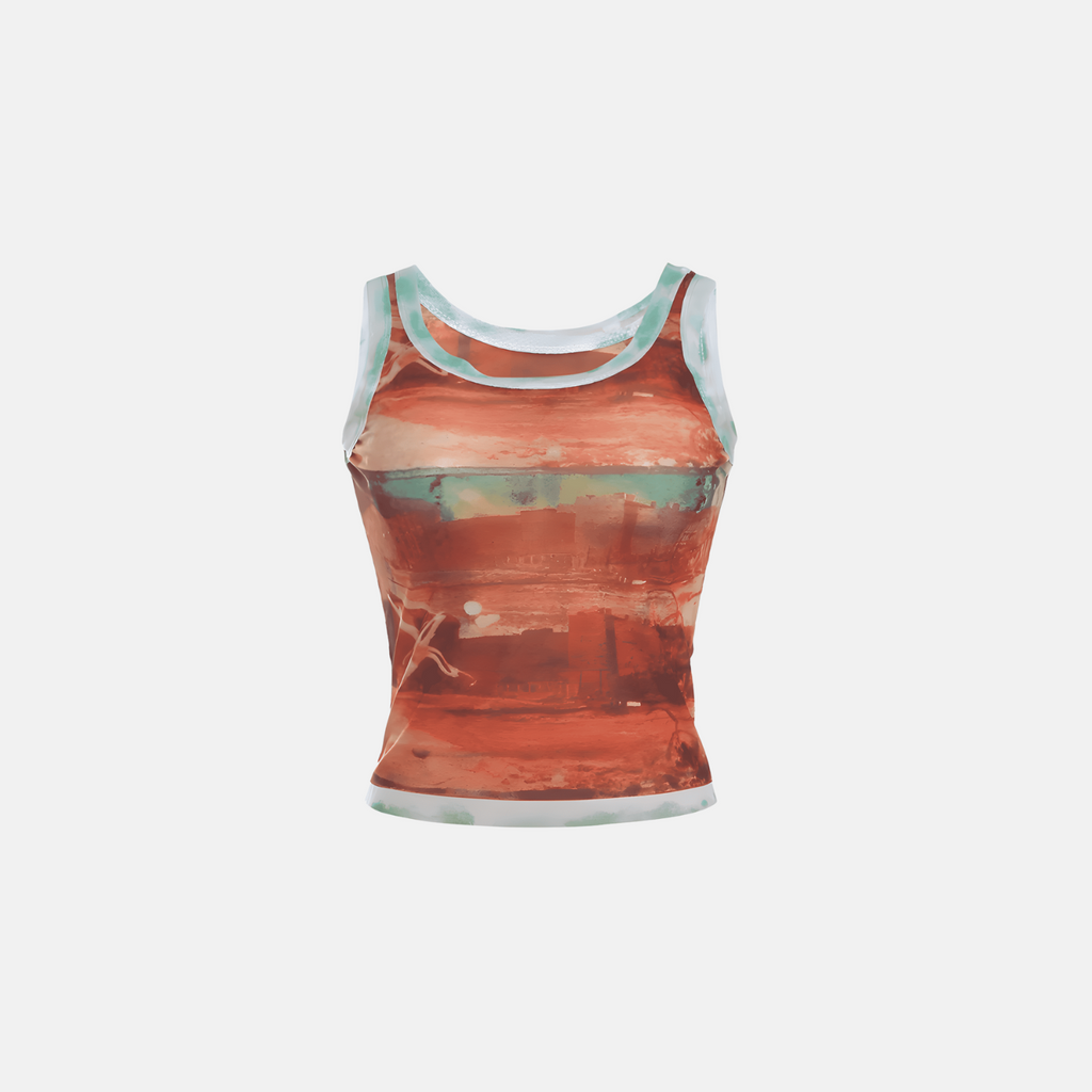 Regata ajustada ao corpo com estampa abstrata em tons terrosos. Modelagem reta com decote redondo e alças largas. Acabamento em viés contrastante e barra com leve ondulação.