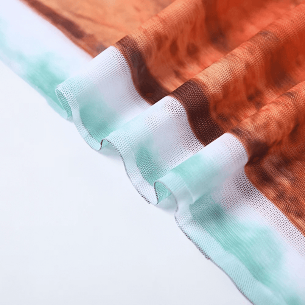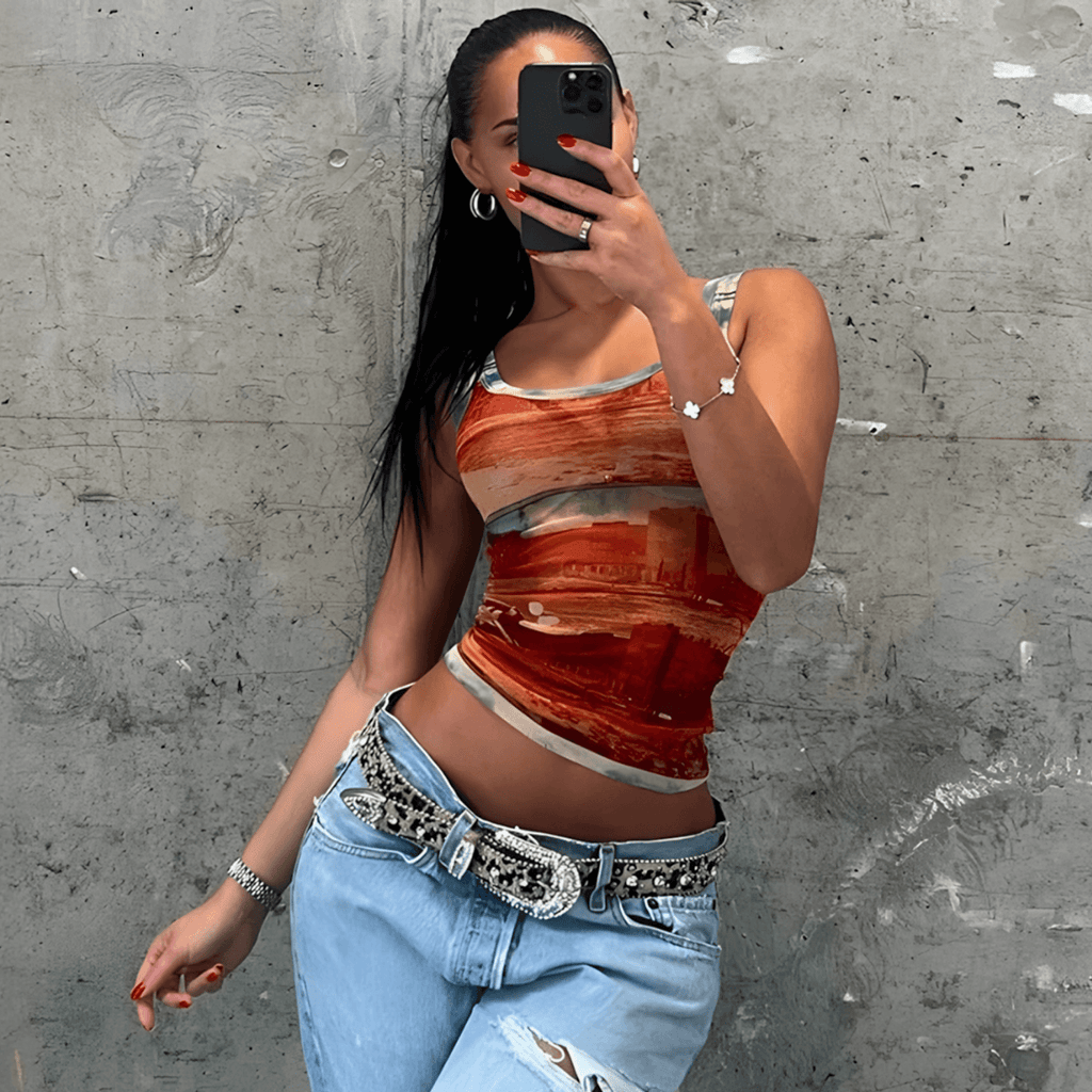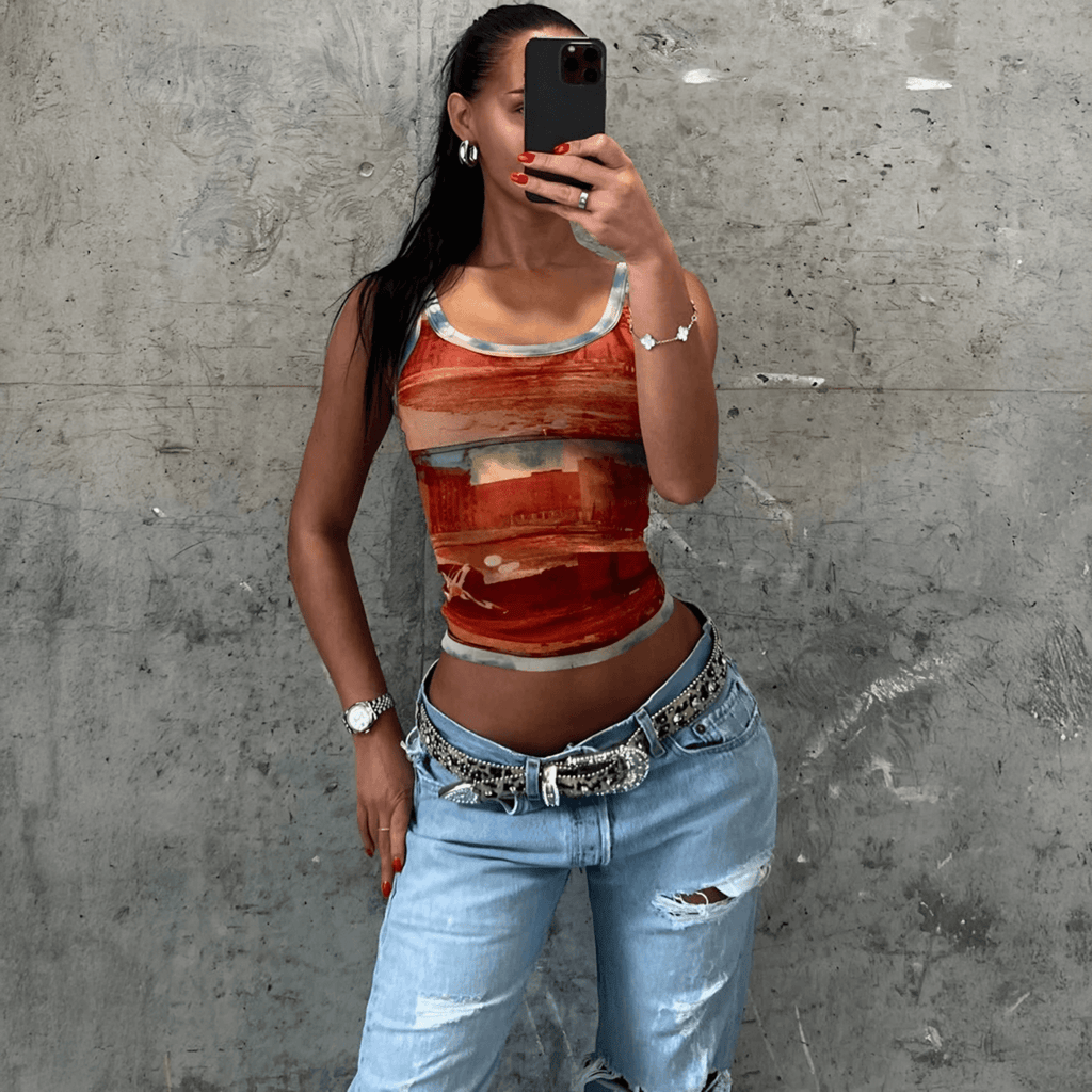 Regata ajustada ao corpo com estampa abstrata em tons terrosos. Modelagem reta com decote redondo e alças largas. Acabamento em viés contrastante e barra com leve ondulação.