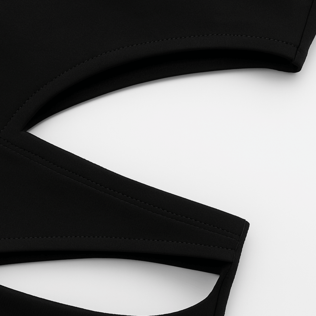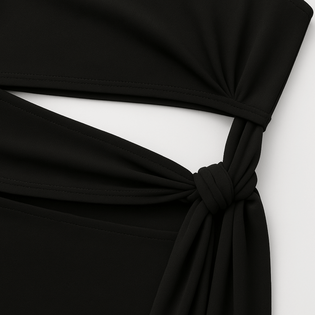 Vestido curto de um ombro só com recortes assimétricos. Faixa lateral drapeada com amarração na cintura. Modelagem ajustada e acabamento com costura embutida.
