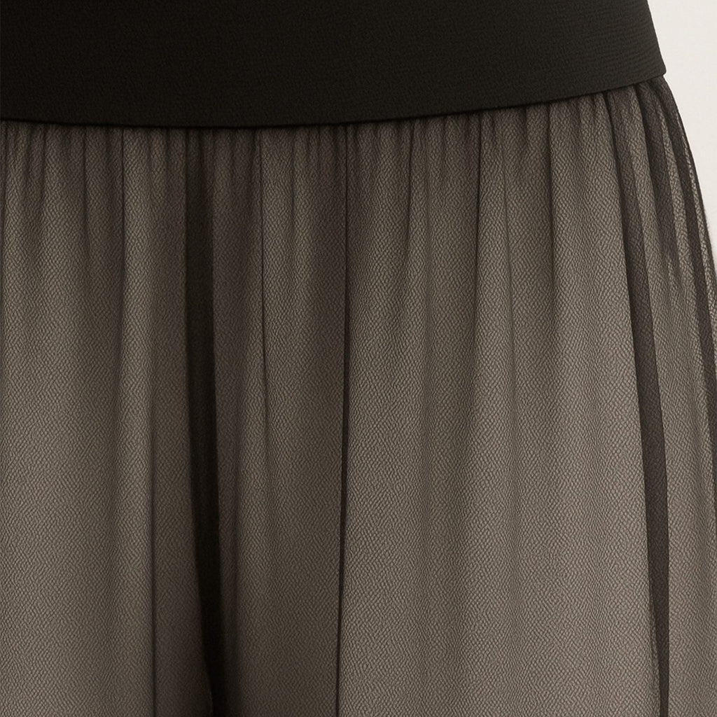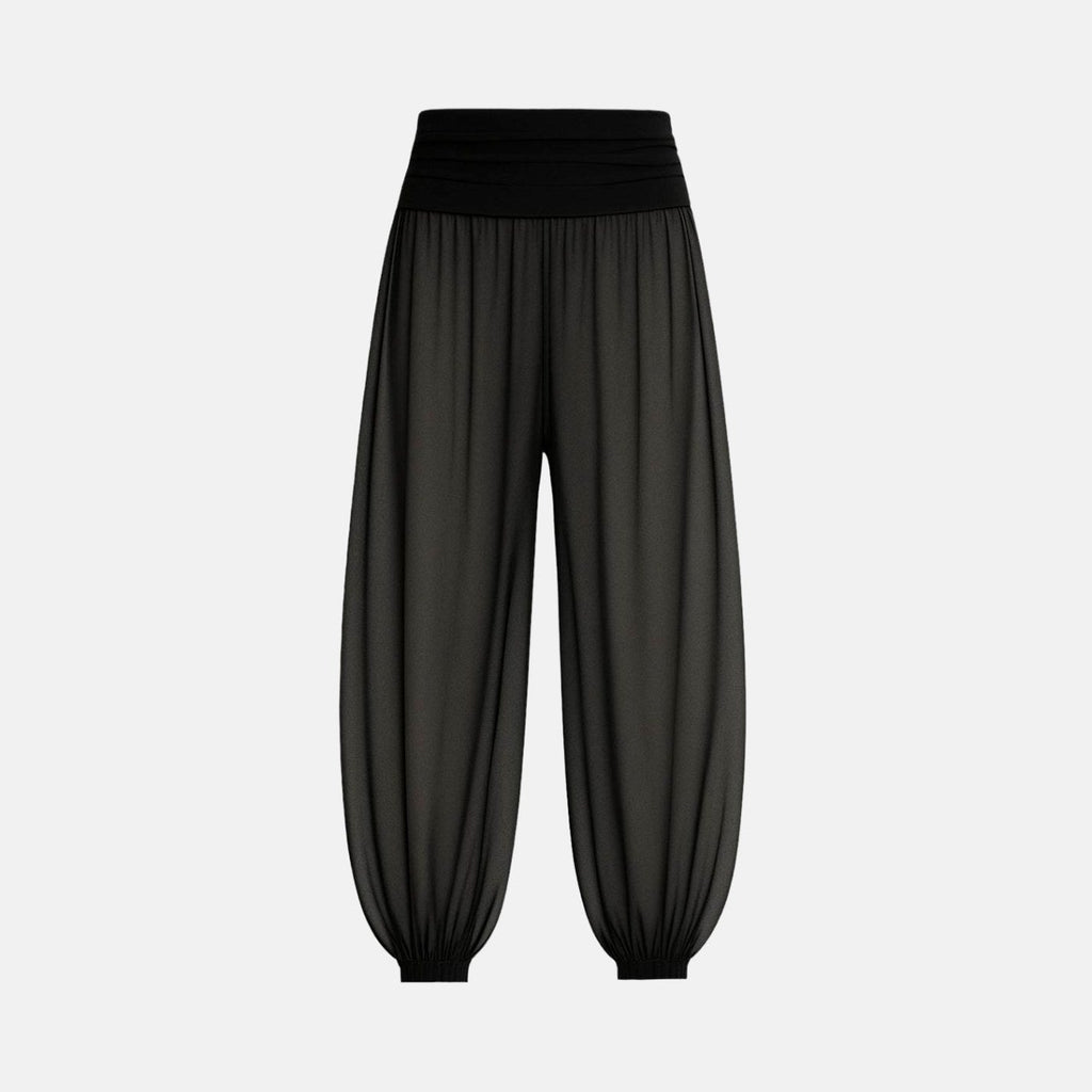 Calça solta de cintura alta. Tecido leve e transparente com caimento fluido. Barra e cintura com elástico largo para melhor ajuste. Costuras discretas e acabamento delicado.