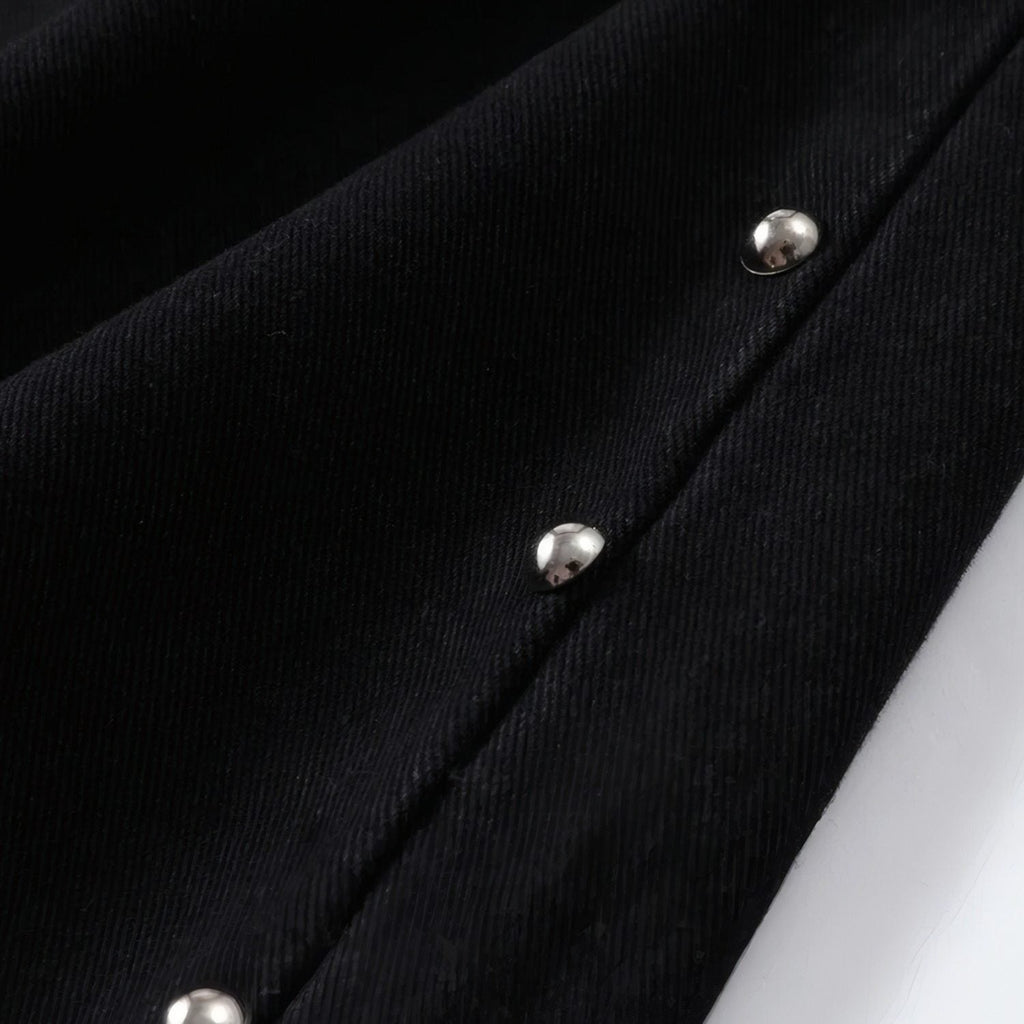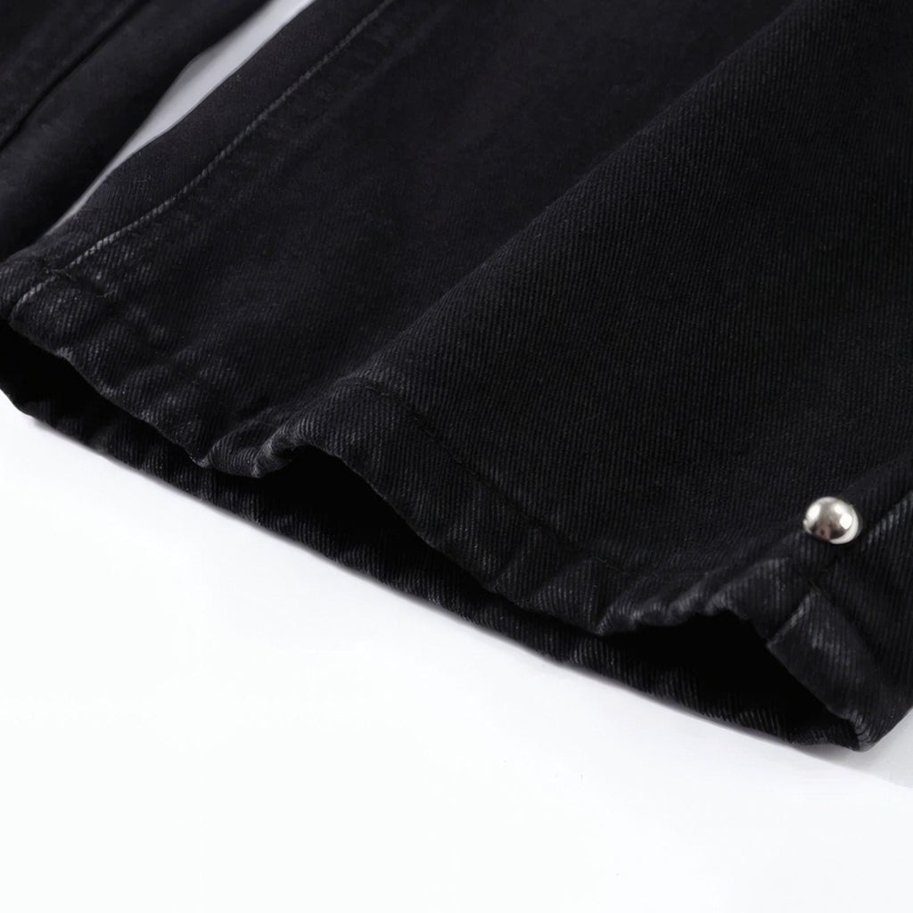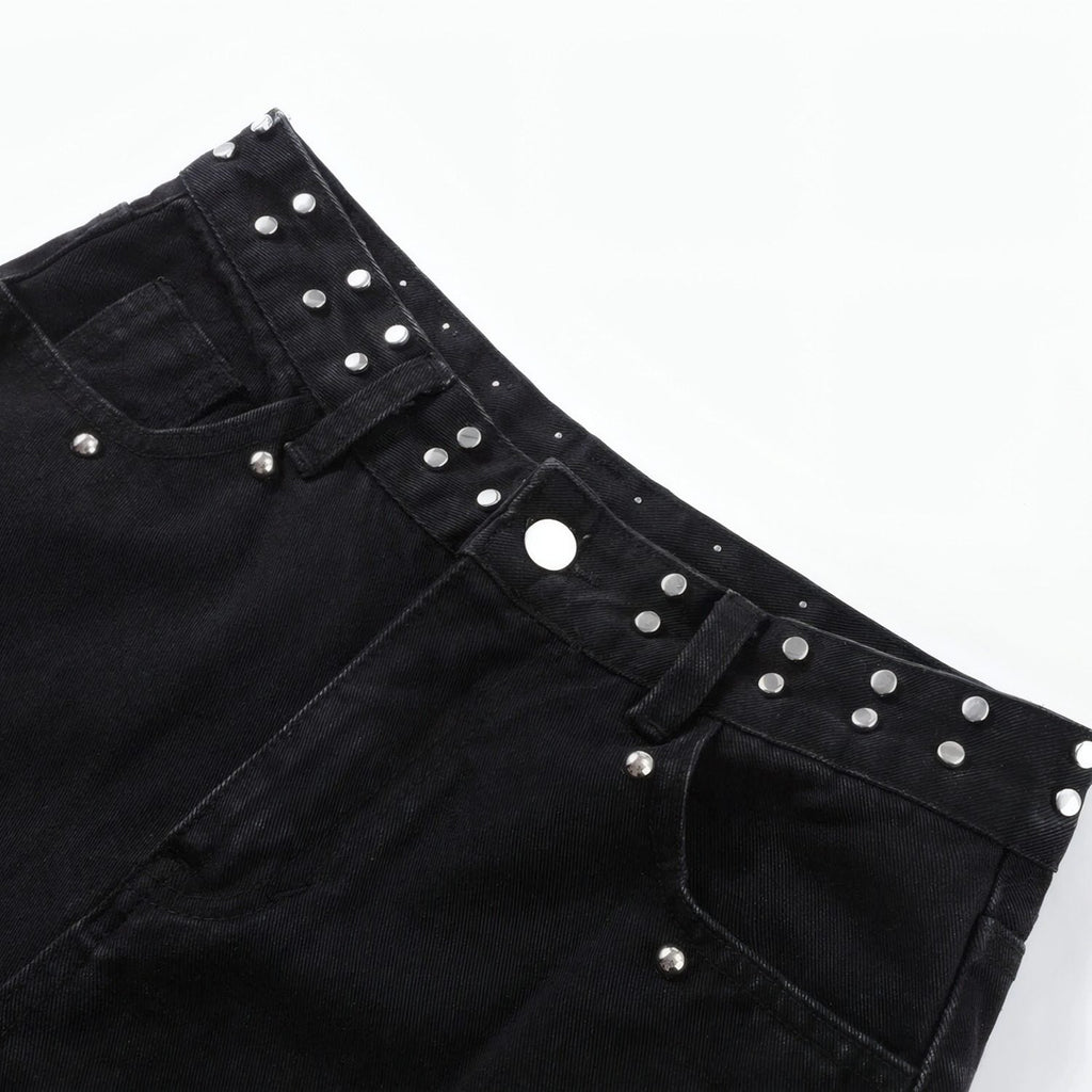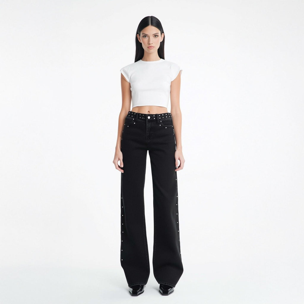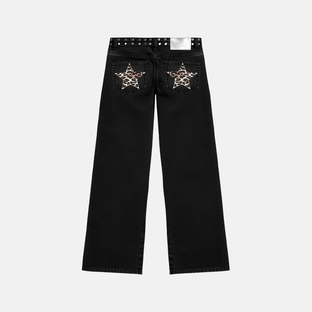 Calça reta de cintura alta com aplicações metálicas ao longo das laterais e cós. Bolsos traseiros com recorte em formato de estrela estampada animal print. Fecho frontal com botão e zíper.