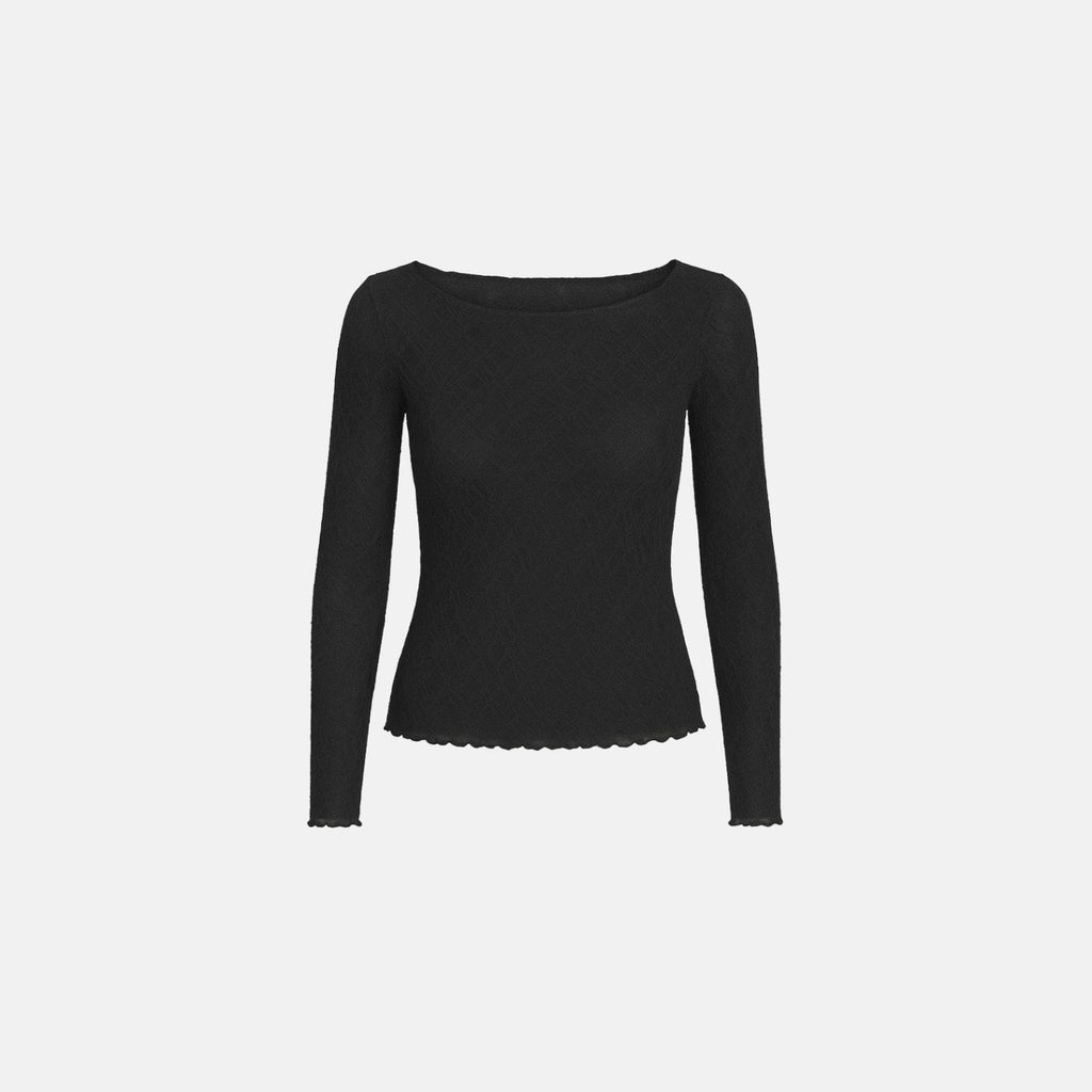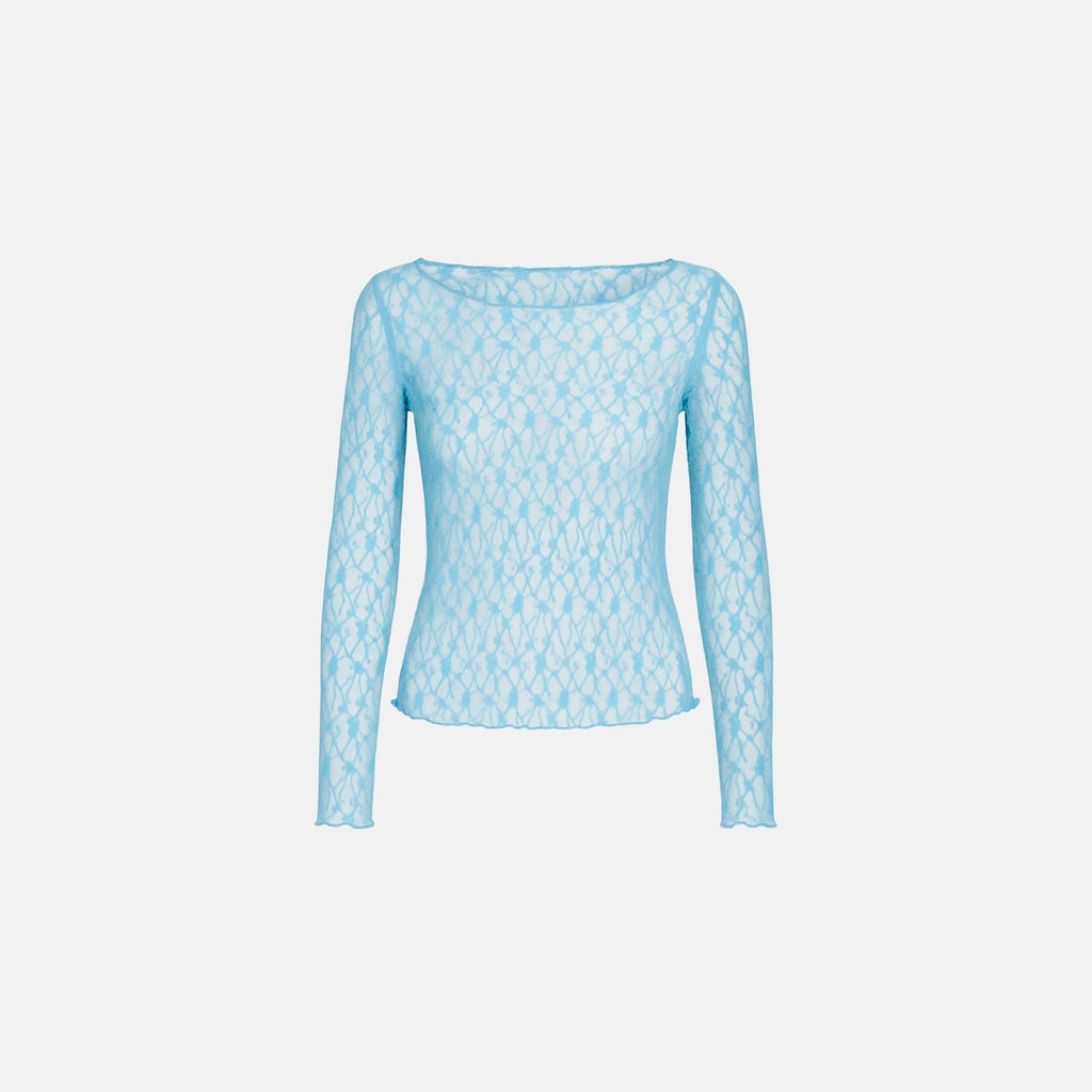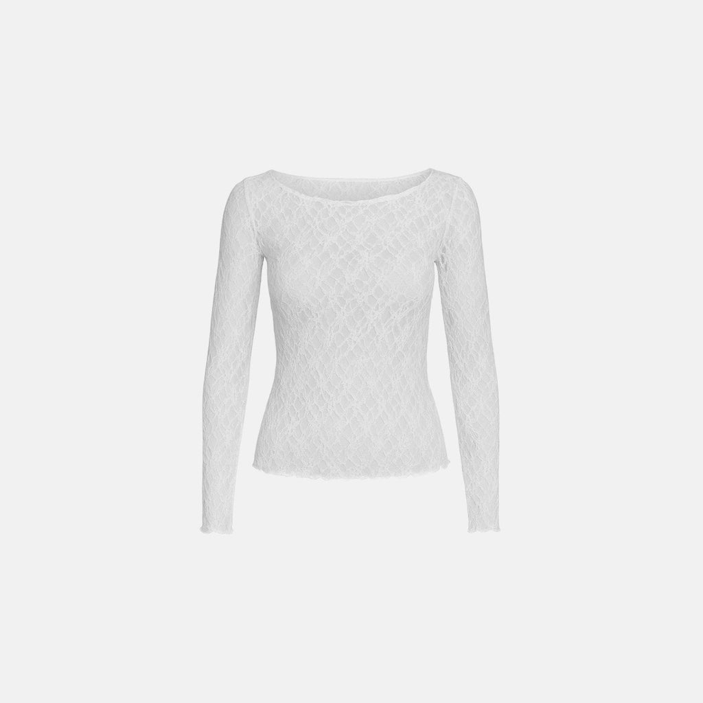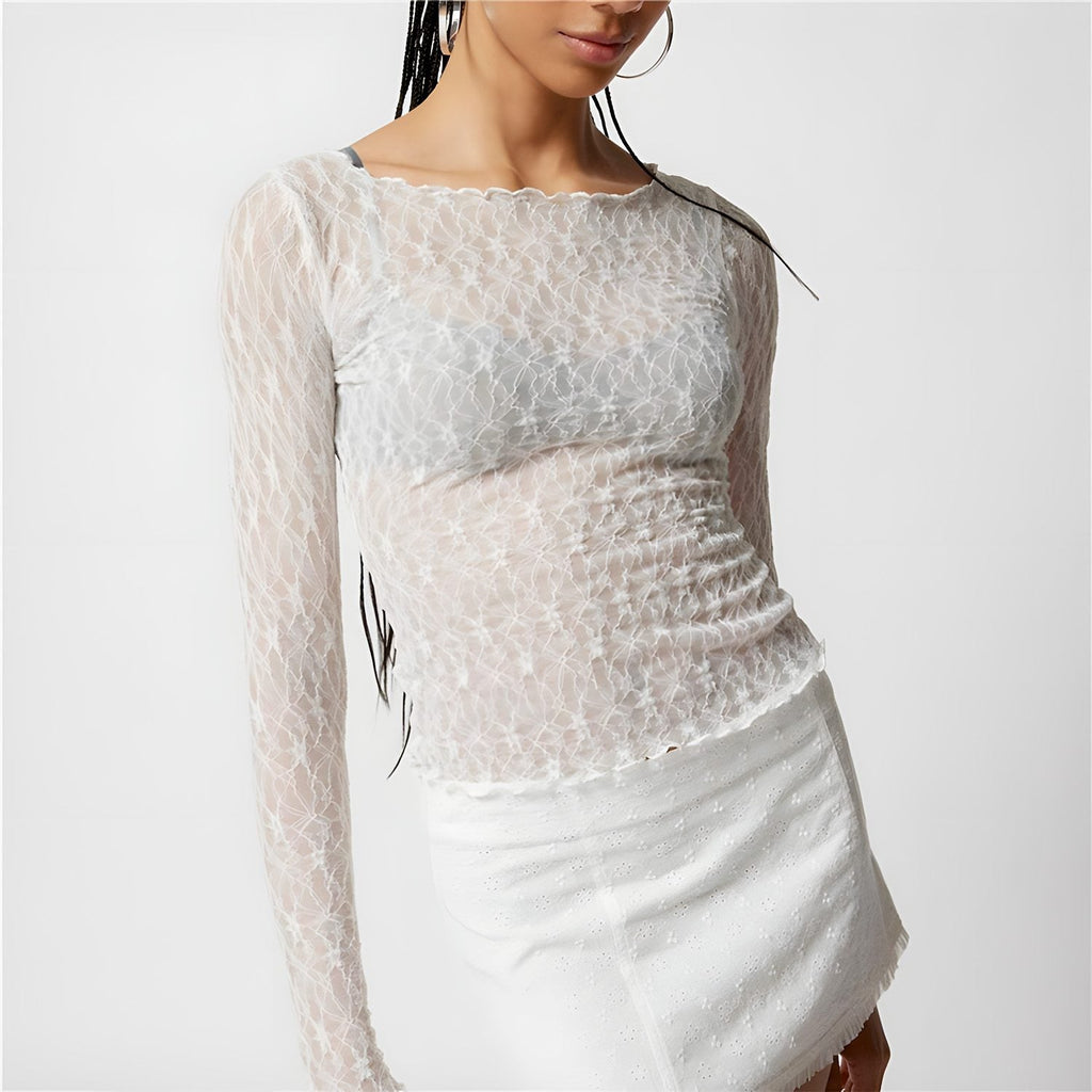 Camisa de manga longa em renda com padrão paisley. Acabamento delicado e punhos recortados. Tecido com textura macia e ajuste confortável.