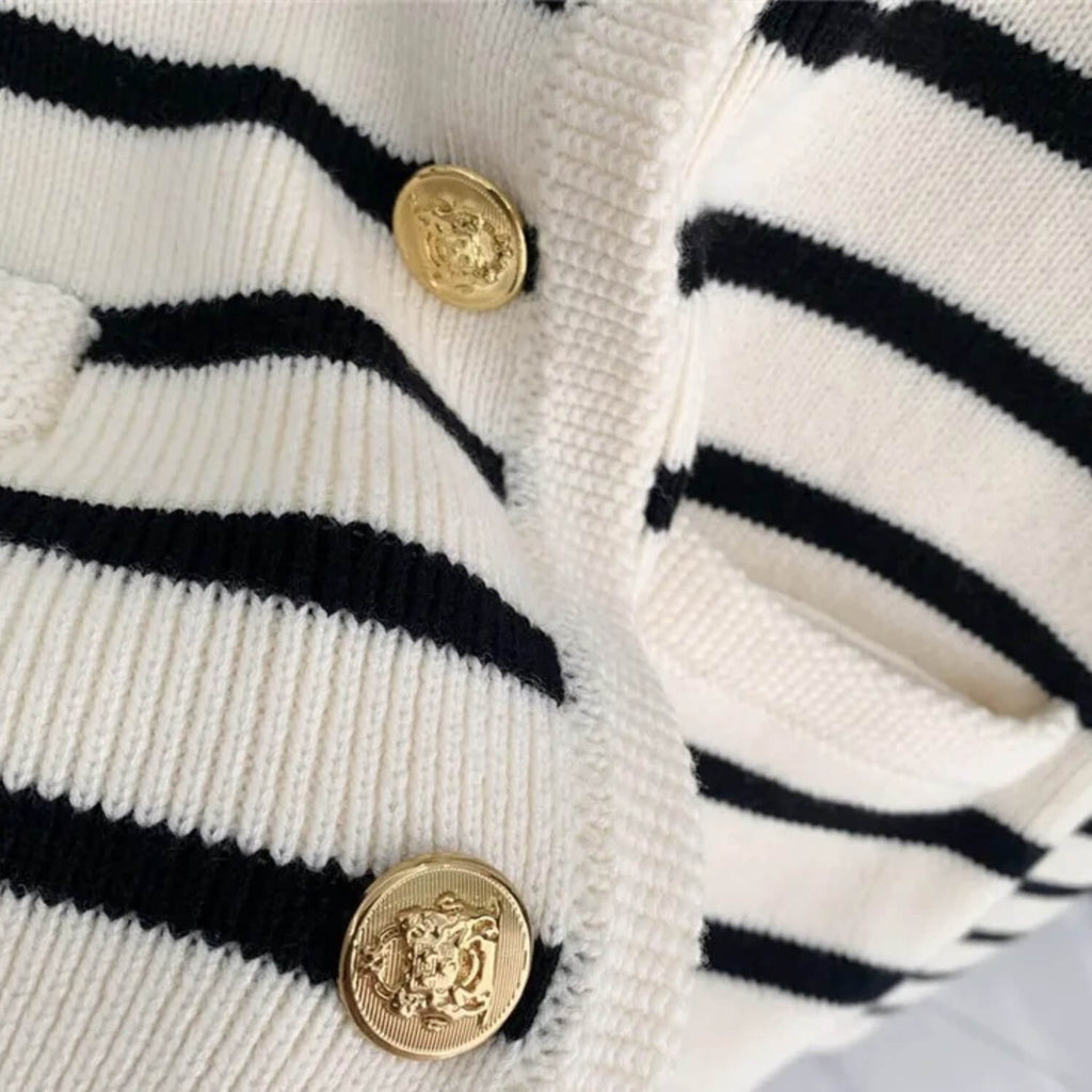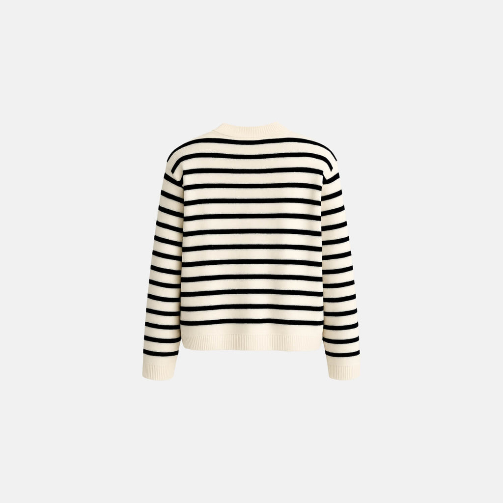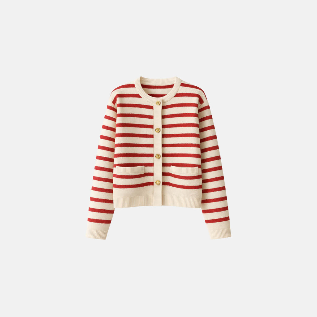 Cardigan listrado com botões dourados em relevo. Modelagem reta com gola careca e barra canelada. Dois bolsos frontais aplicados com acabamento em tricot estruturado.