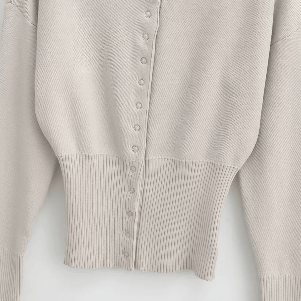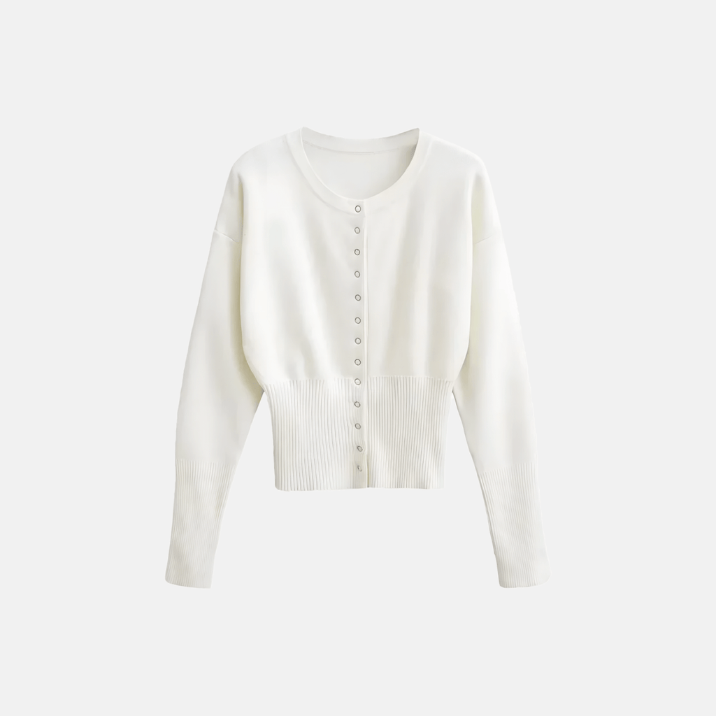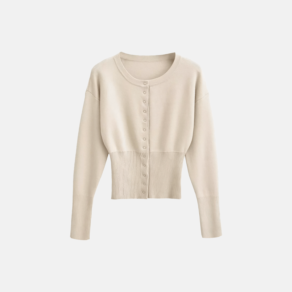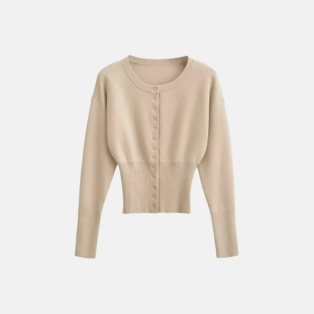 Cardigan de mangas longas e caimento ajustado. Fechamento frontal por botões metálicos. Acabamento canelado na cintura e punhos para ajuste confortável. Gola redonda com corte delicado.