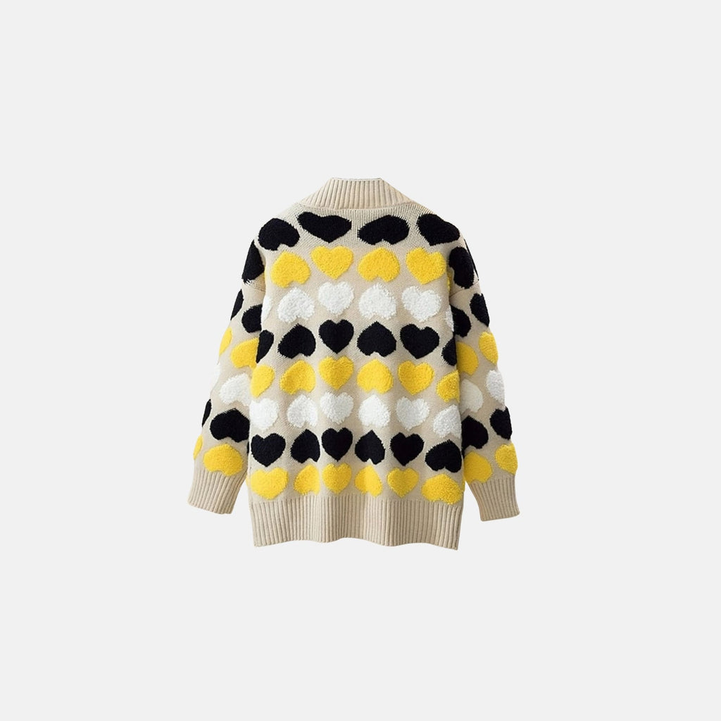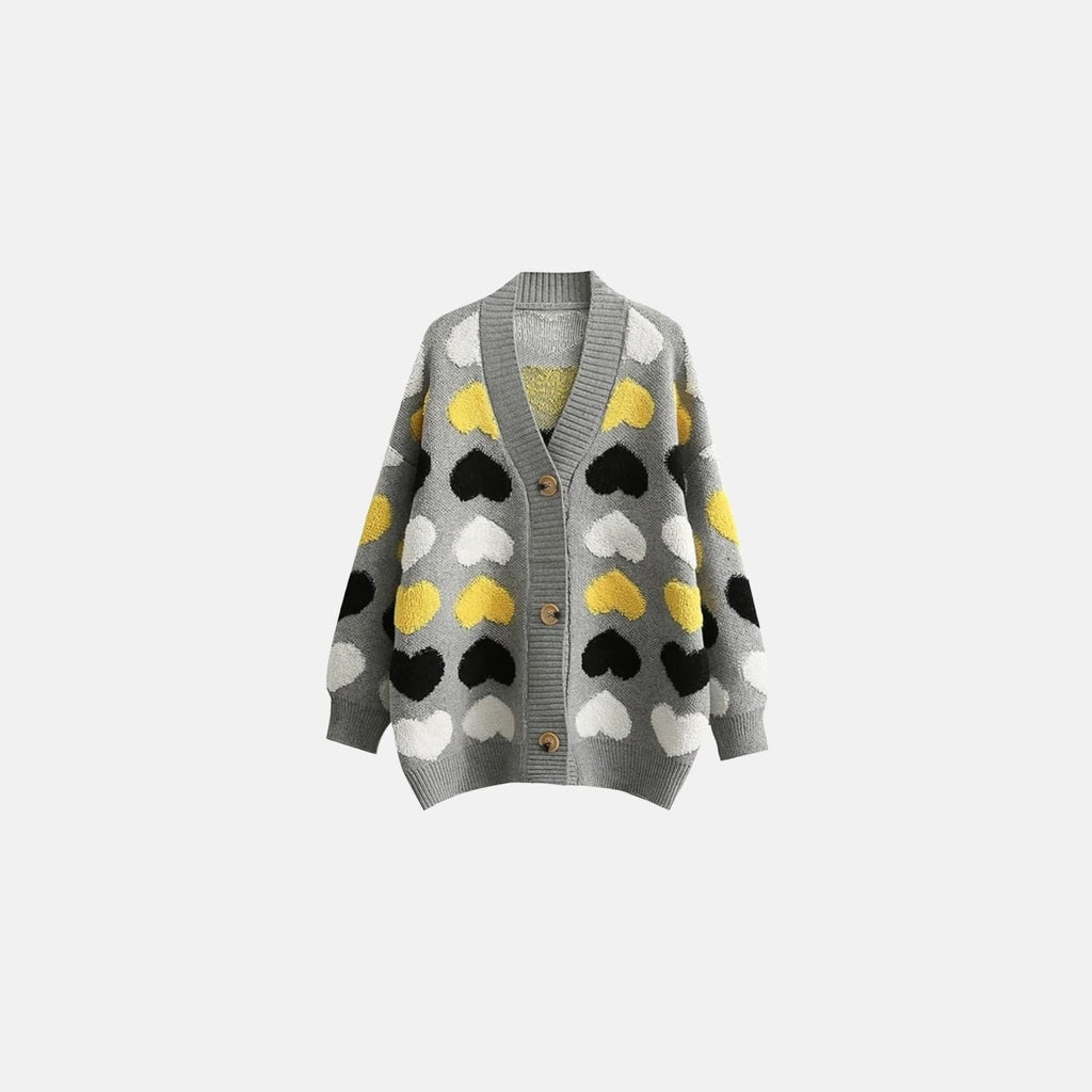 Cardigan oversized com botões frontais e gola V canelada. Textura macia com estampa em alto-relevo de corações coloridos. Punhos e barra em ribana grossa. Acabamento encorpado e confortável.