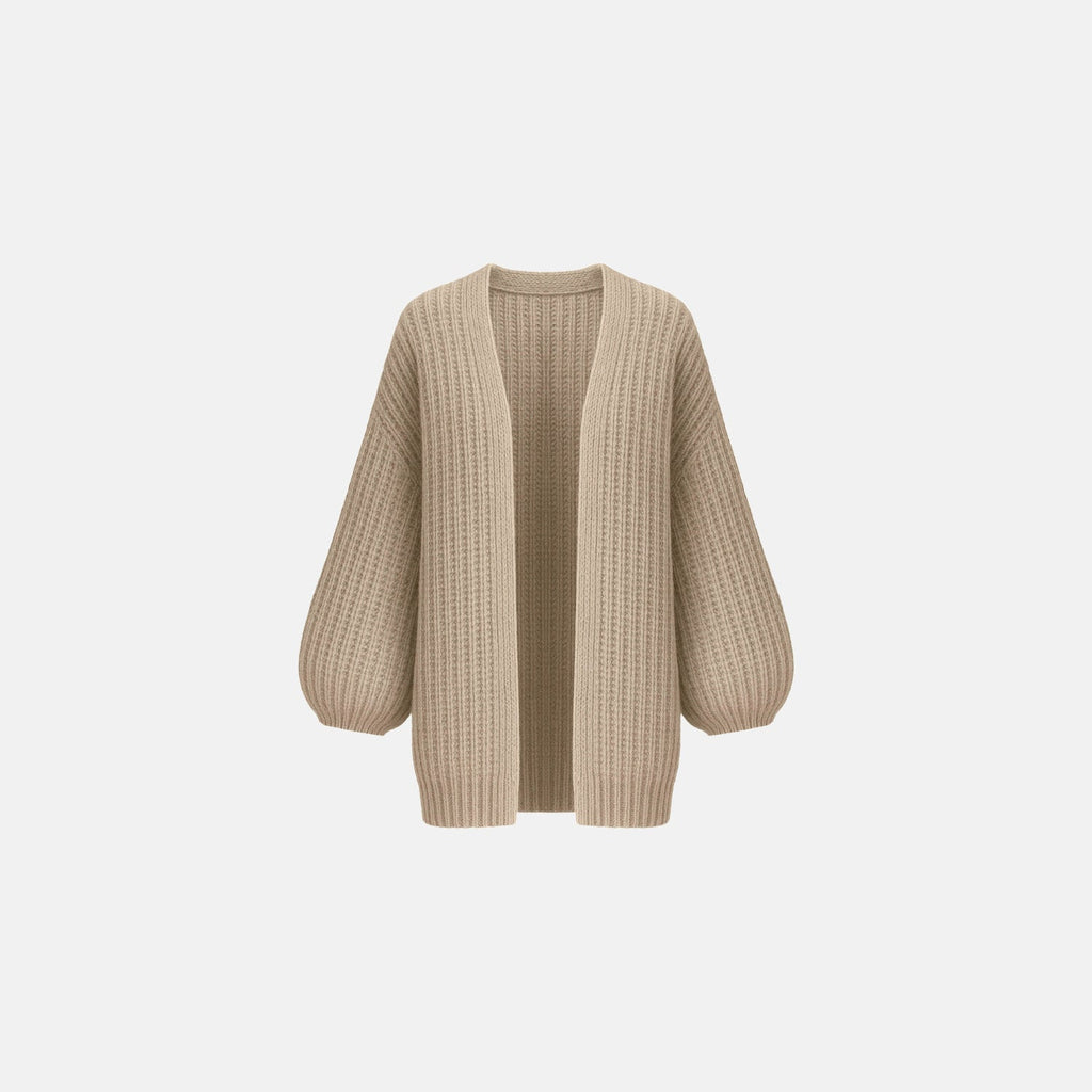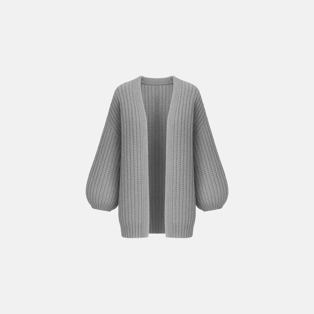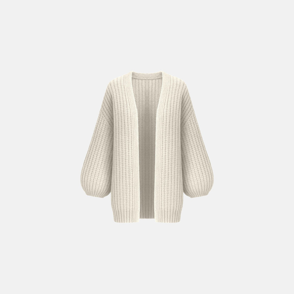 Cardigan oversized em tricot canelado espesso. Modelagem ampla com mangas bufantes e abertura frontal sem botões. Acabamento encorpado com caimento estruturado e textura tridimensional.