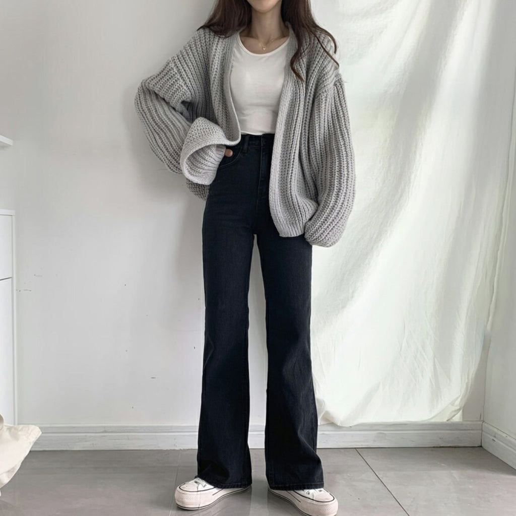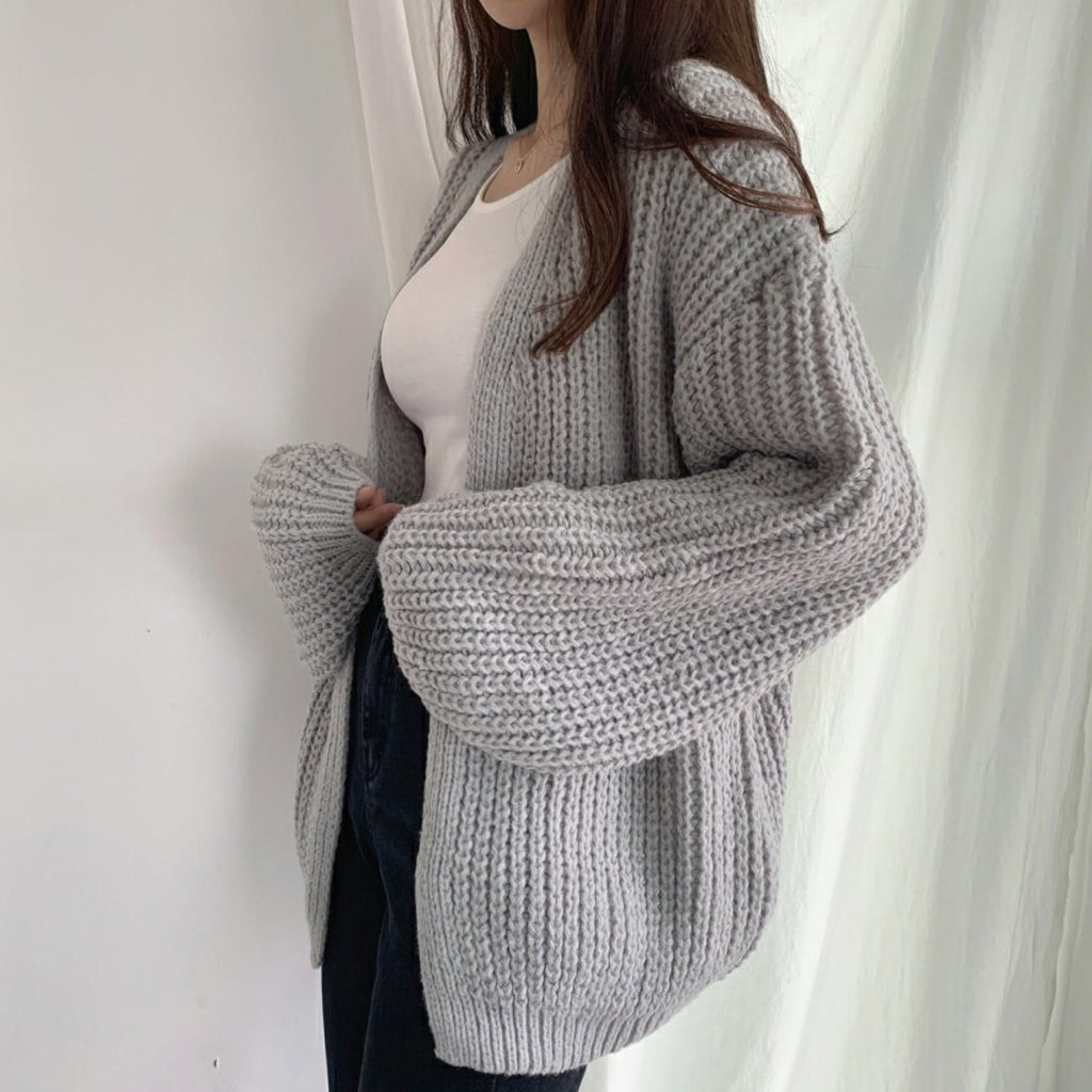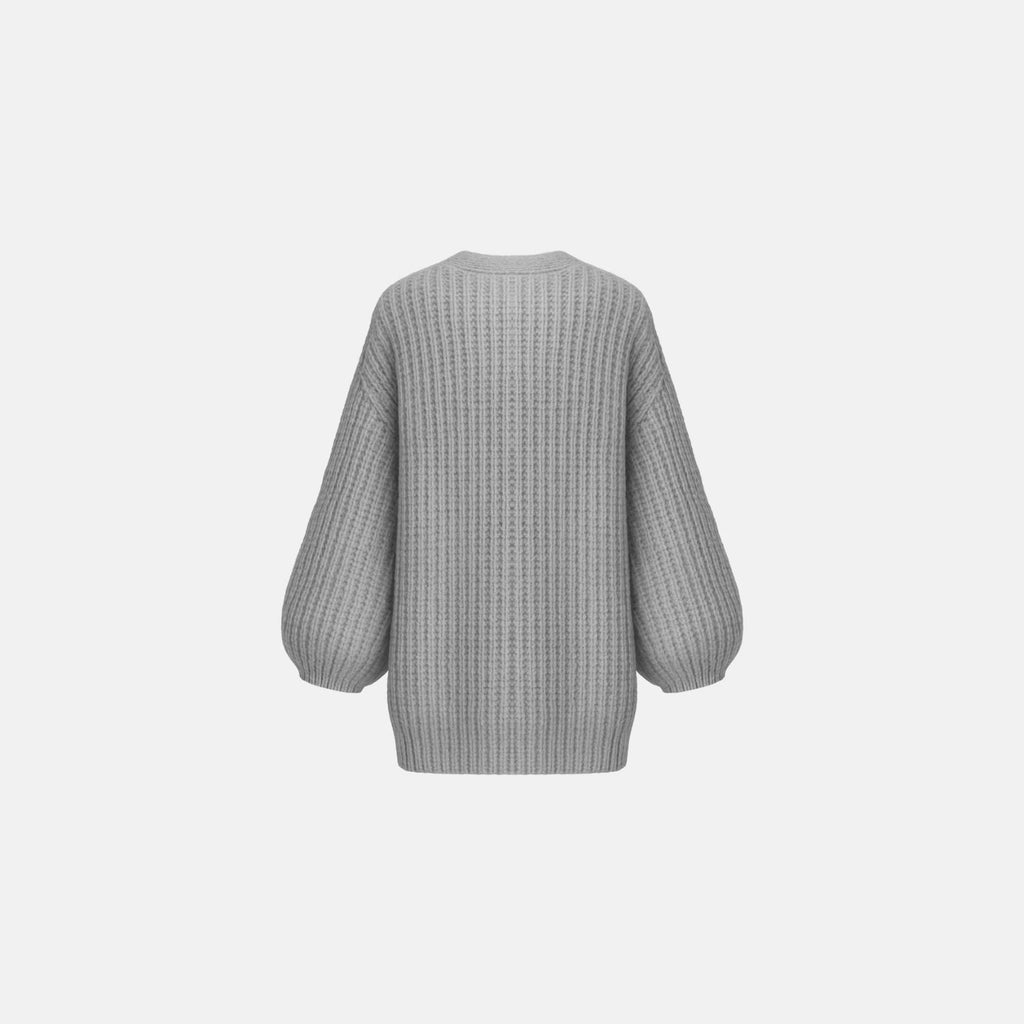 Cardigan oversized em tricot canelado espesso. Modelagem ampla com mangas bufantes e abertura frontal sem botões. Acabamento encorpado com caimento estruturado e textura tridimensional.
