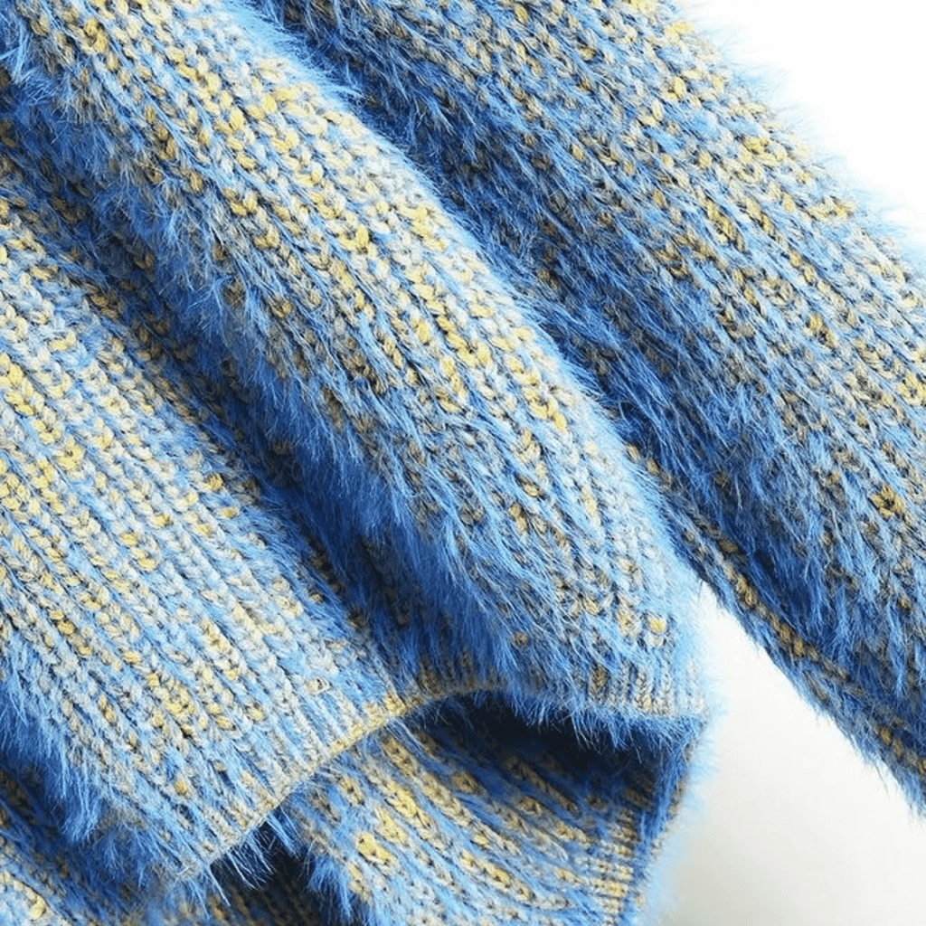 Suéter de tricô com textura felpuda e modelagem solta. Gola careca, mangas longas e barra assimétrica. Acabamento em costura reforçada. Combinação de cores azul e amarelo.