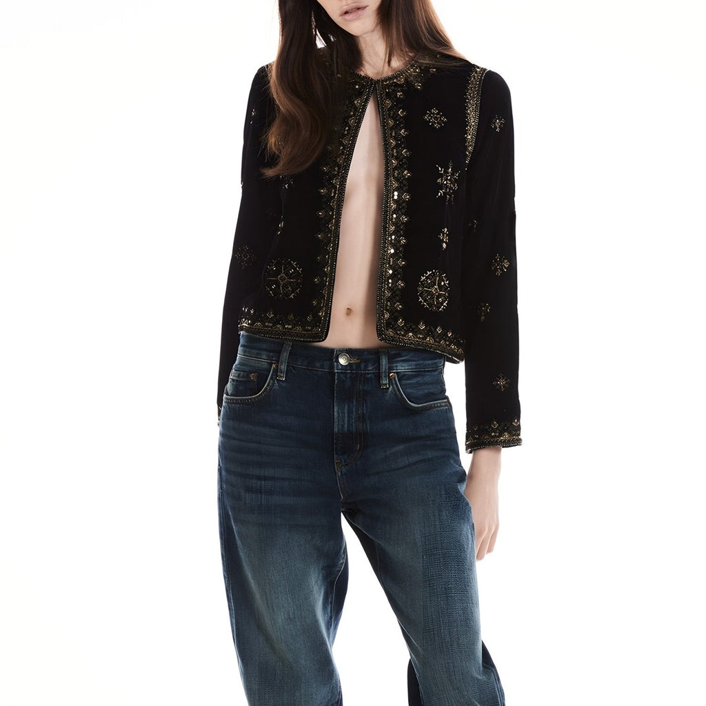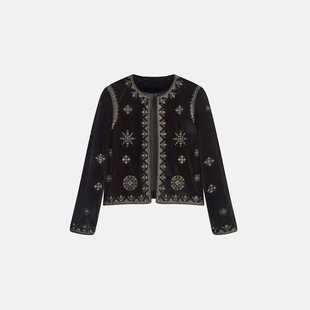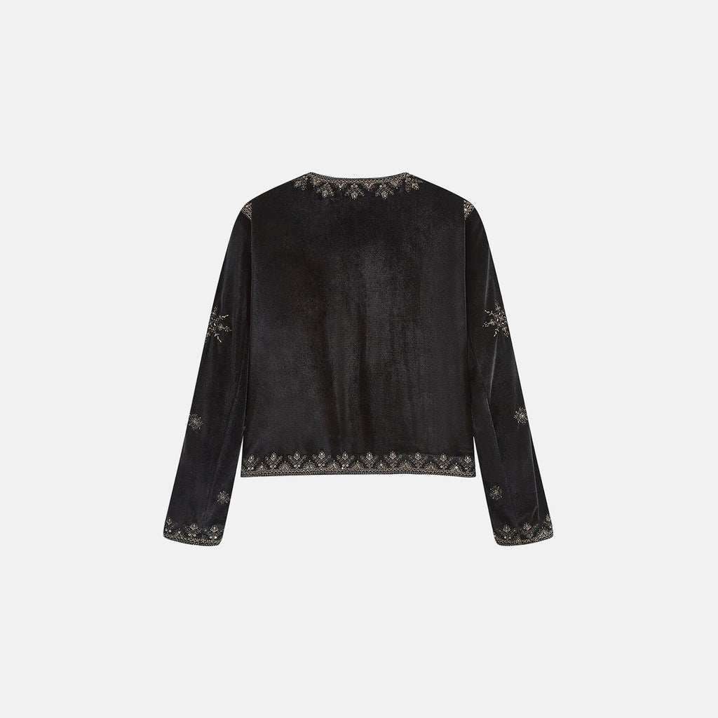 Jaqueta curta com mangas longas e modelagem reta. Tecido de veludo com brilho sutil. Bordados geométricos com aplicações metálicas em toda a peça. Acabamento pespontado e fechamento frontal aberto.