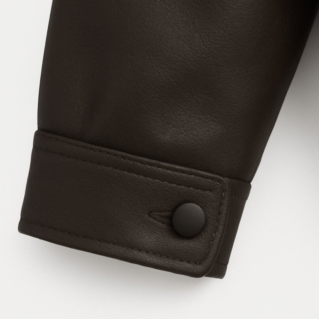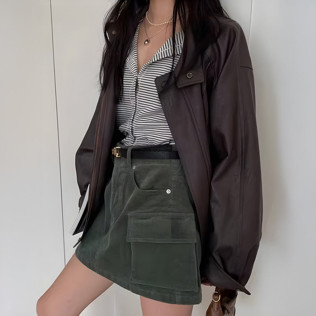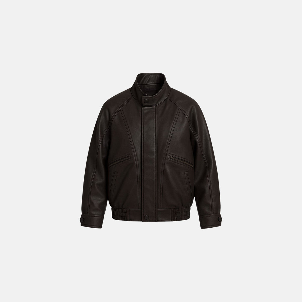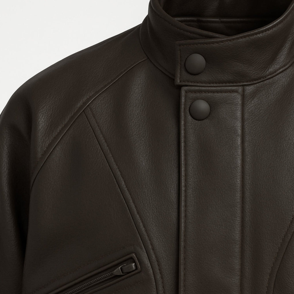 Jaqueta de corte reto com gola alta estruturada. Fecho frontal por zíper e botões de pressão. Bolsos diagonais com zíper. Costuras pespontadas em linhas geométricas. Punhos e barra com abotoamento ajustável.