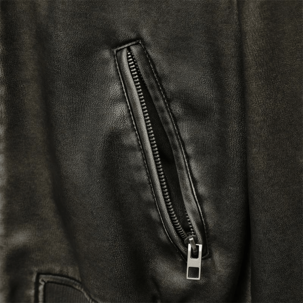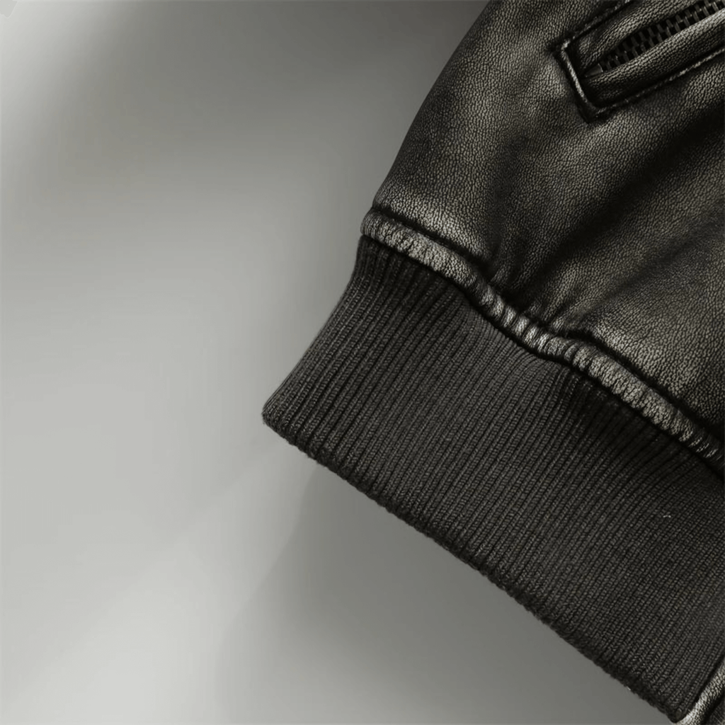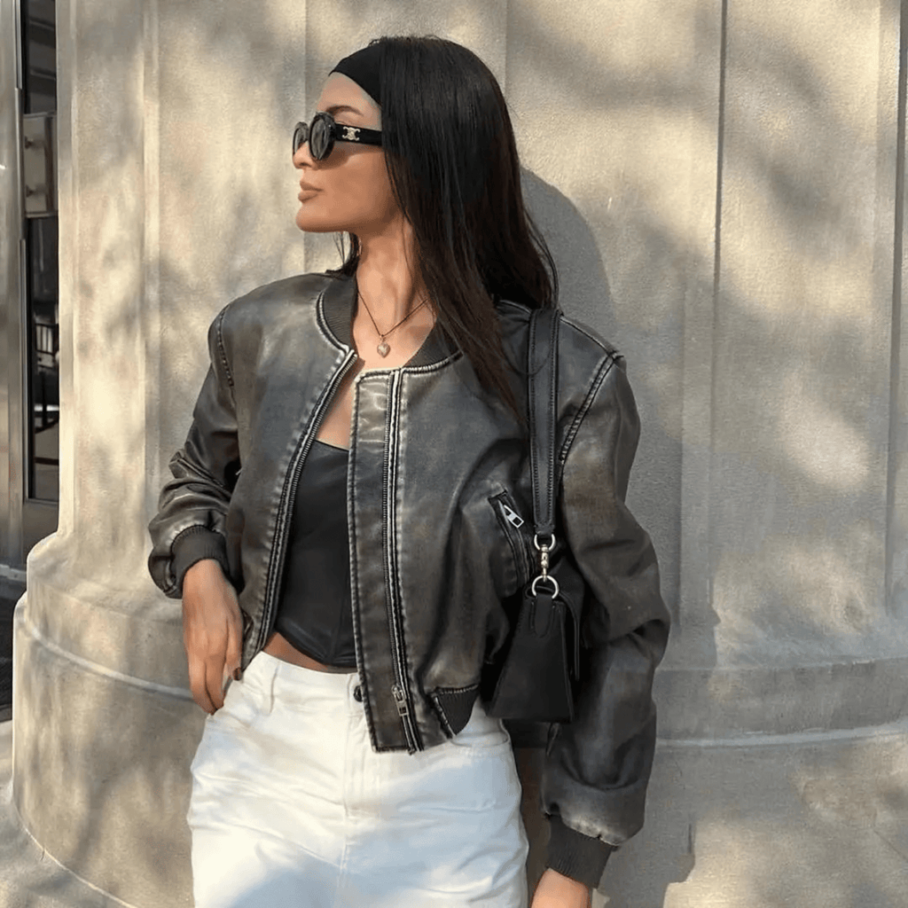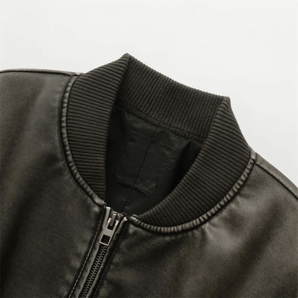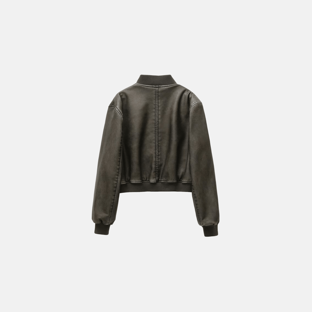 Jaqueta curta em couro sintético com zíper frontal e bolsos laterais. Gola alta e punhos ajustados em malha canelada. Costuras aparentes contrastantes.