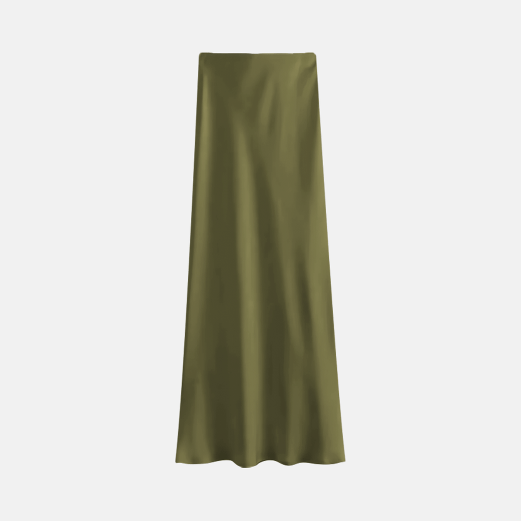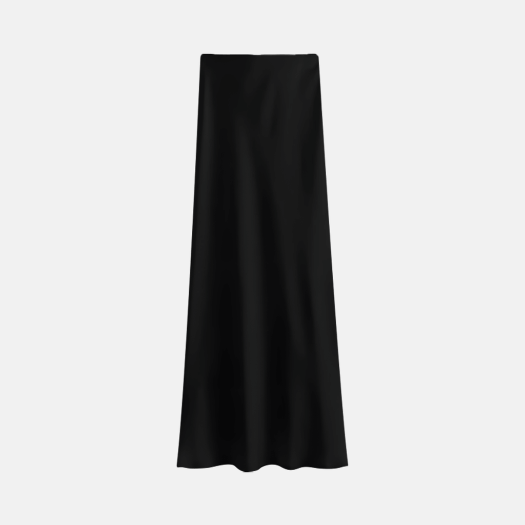Saia midi de modelagem evasê com cintura alta e corte minimalista. Tecido acetinado com brilho sutil e caimento fluido. Barra com acabamento duplo e costura delicada.