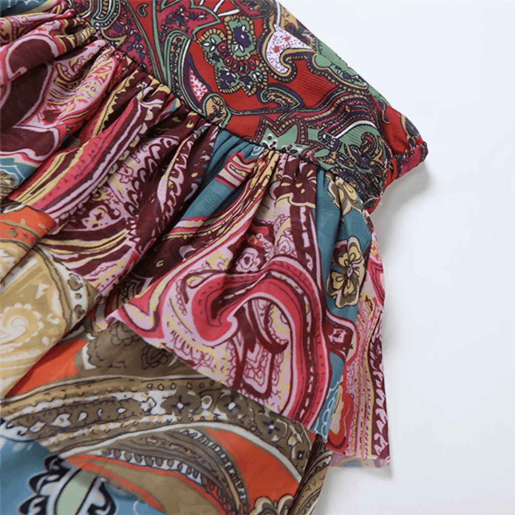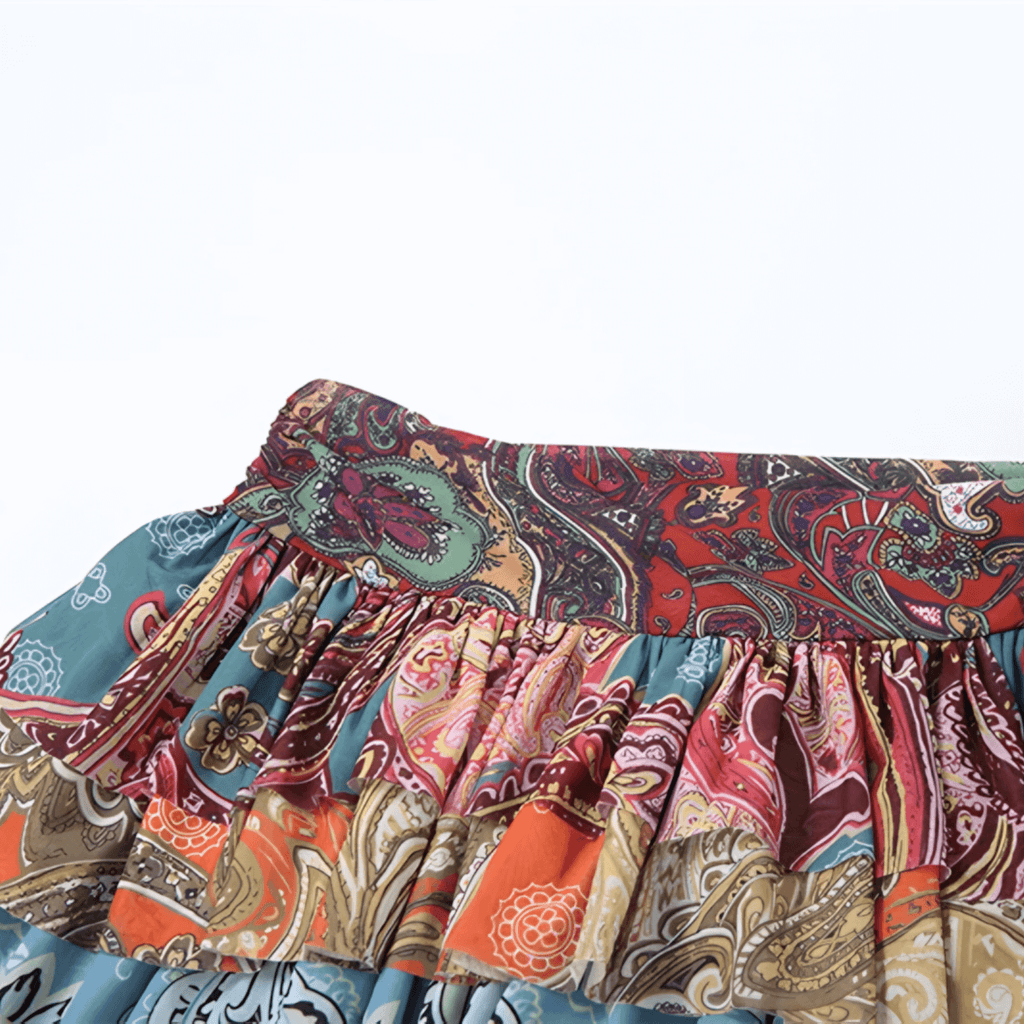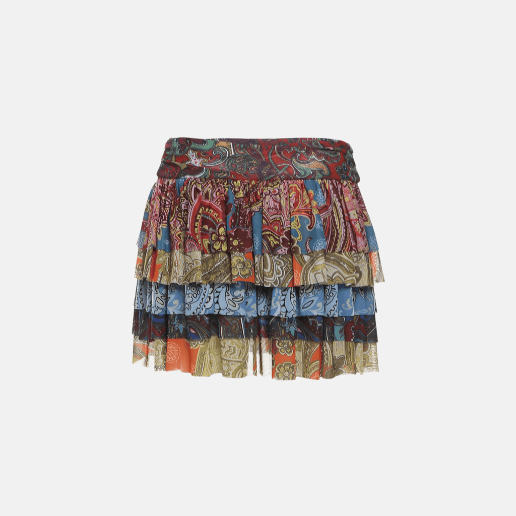 Saia curta com camadas Estampa paisley multicolorida. Cintura alta com cós elástico e acabamento impecável. Tecido leve e fluido. Costuras reforçadas para maior durabilidade.