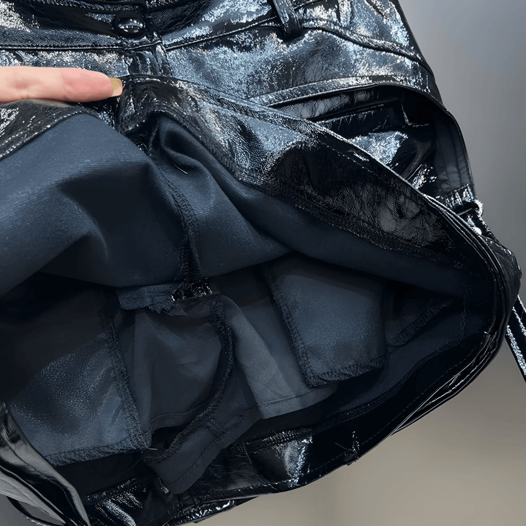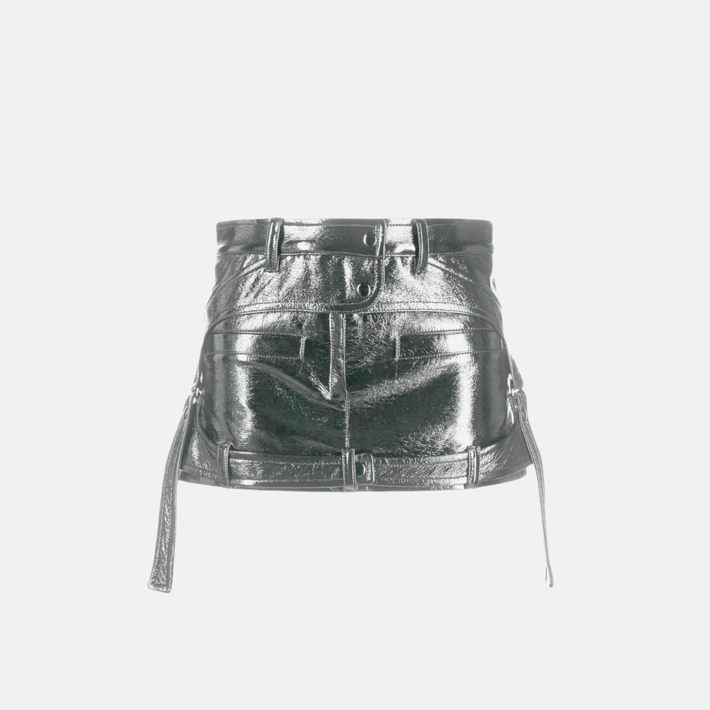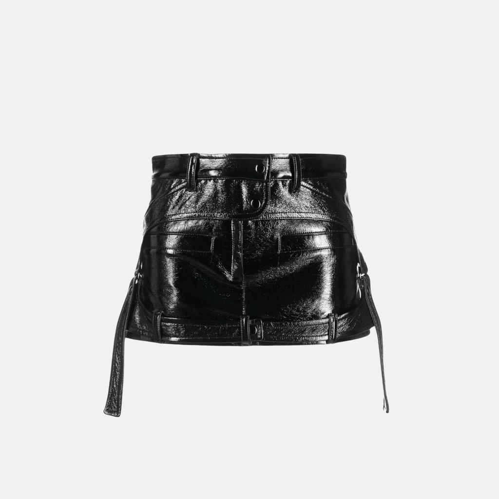 Saia mini de cintura alta com acabamento em vinil brilhante. Bolsos frontais decorativos e detalhe de cinto ajustável nas laterais. Fecho frontal com botão metálico e zíper oculto.