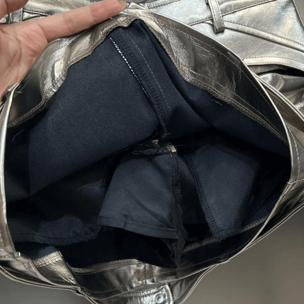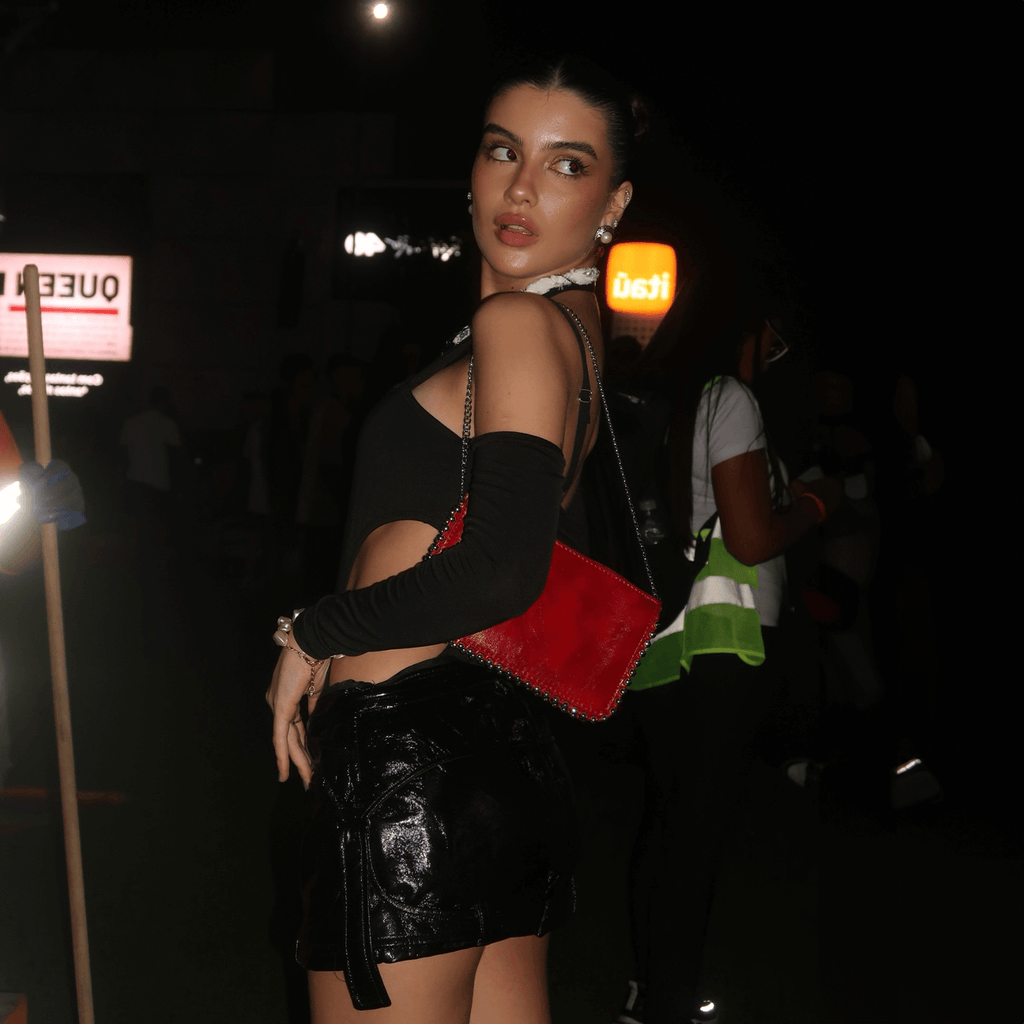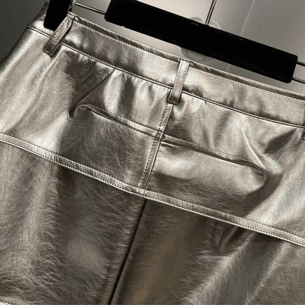 Saia mini de cintura alta com acabamento em vinil brilhante. Bolsos frontais decorativos e detalhe de cinto ajustável nas laterais. Fecho frontal com botão metálico e zíper oculto.
